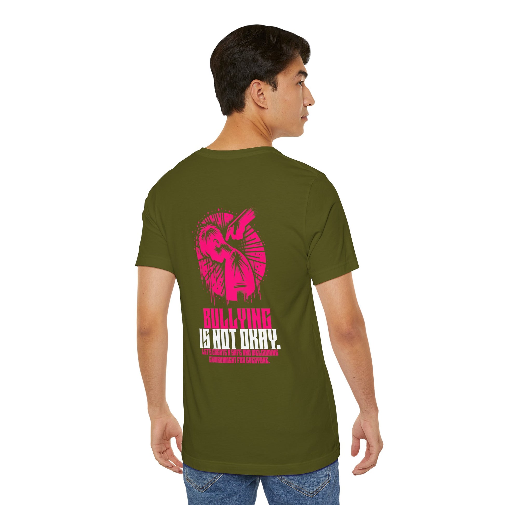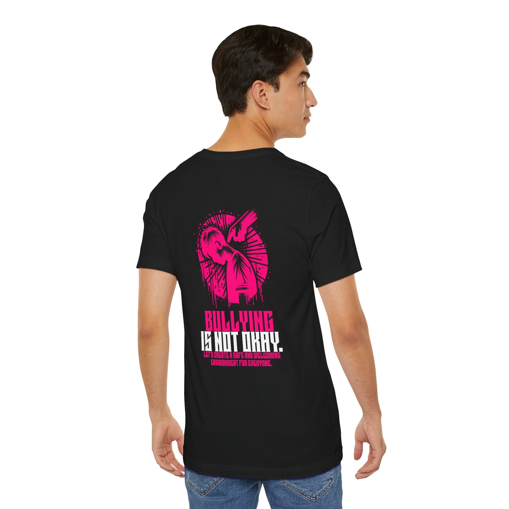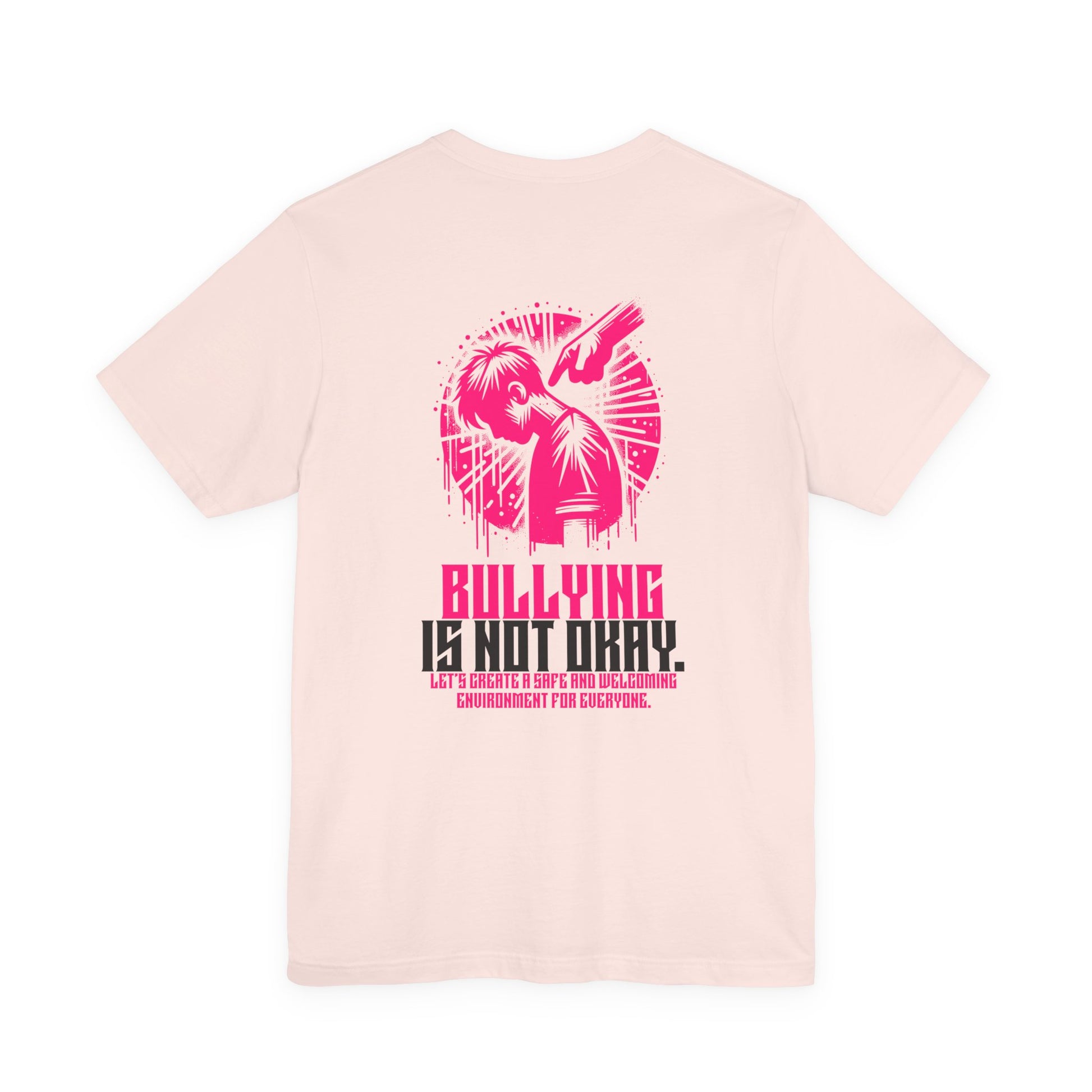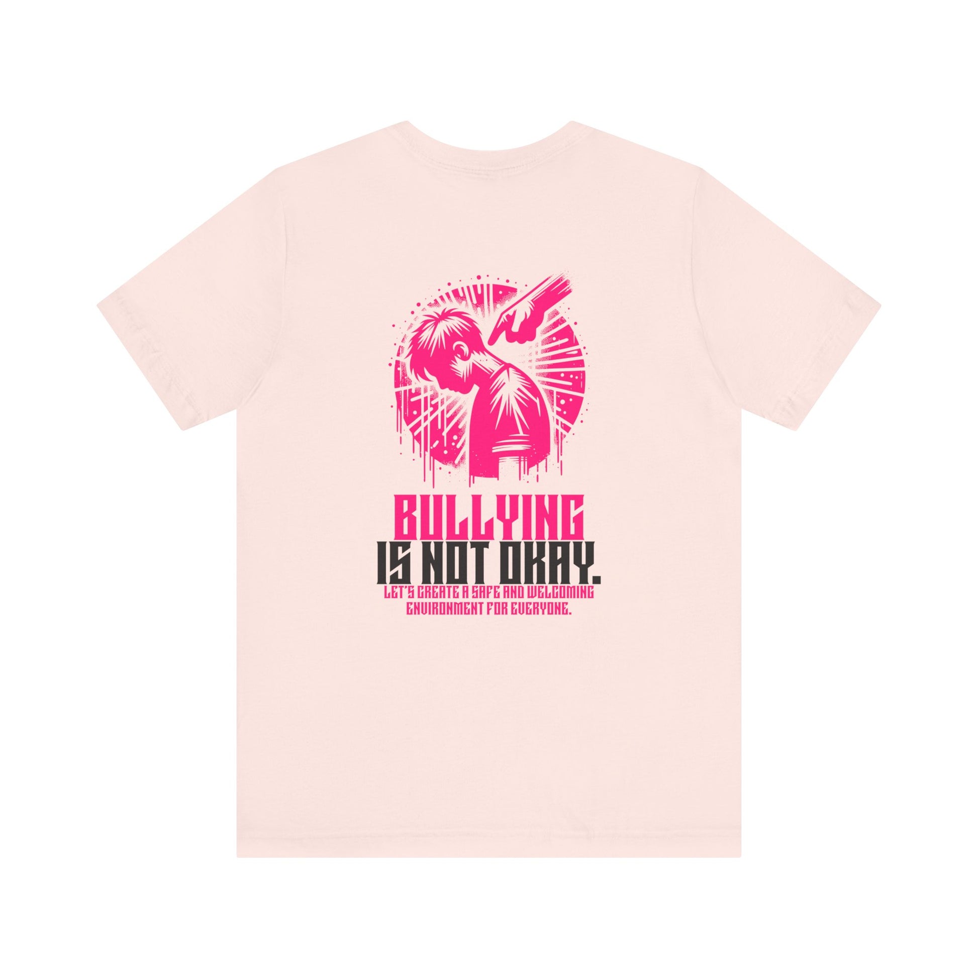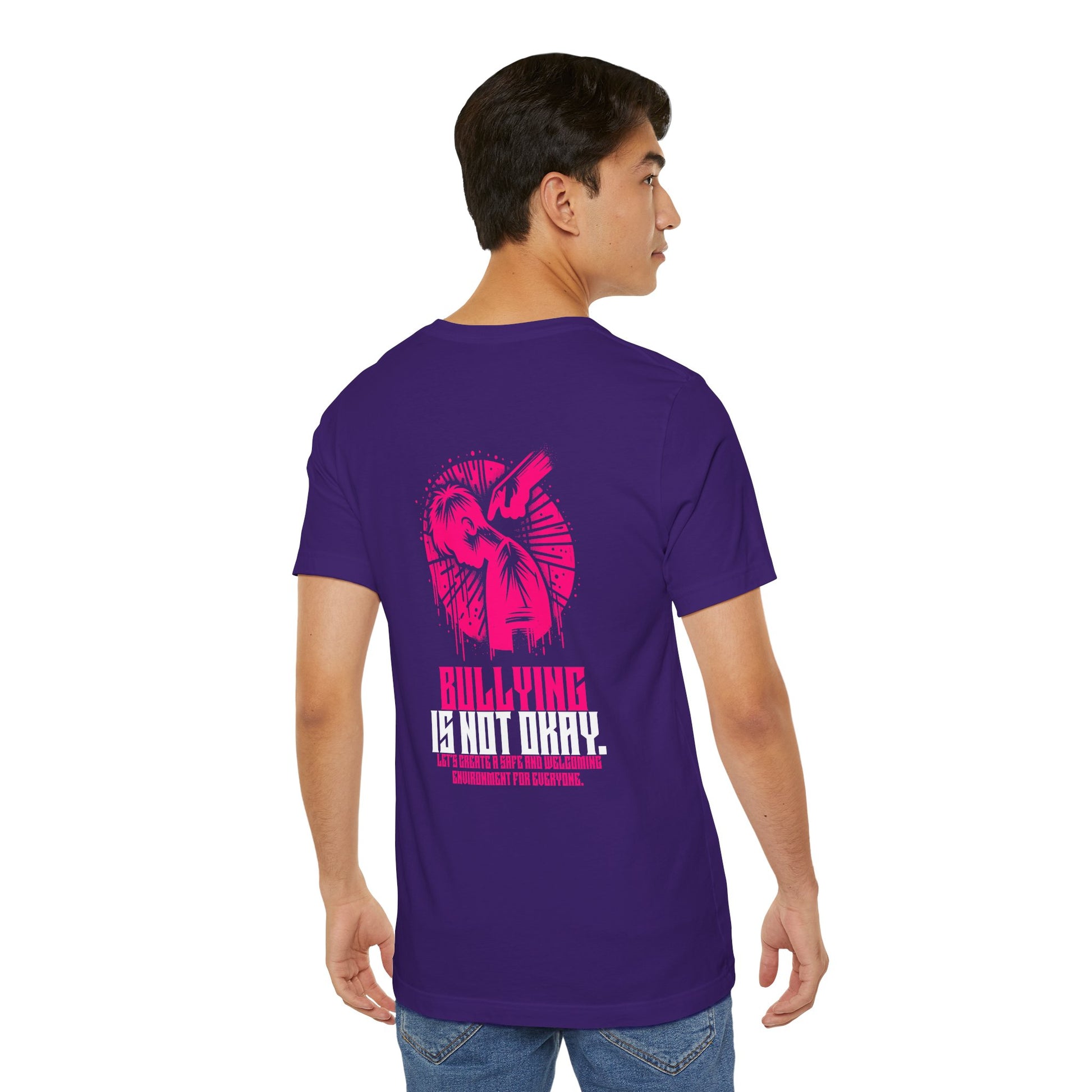 Stand against bullying with this unisex T-shirt designed to spread a powerful message. Made for comfort and everyday wear, it encourages kindness and respect in all environments. Perfect for anyone who wants to promote a positive, inclusive community while enjoying a soft, durable fit. Wear your support proudly and help make a difference.