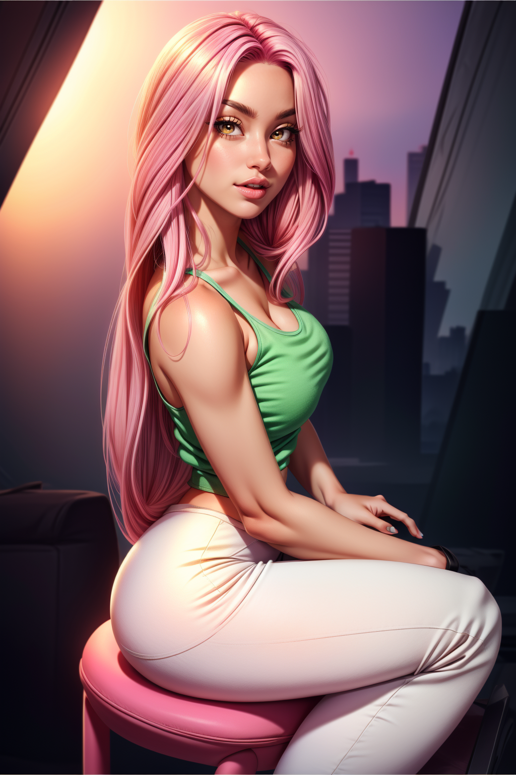 Elevate your collection with this stunning AI-generated art piece featuring a vibrant woman basking in the glow of a bustling cityscape. Her captivating pink hair and radiant expression exude confidence and allure. Perfect for modern decor or digital inspiration, this masterpiece brings life to any space. Own this striking visual now!