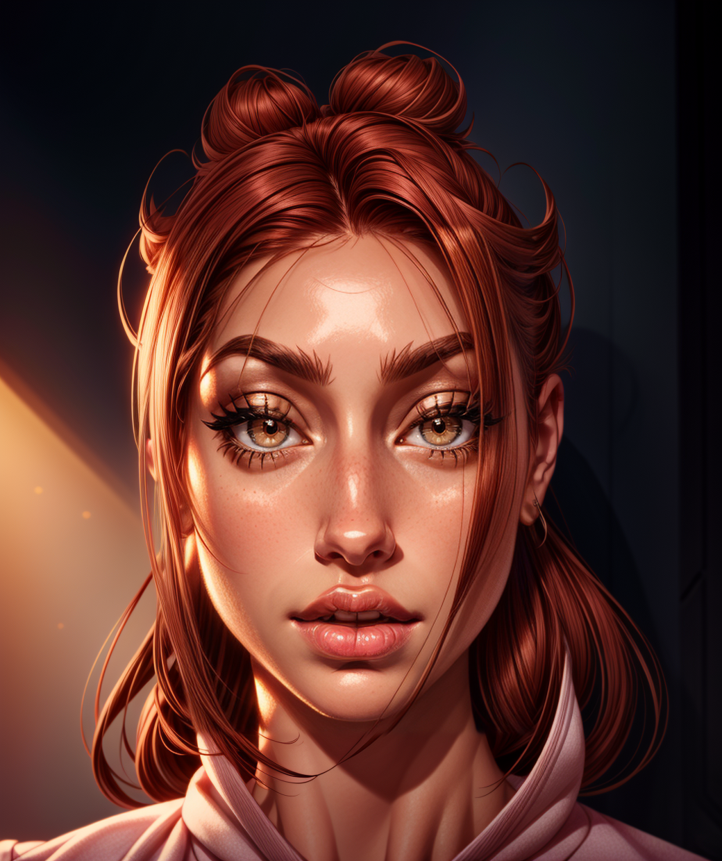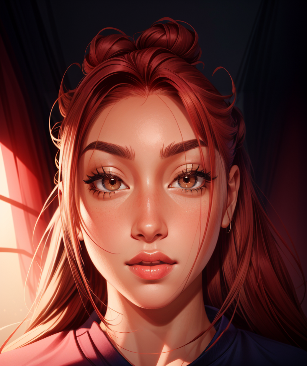 Brighten your day with this radiant AI-generated art piece, featuring a woman with luscious, delicately styled red locks and piercing eyes. This stunning creation is the perfect gift or decor to uplift any room. Let her beauty grace your life today!