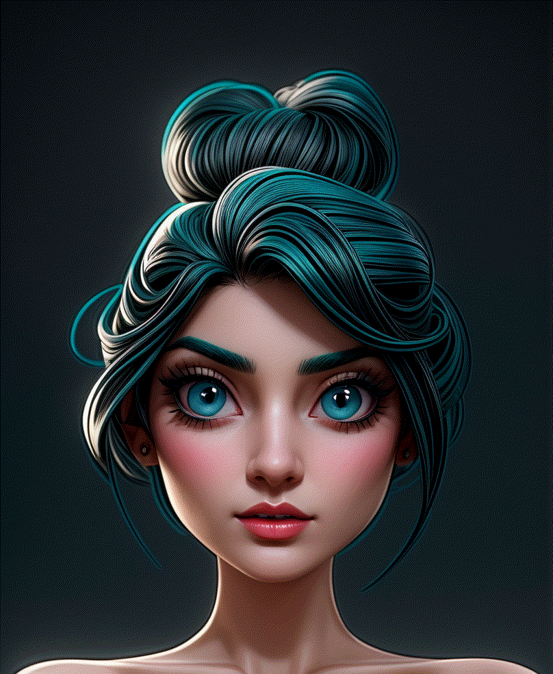 Meet the enigmatic figure in this dark and striking digital portrait, part of the "Character & Human Model 5 - " collection. With piercing blue eyes that seem to look right through you, and hair styled in an elaborate updo tinged with vibrant teal highlights, this "Character & Human Model 5 - " character exudes mystery and allure. Her matte black lipstick and subtle blush create a captivating contrast, enhanced by the moody lighting, adding to the "Character & Human Model 5 - " appeal. The Character & Human Model 5 is ideal for those who appreciate dark-themed digital art with high detail and character depth, especially in the "Character & Human Model 5 - " category. Download this unique "Character & Human Model 5 - " portrait from DigitalizedArts.com for your collection or creative inspiration.