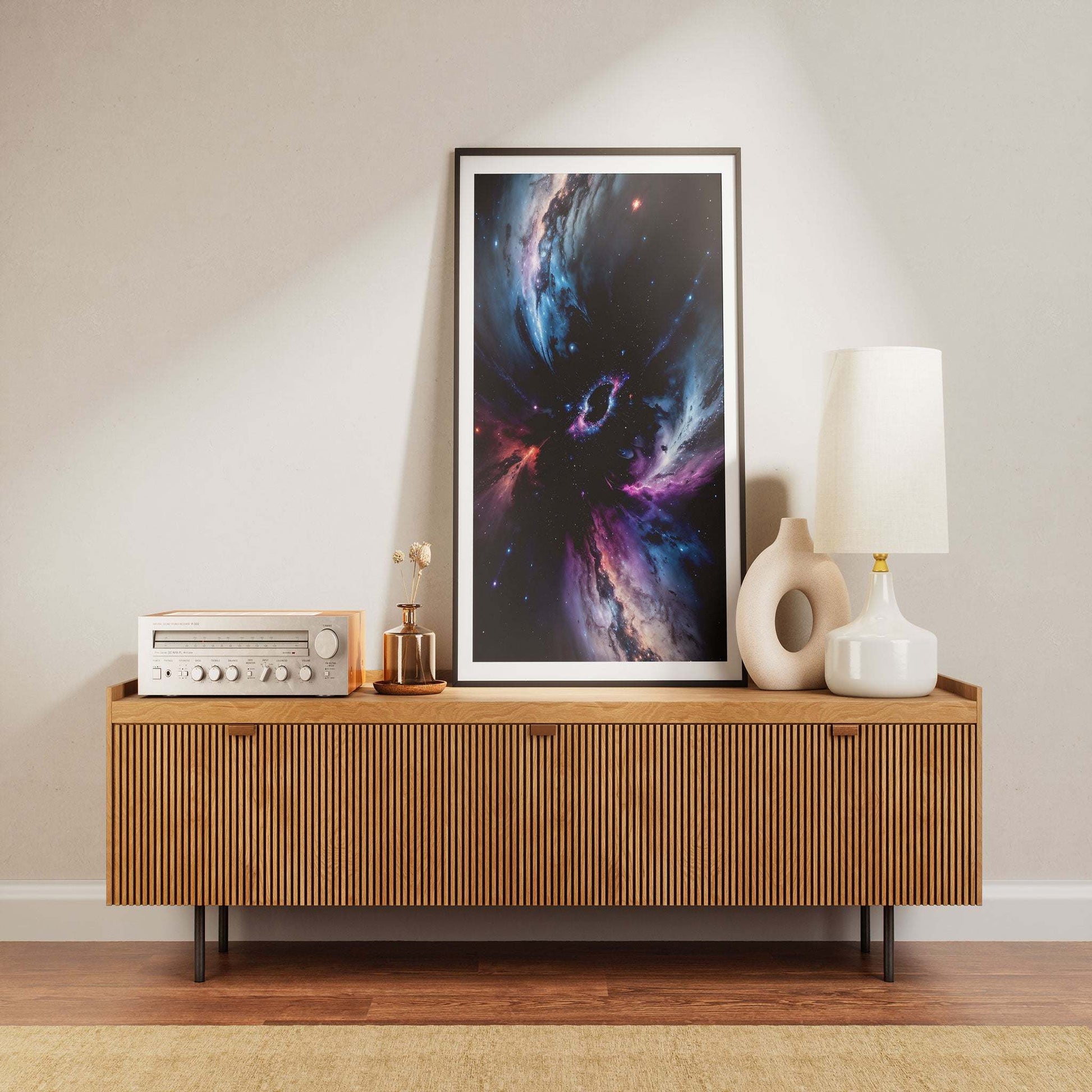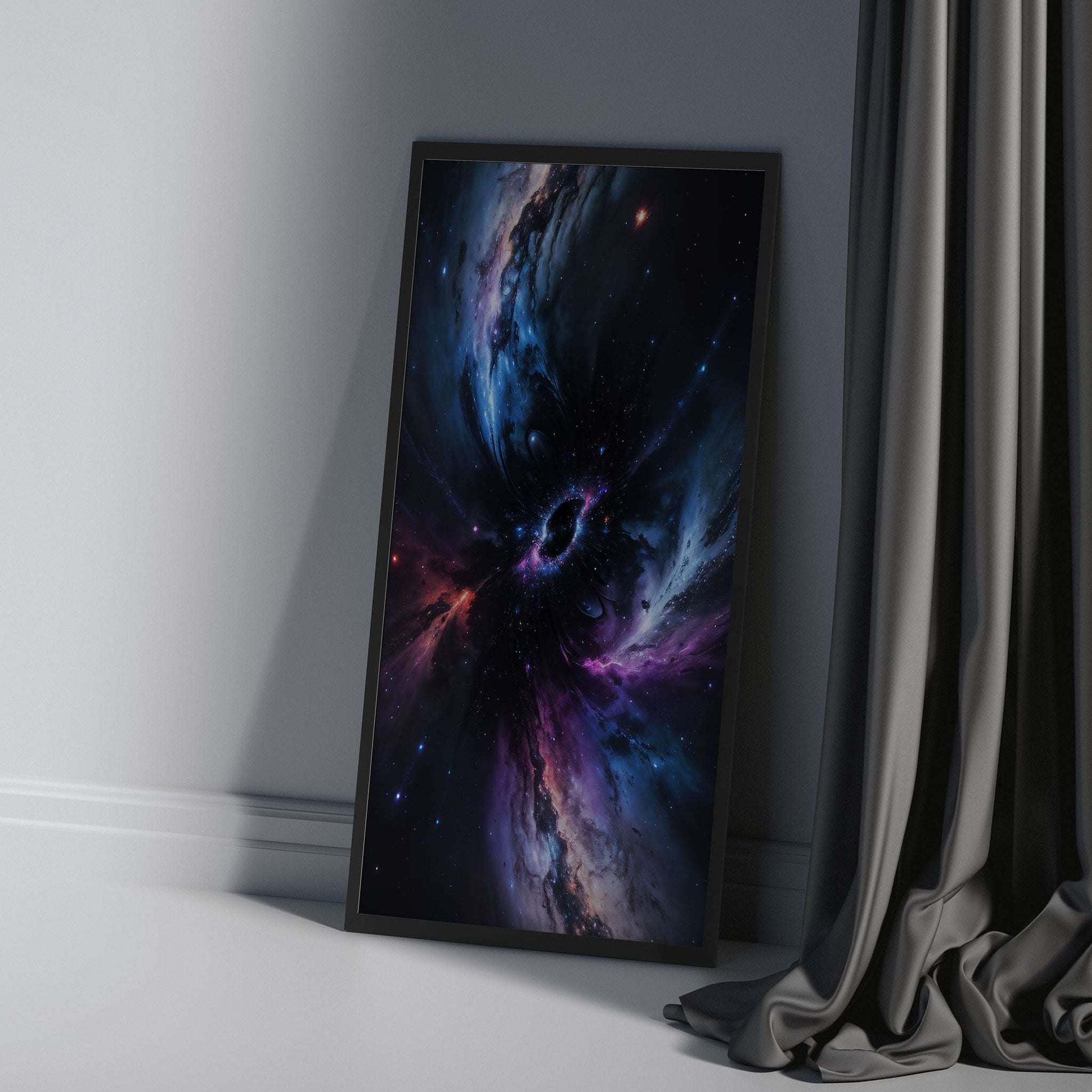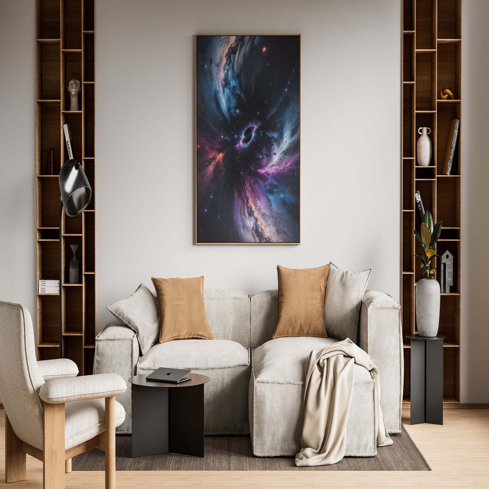 Two opposing galactic forces merge in a collision of fiery orange and tranquil azure. Sparks of starlight punctuate the serene darkness, telling the story of creation and destruction in perfect harmony.