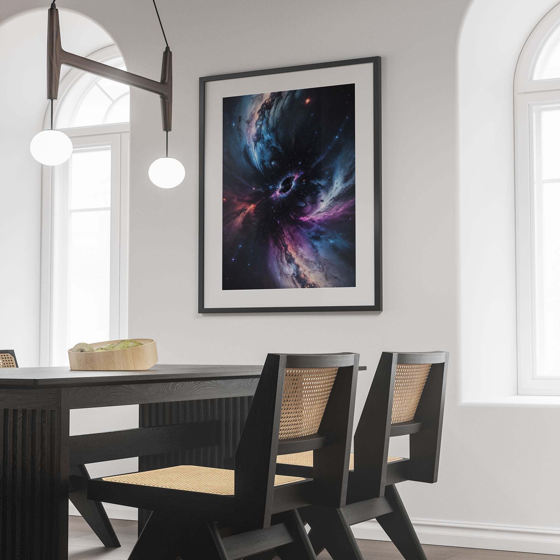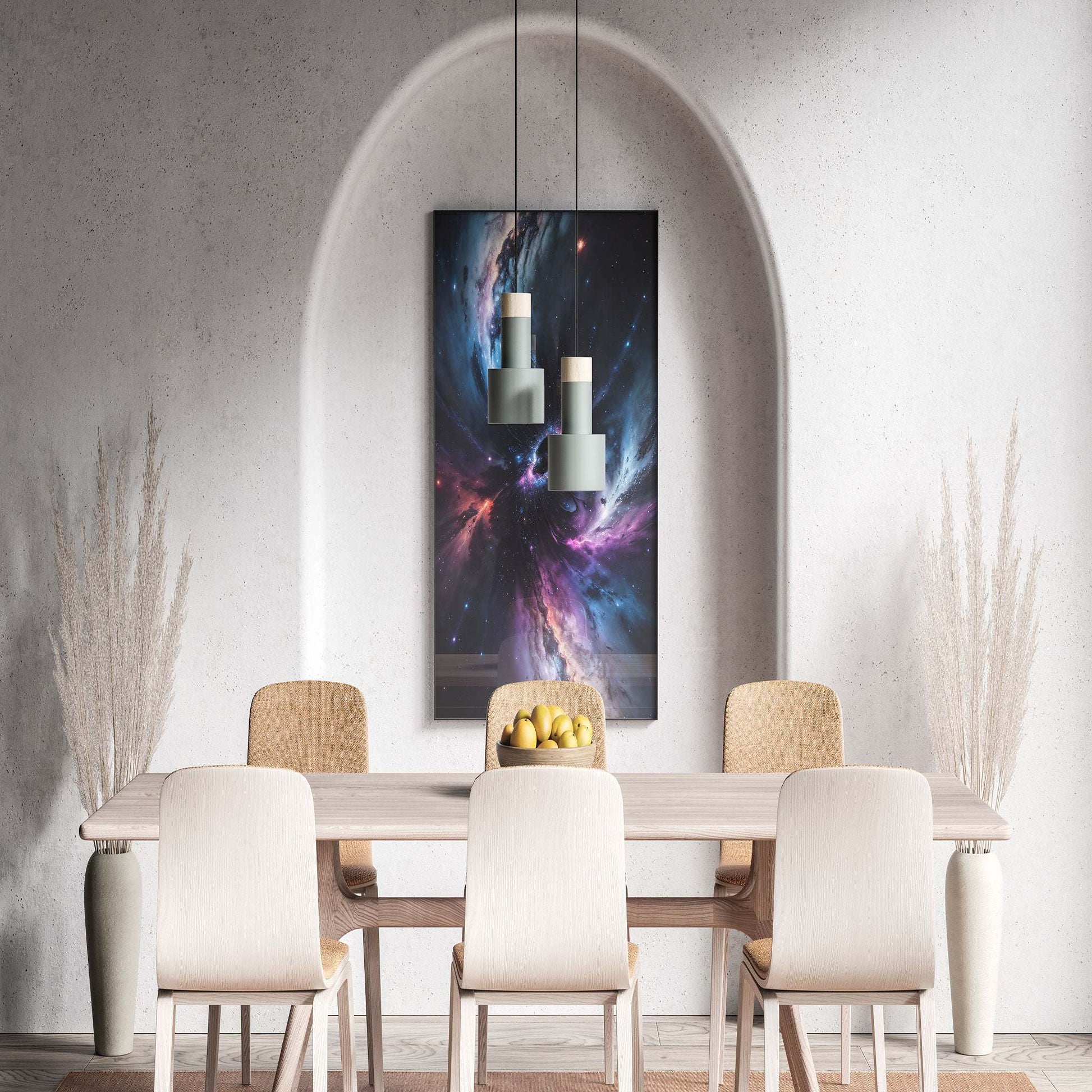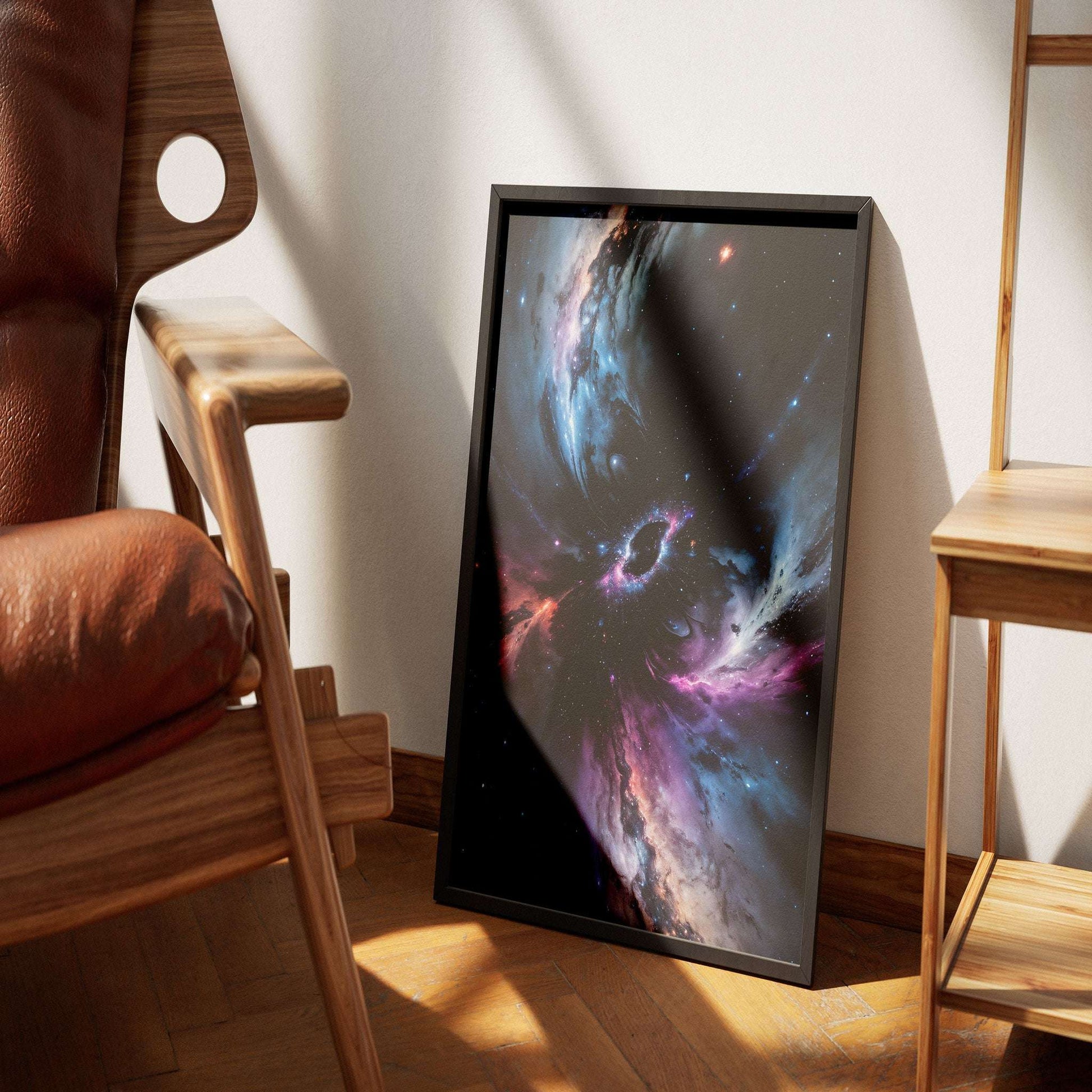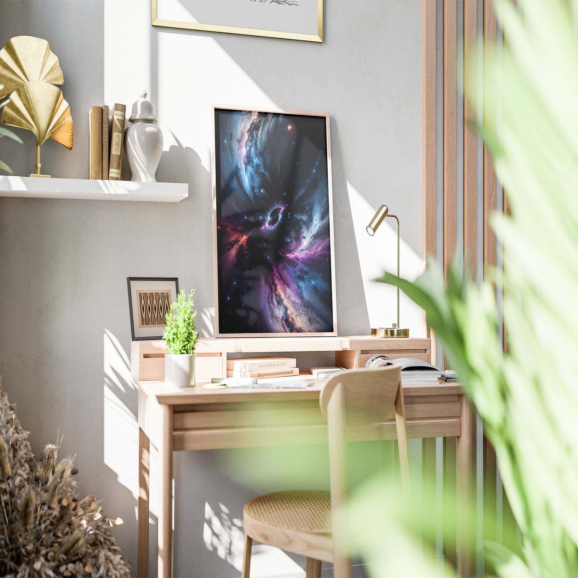 Two opposing galactic forces merge in a collision of fiery orange and tranquil azure. Sparks of starlight punctuate the serene darkness, telling the story of creation and destruction in perfect harmony.
