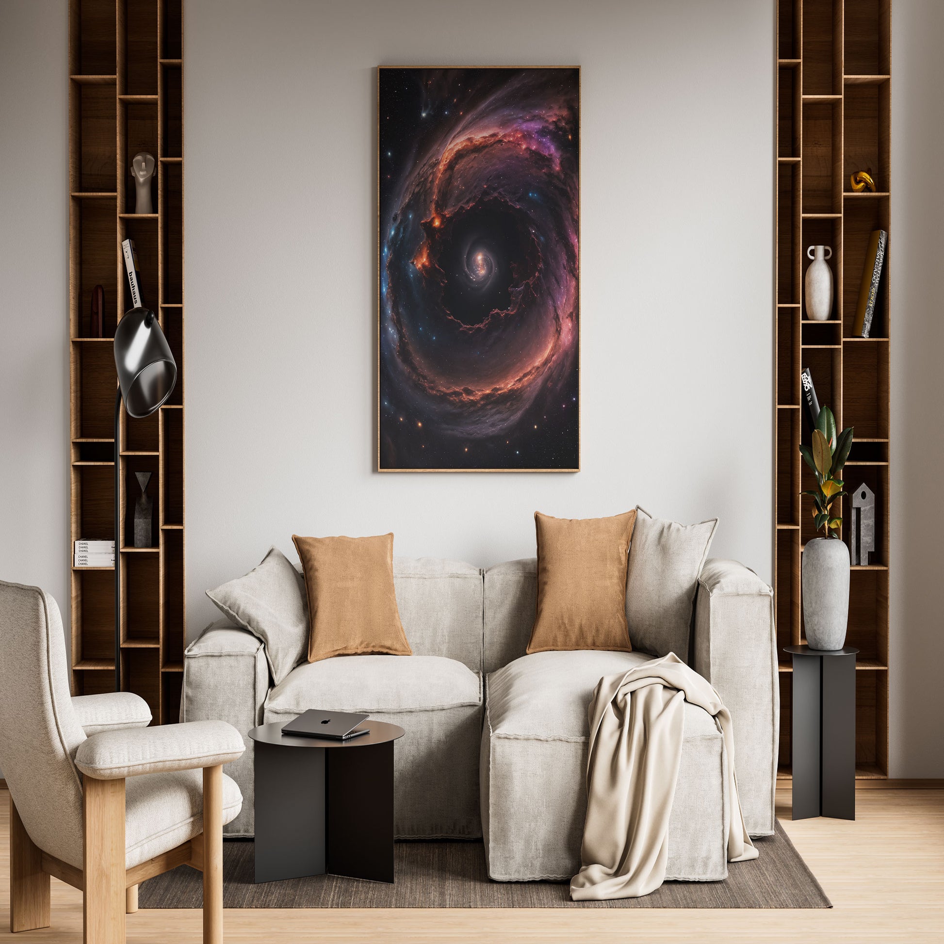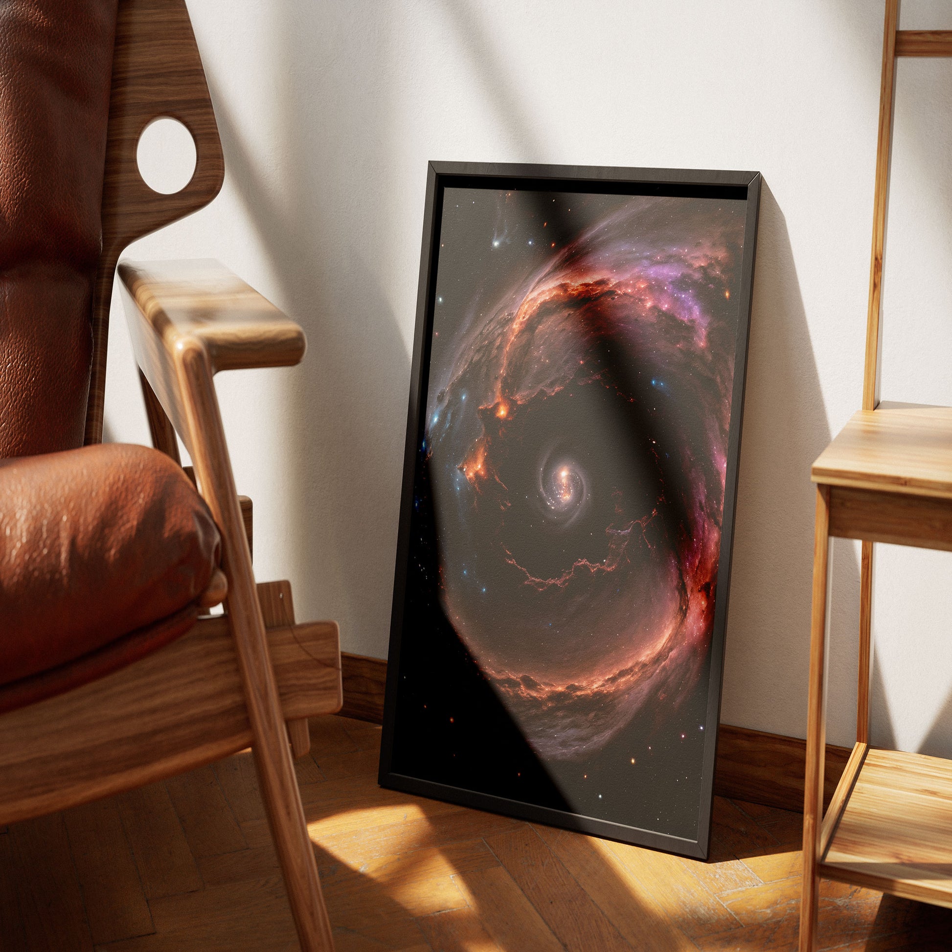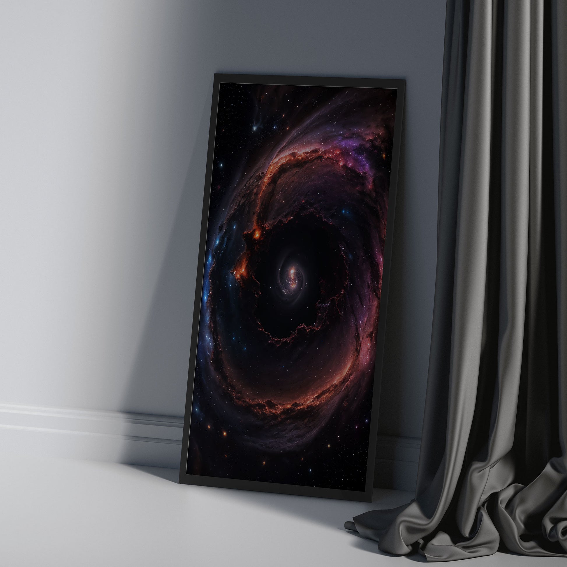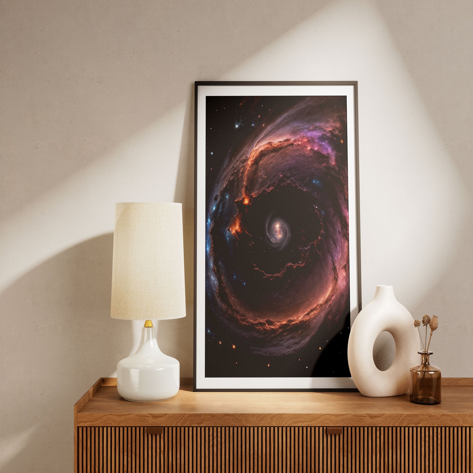 This cosmic spiral captures the essence of the universe’s heart, with glowing tendrils of fiery orange and pink swirling into a brilliant vortex. Bright starlight and deep space blues make this design hypnotic, reminiscent of an interstellar bloom.
