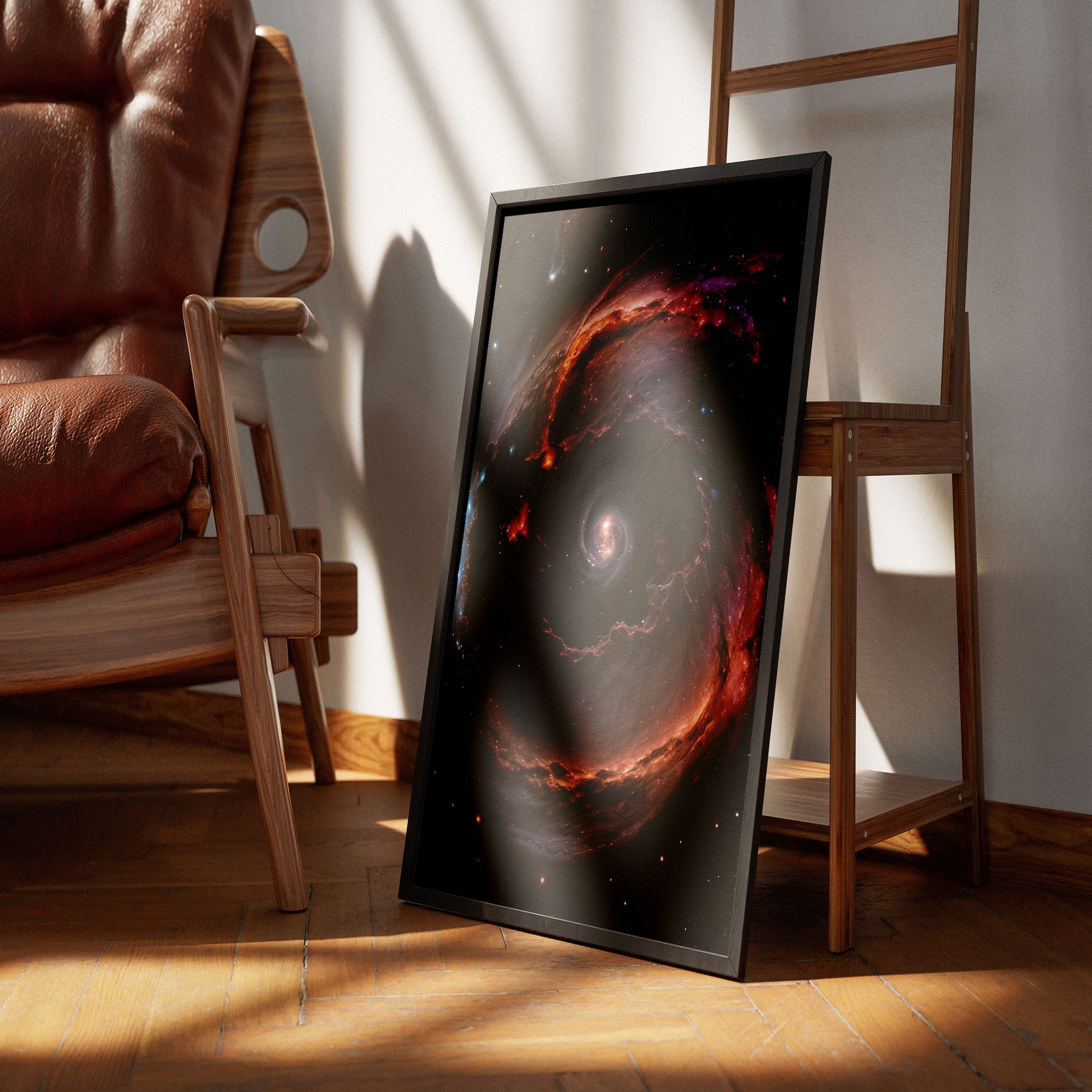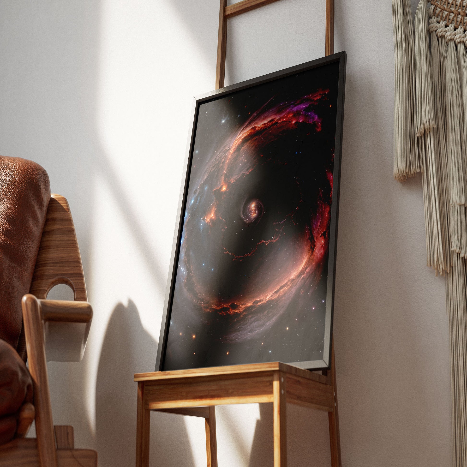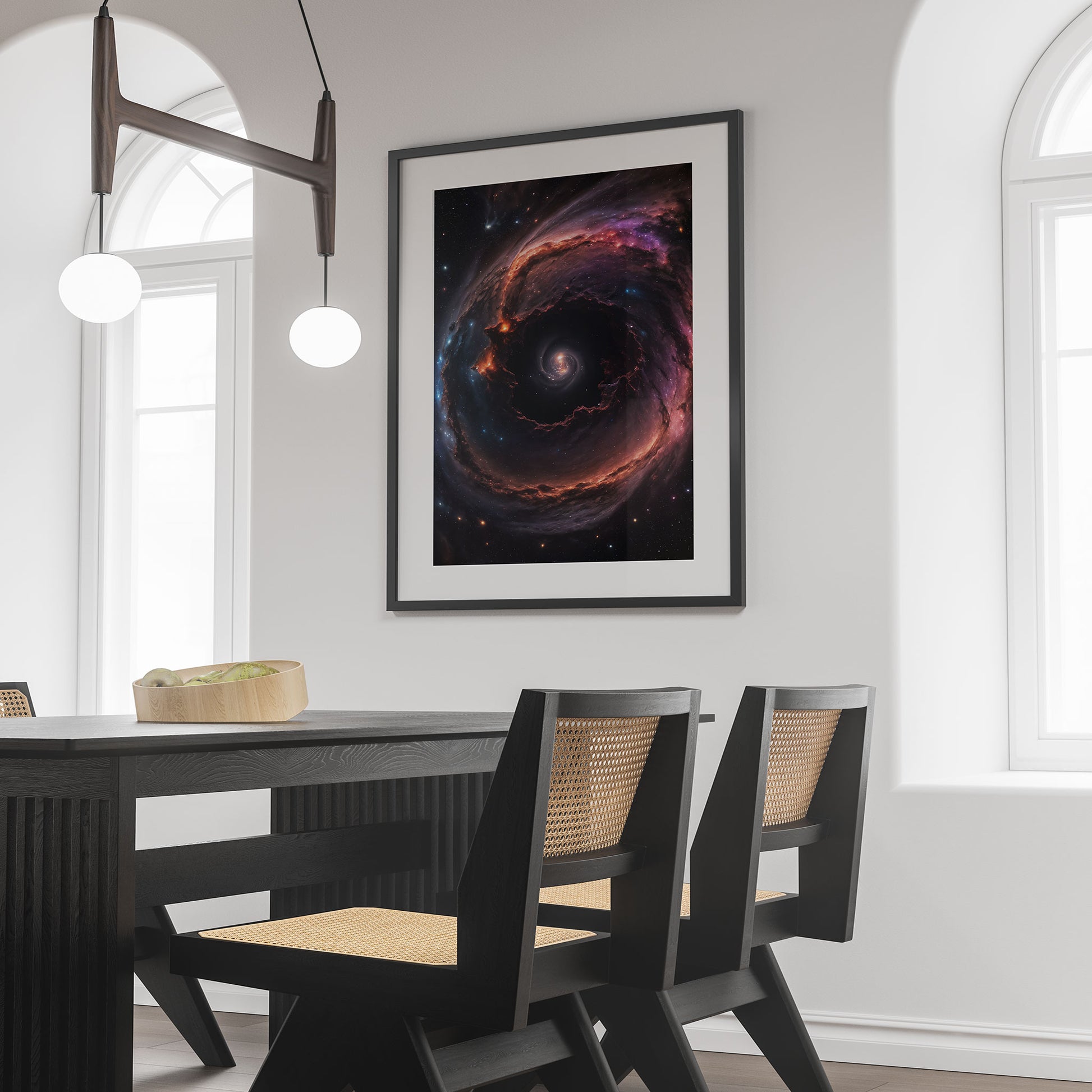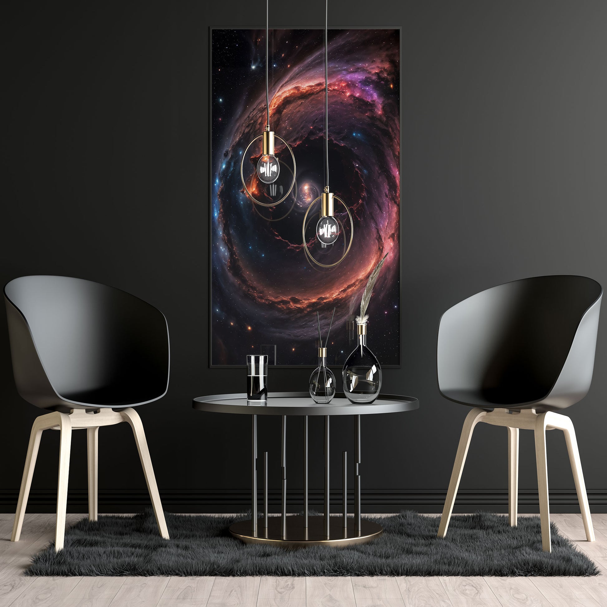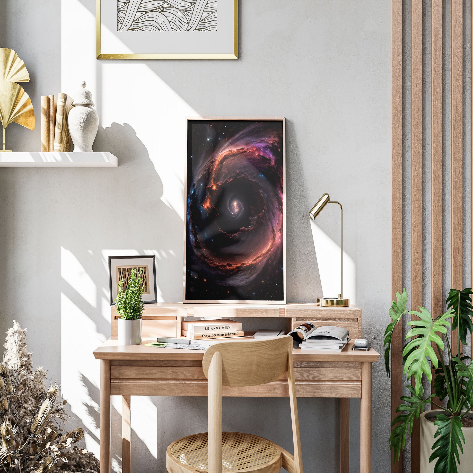 This cosmic spiral captures the essence of the universe’s heart, with glowing tendrils of fiery orange and pink swirling into a brilliant vortex. Bright starlight and deep space blues make this design hypnotic, reminiscent of an interstellar bloom.