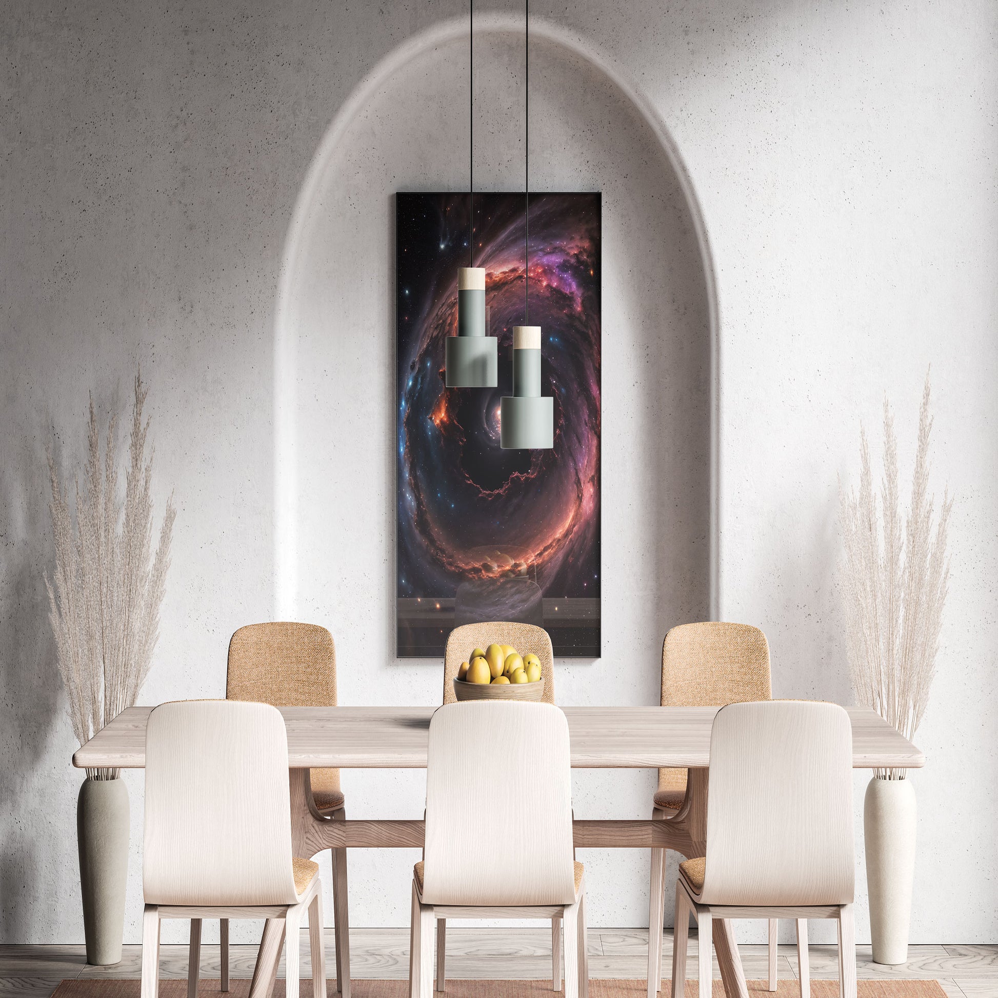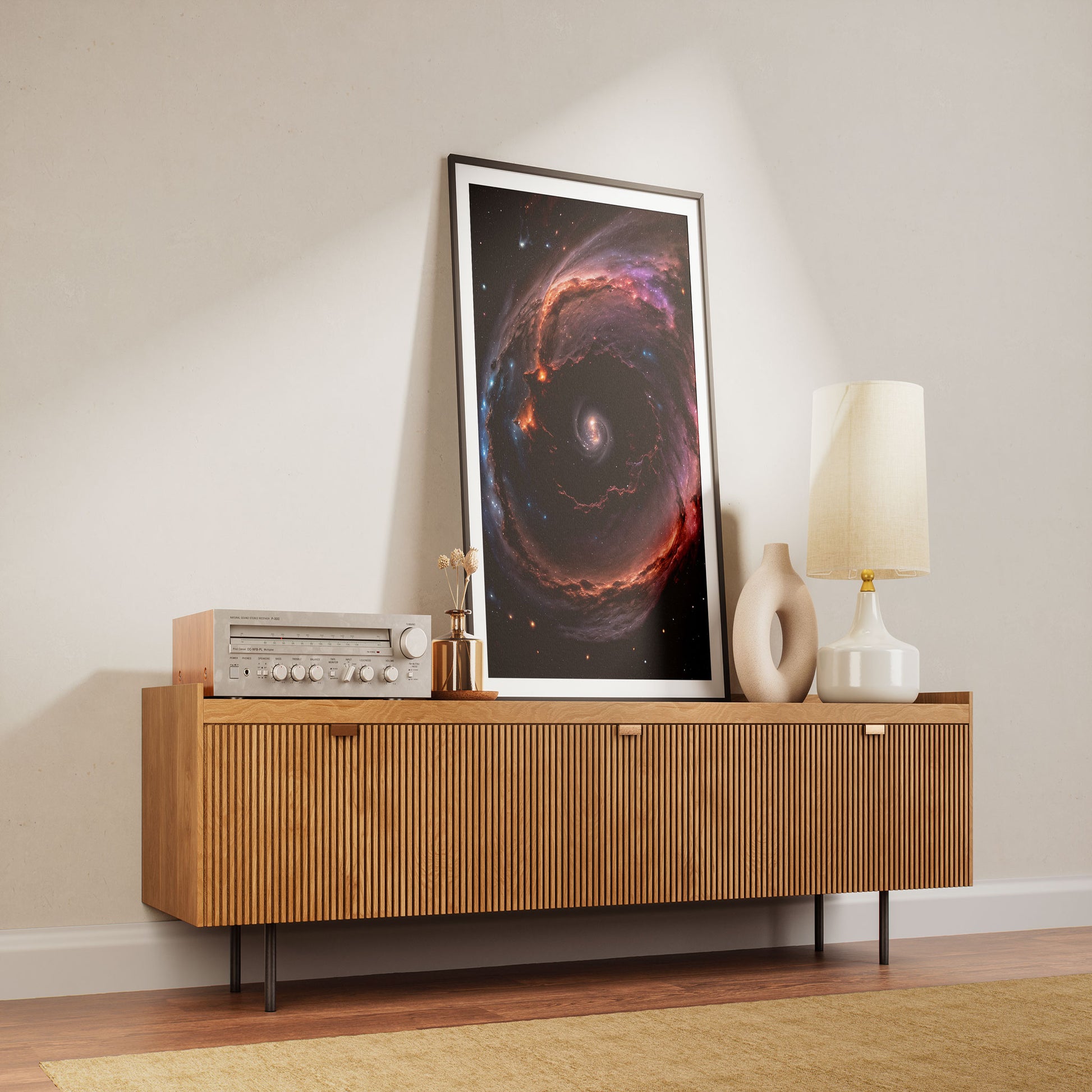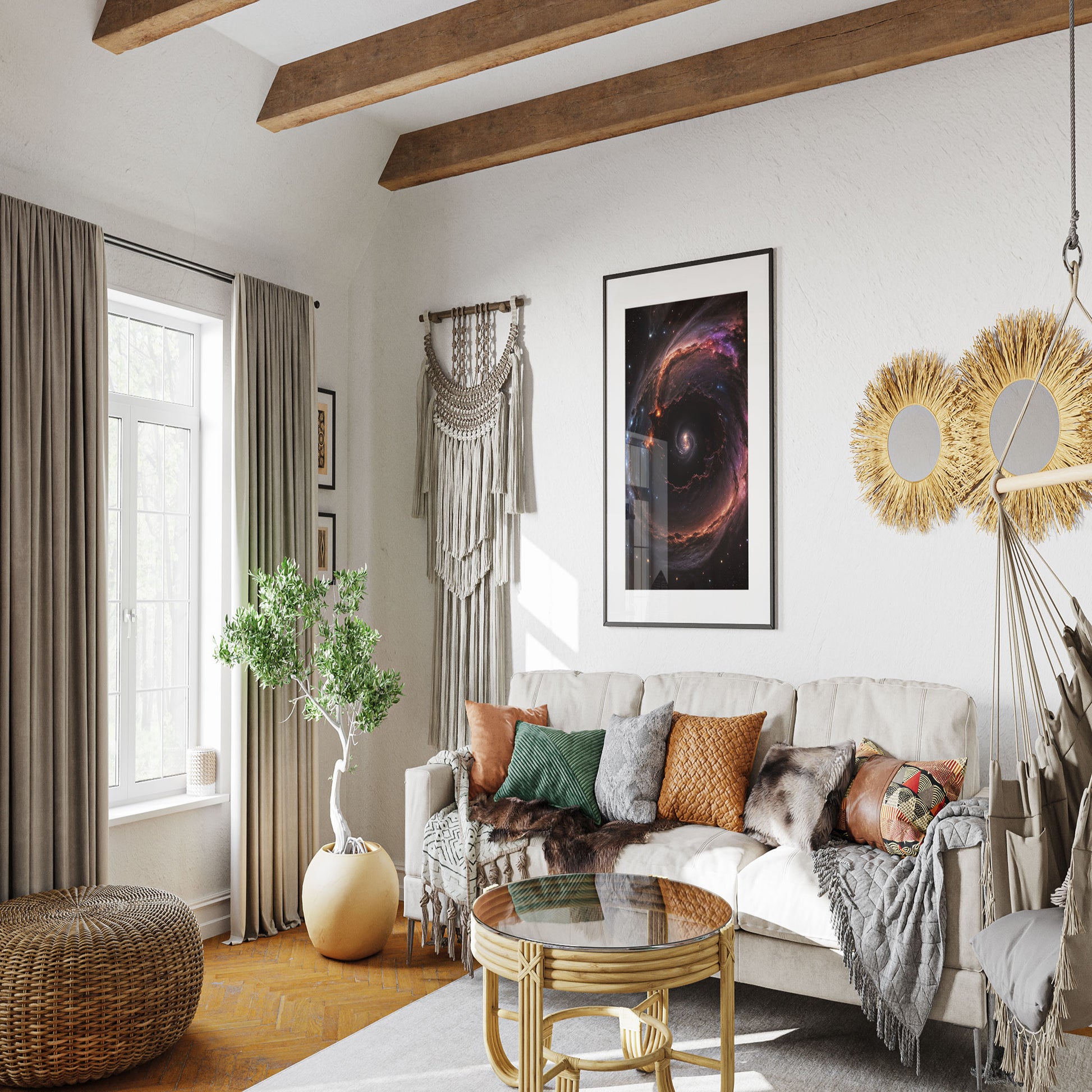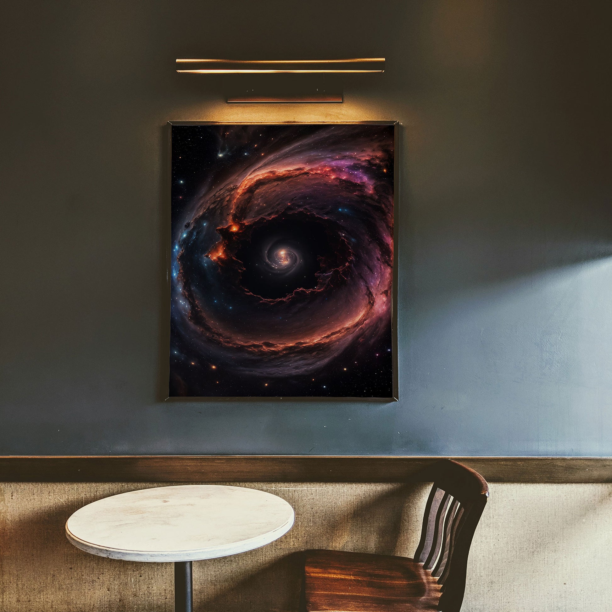 This cosmic spiral captures the essence of the universe’s heart, with glowing tendrils of fiery orange and pink swirling into a brilliant vortex. Bright starlight and deep space blues make this design hypnotic, reminiscent of an interstellar bloom.