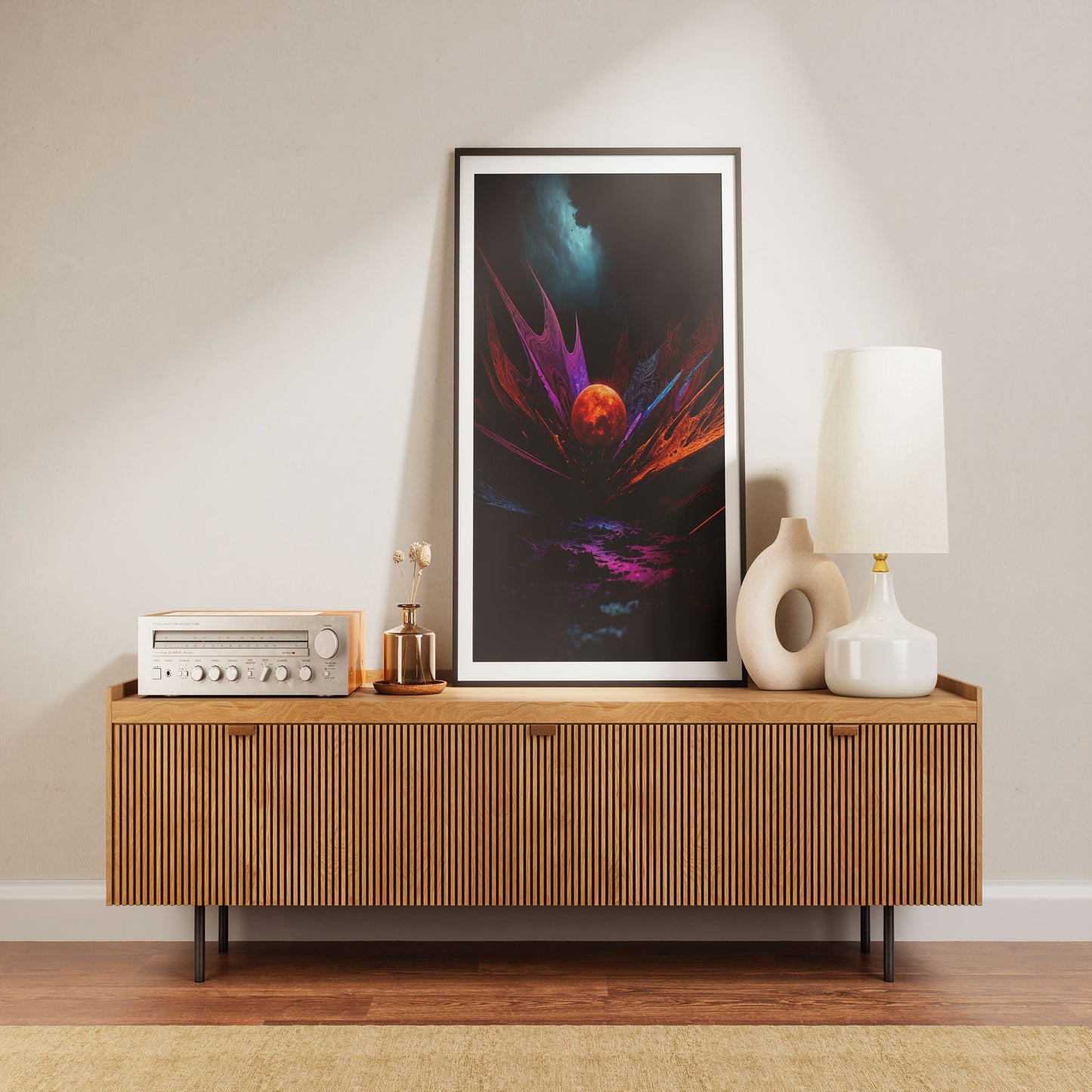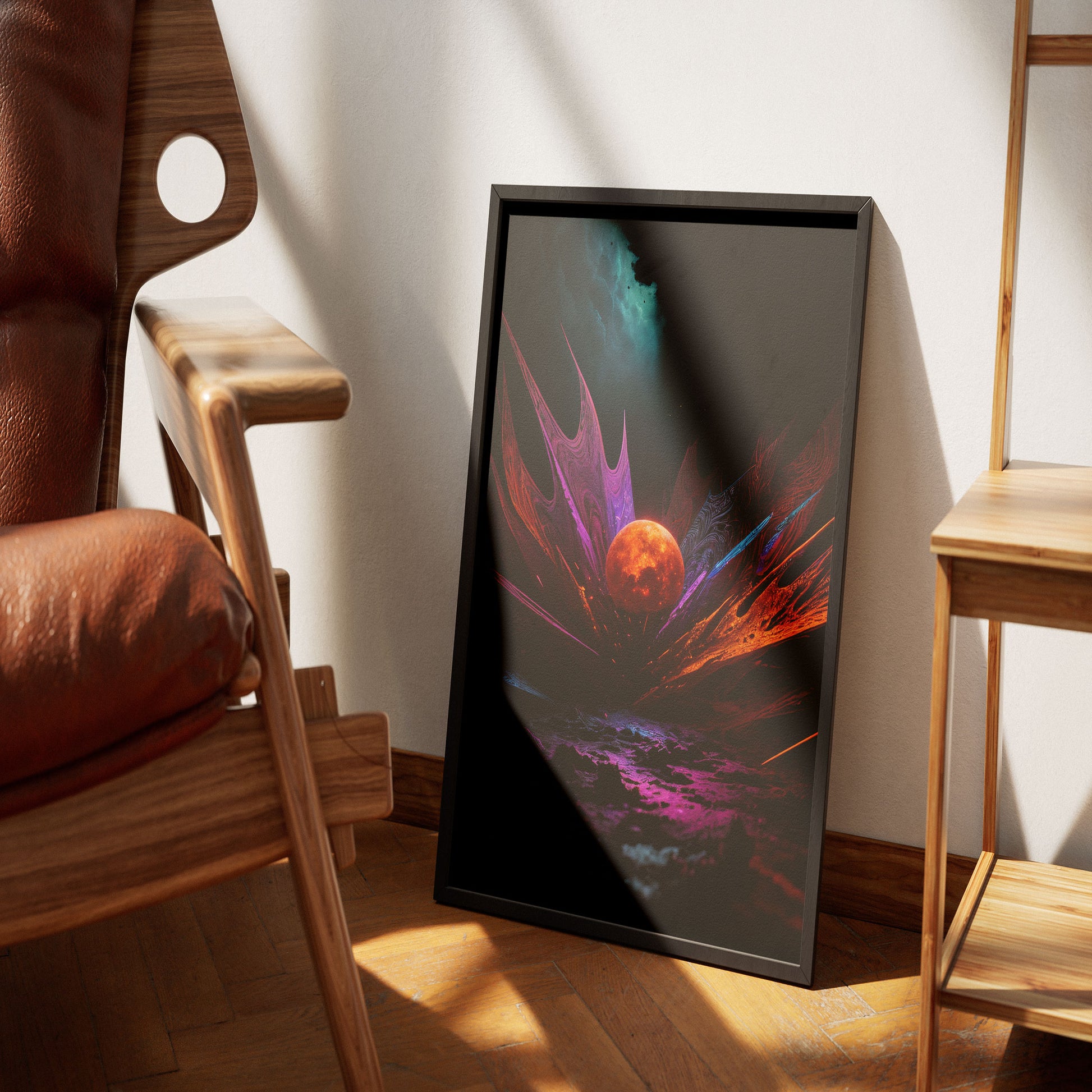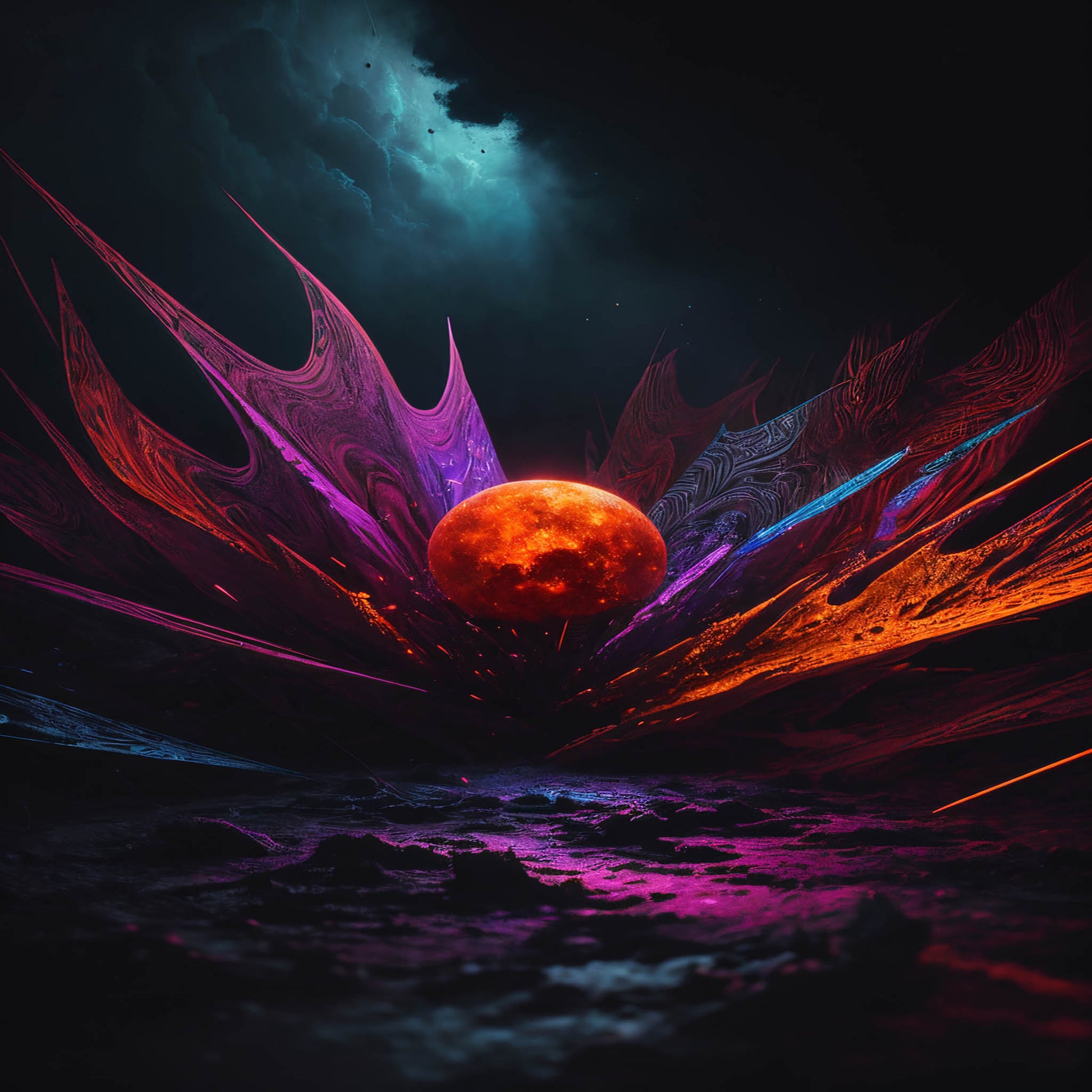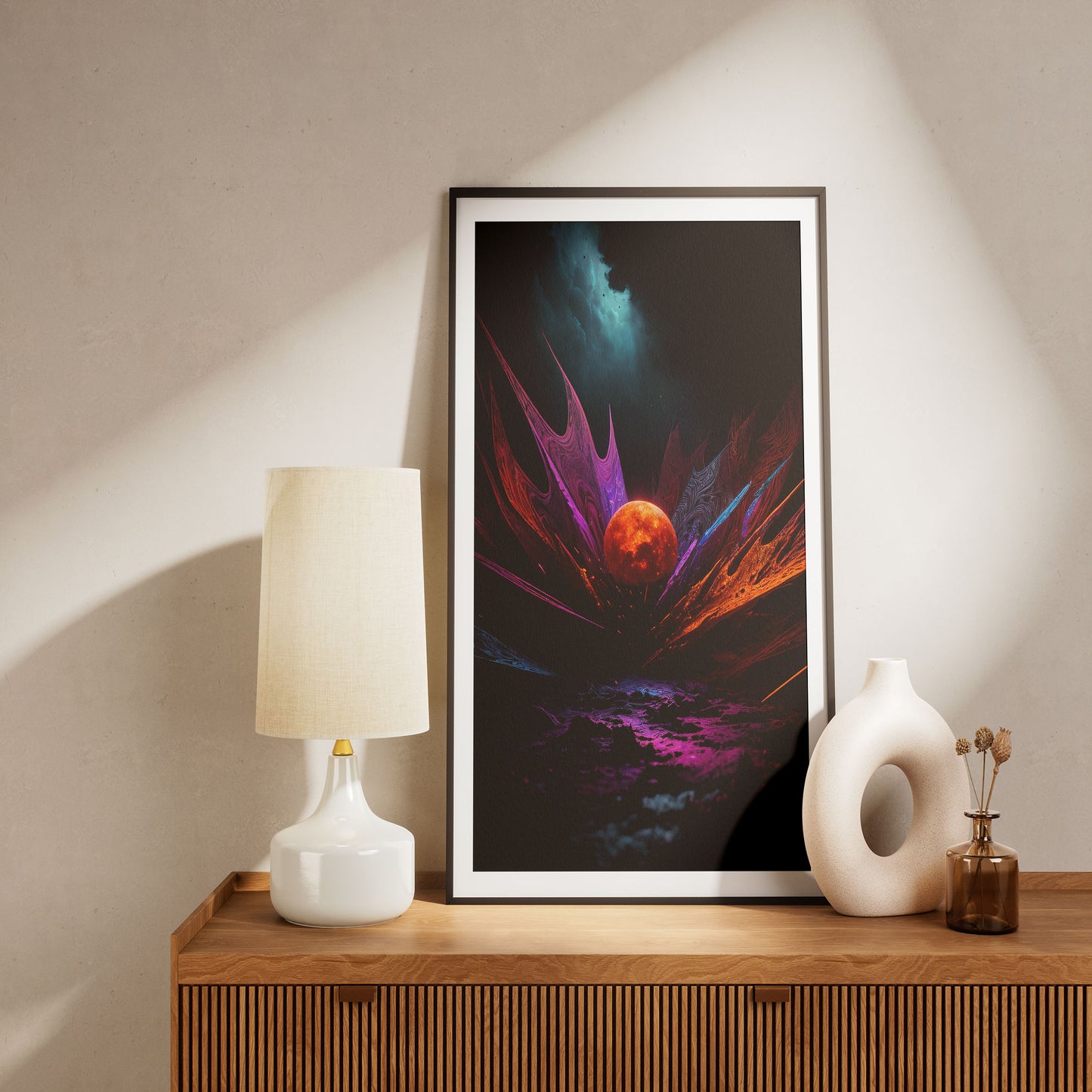 A fiery sun-like orb erupts from petal-shaped cosmic waves, illuminating the scene with shades of crimson, violet, and electric blue. The contrast of dark space and radiant celestial petals creates a sense of awe and cosmic power.