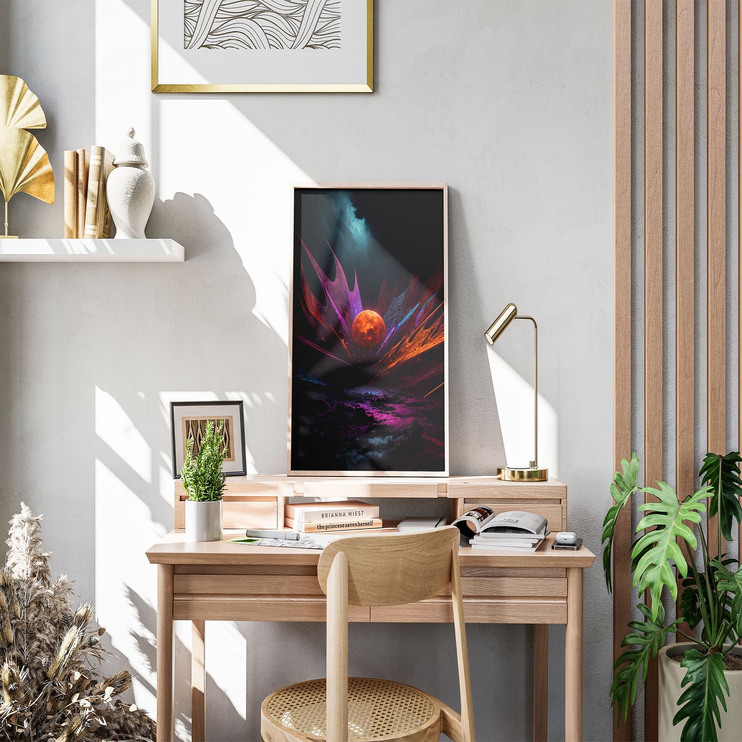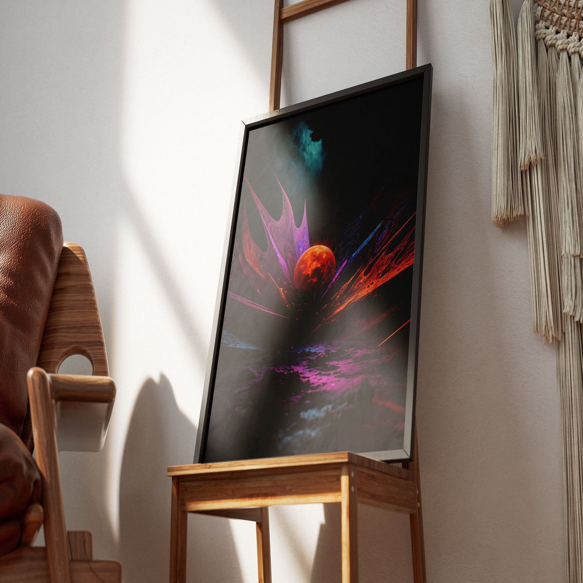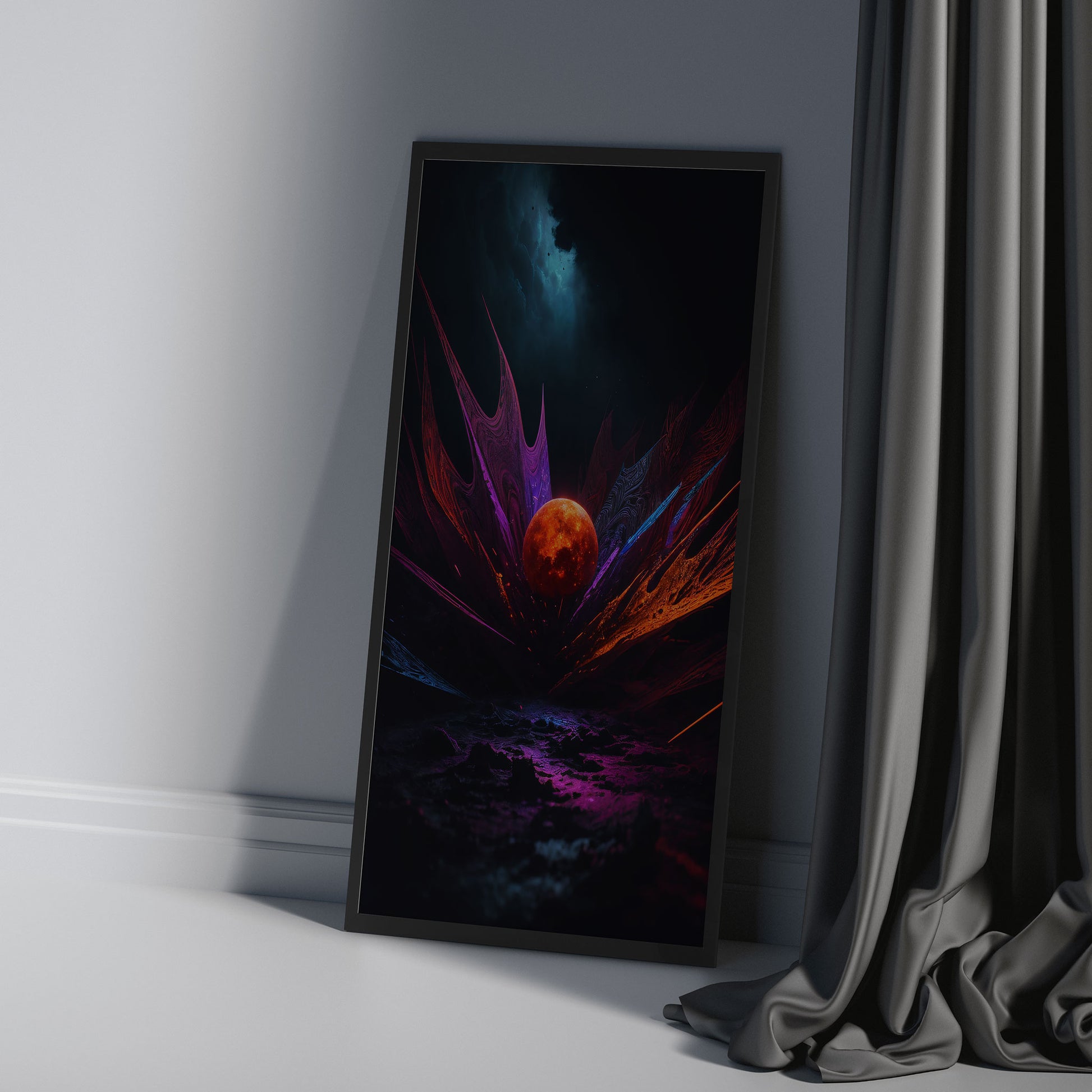 A fiery sun-like orb erupts from petal-shaped cosmic waves, illuminating the scene with shades of crimson, violet, and electric blue. The contrast of dark space and radiant celestial petals creates a sense of awe and cosmic power.