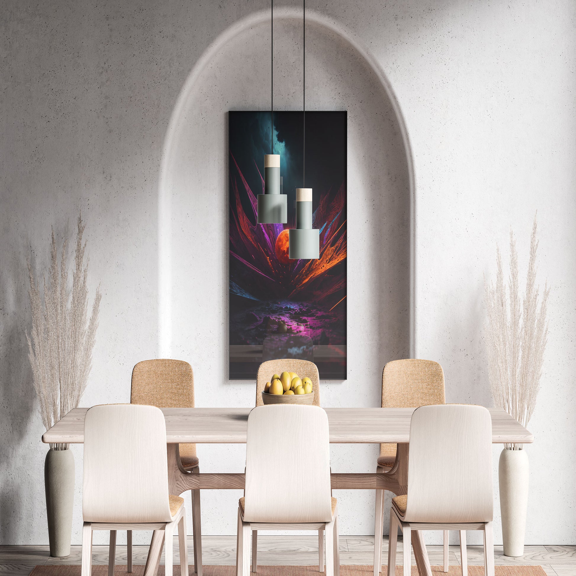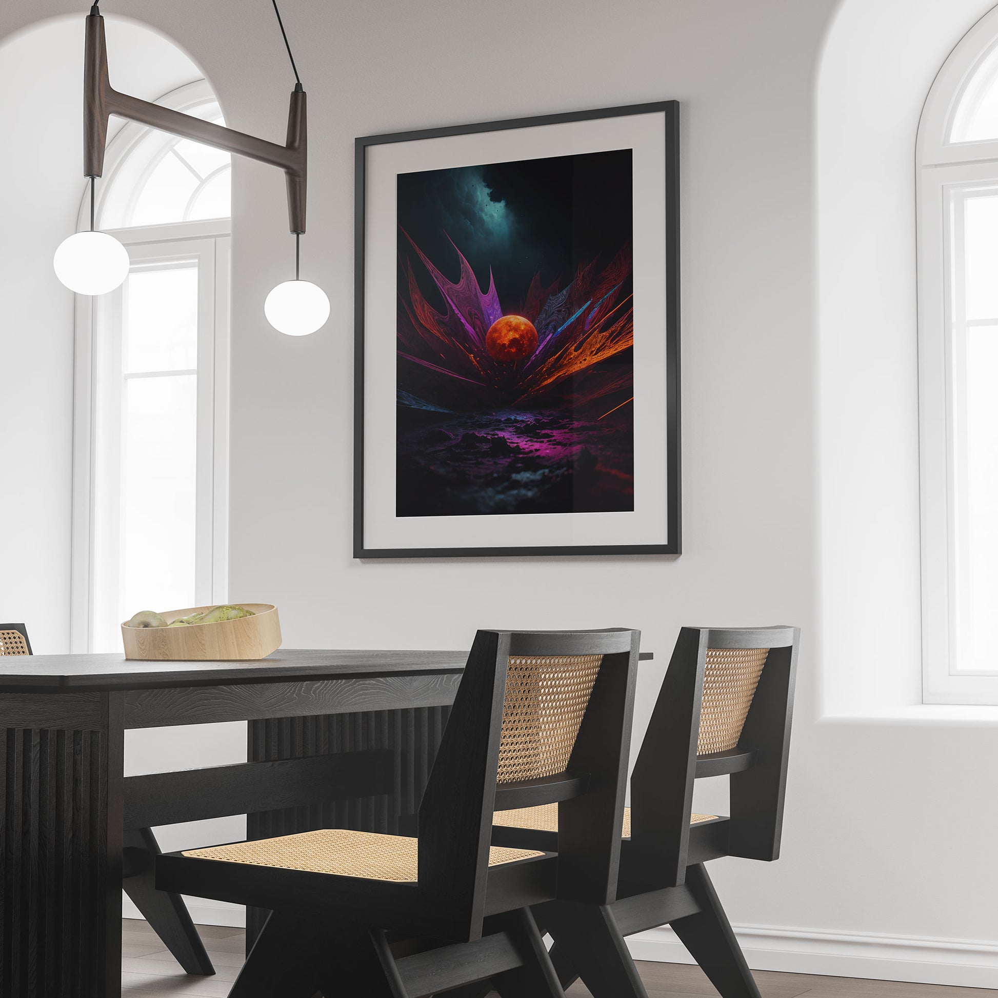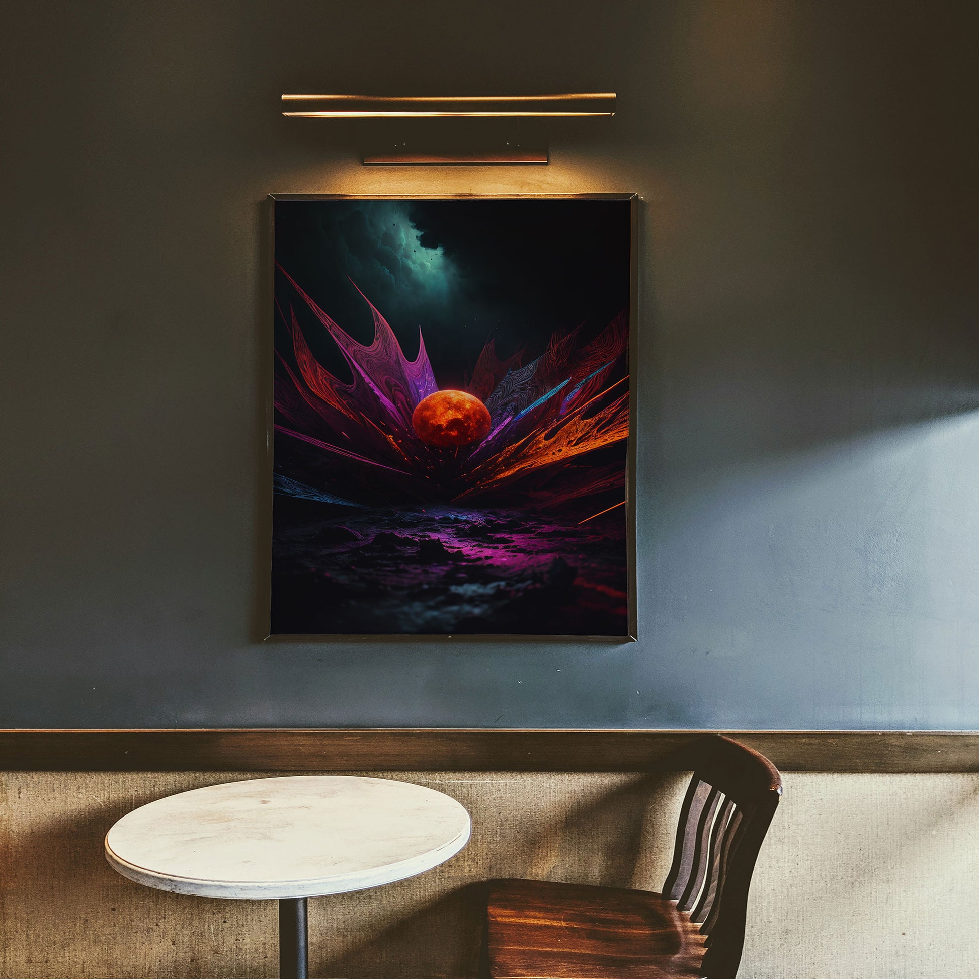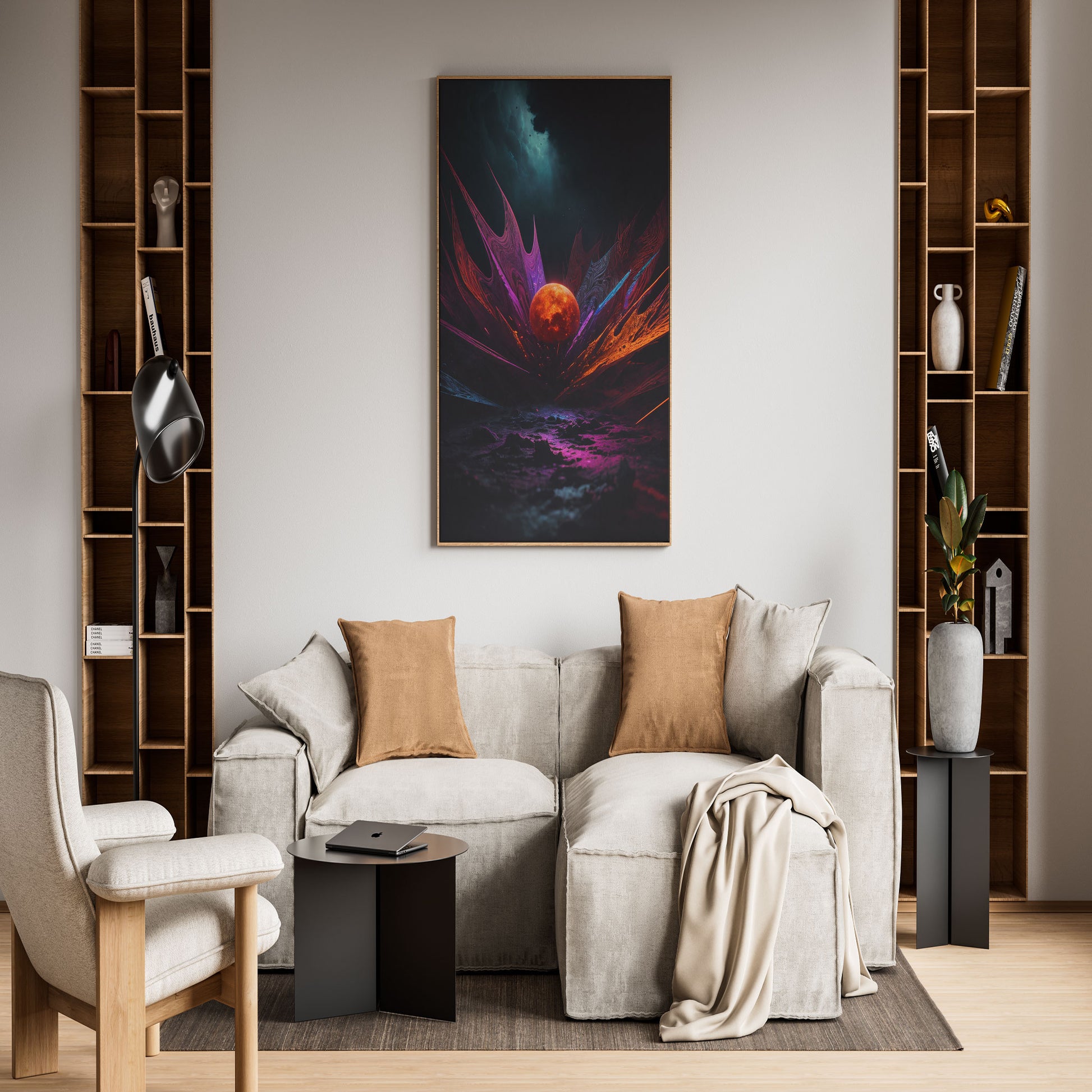 A fiery sun-like orb erupts from petal-shaped cosmic waves, illuminating the scene with shades of crimson, violet, and electric blue. The contrast of dark space and radiant celestial petals creates a sense of awe and cosmic power.