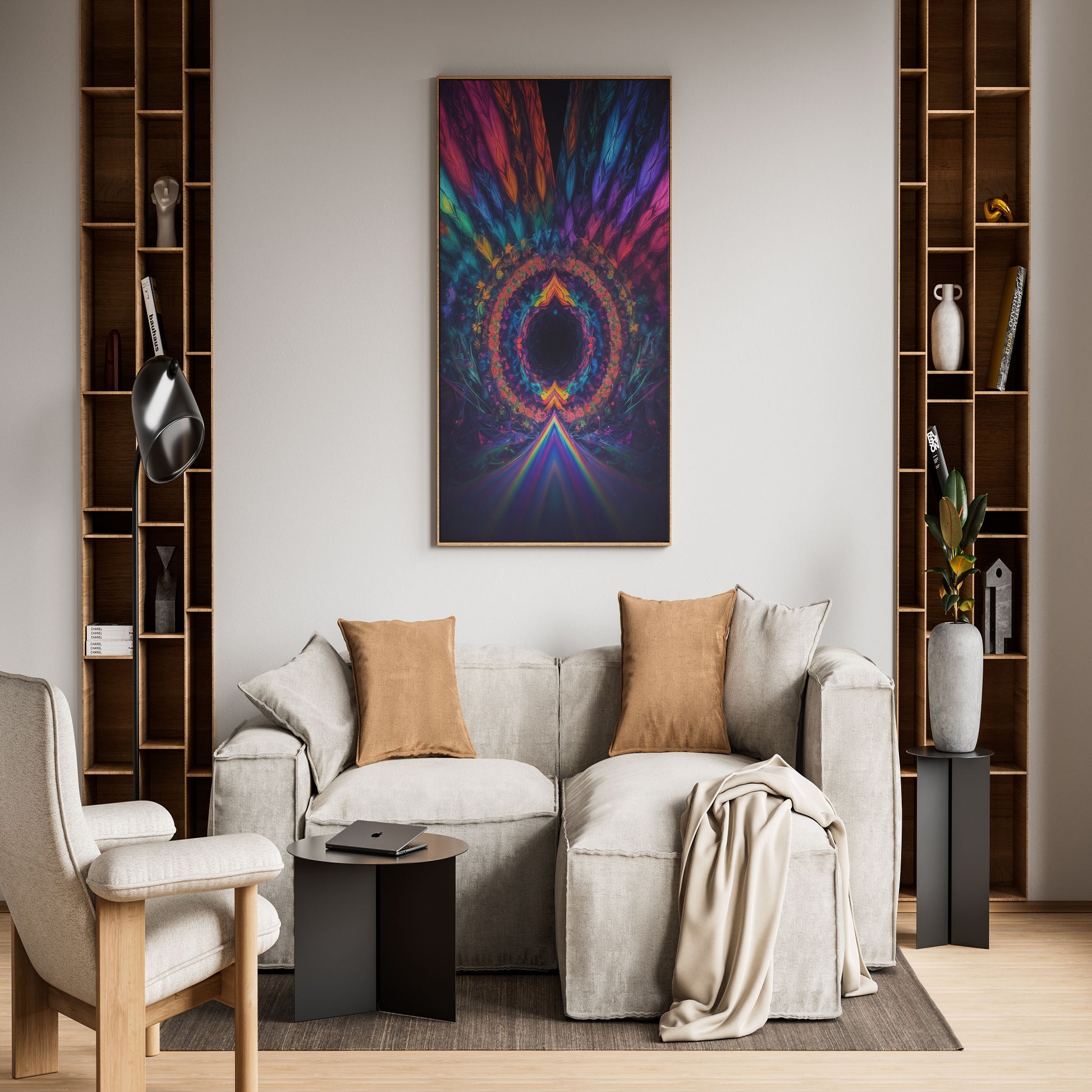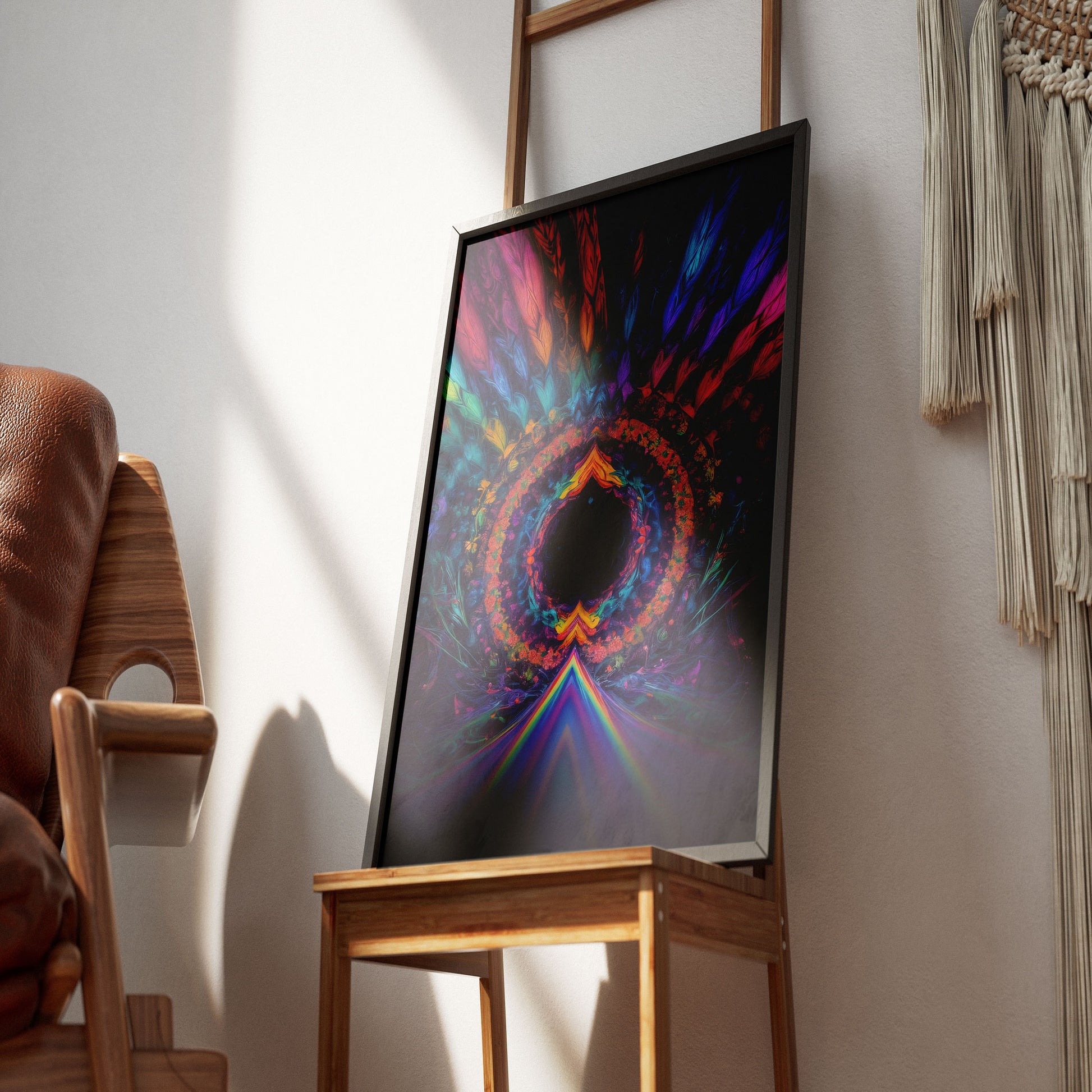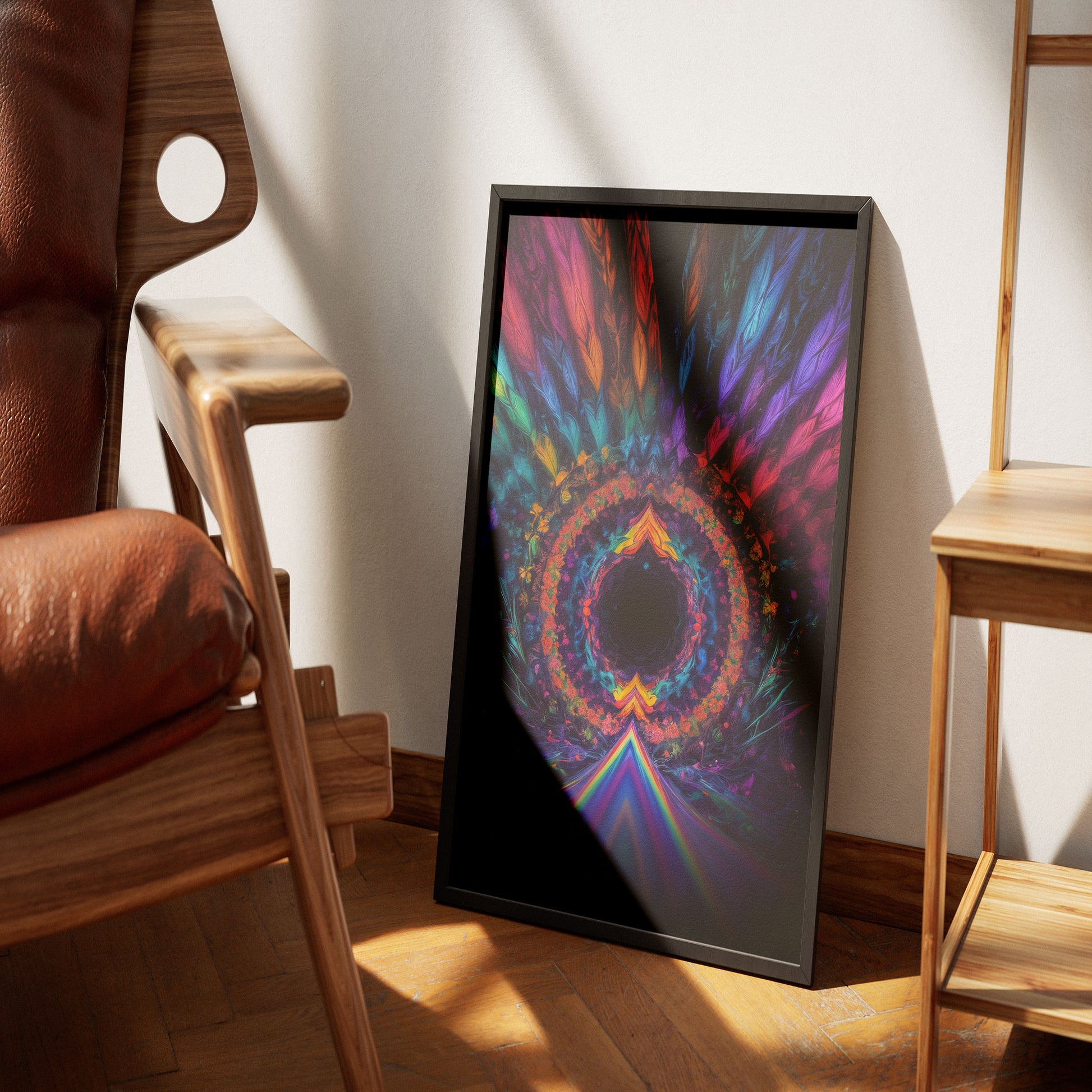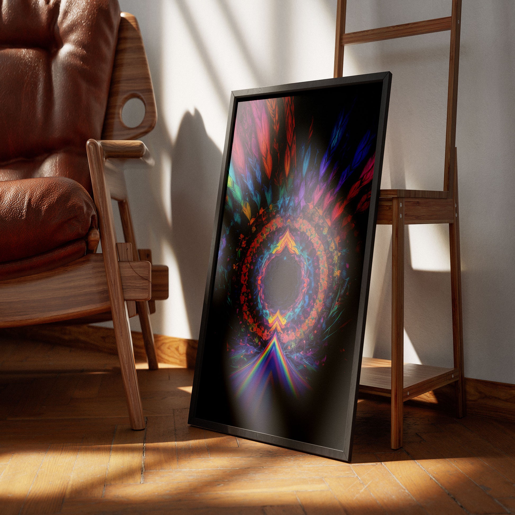 This image bursts with a kaleidoscope of rainbow colors in a mesmerizing radial pattern. Shades of violet, green, and gold converge into a central void, radiating the essence of galactic harmony.