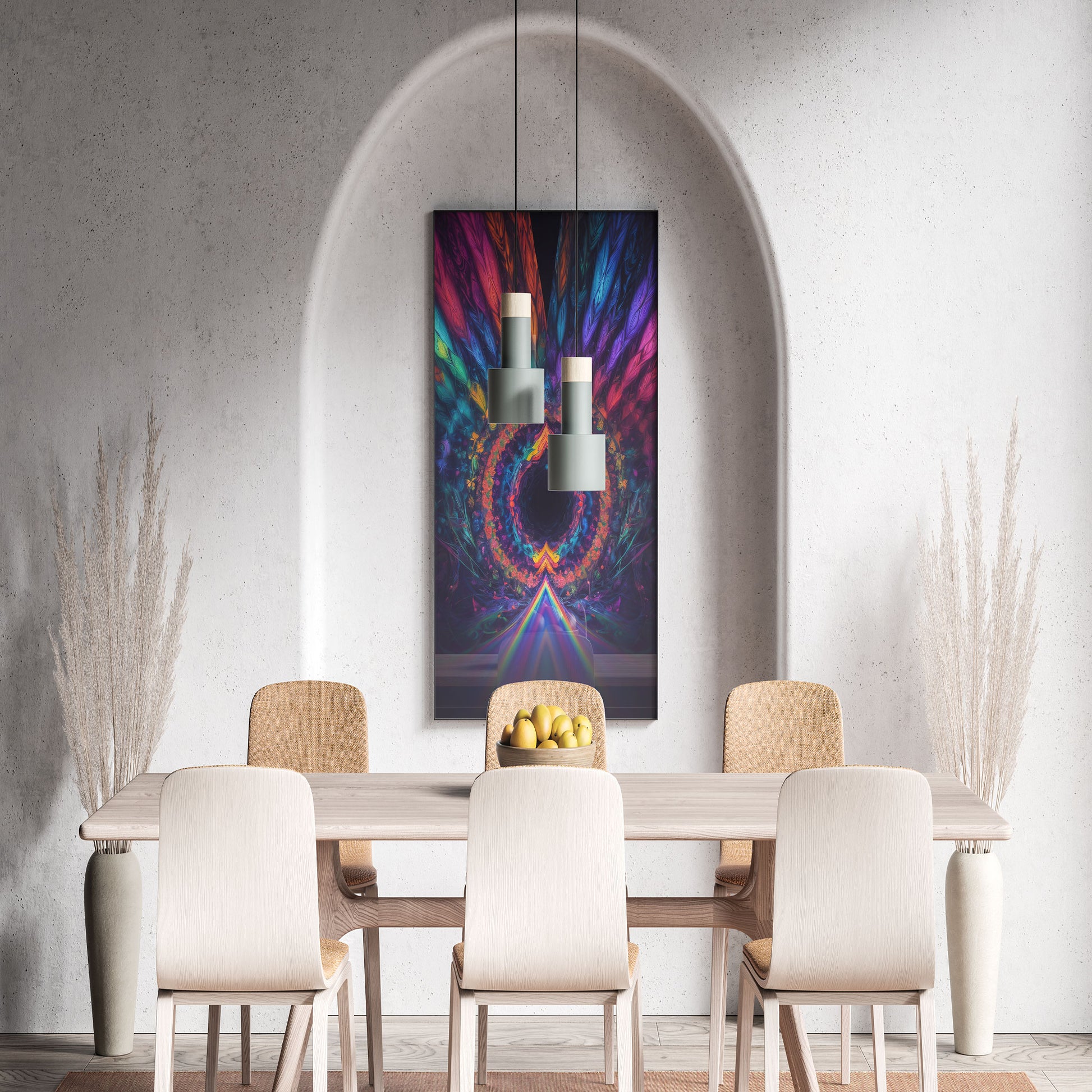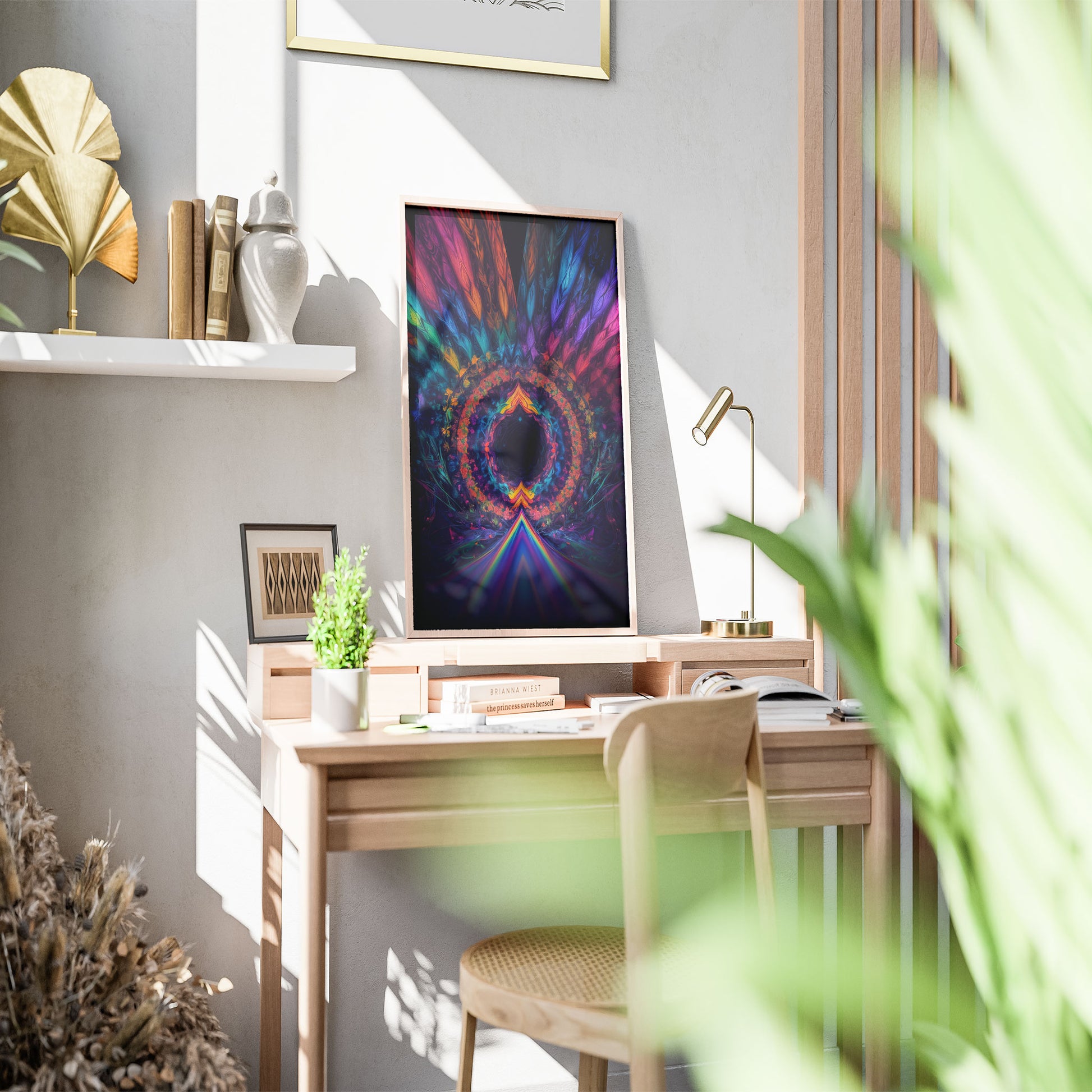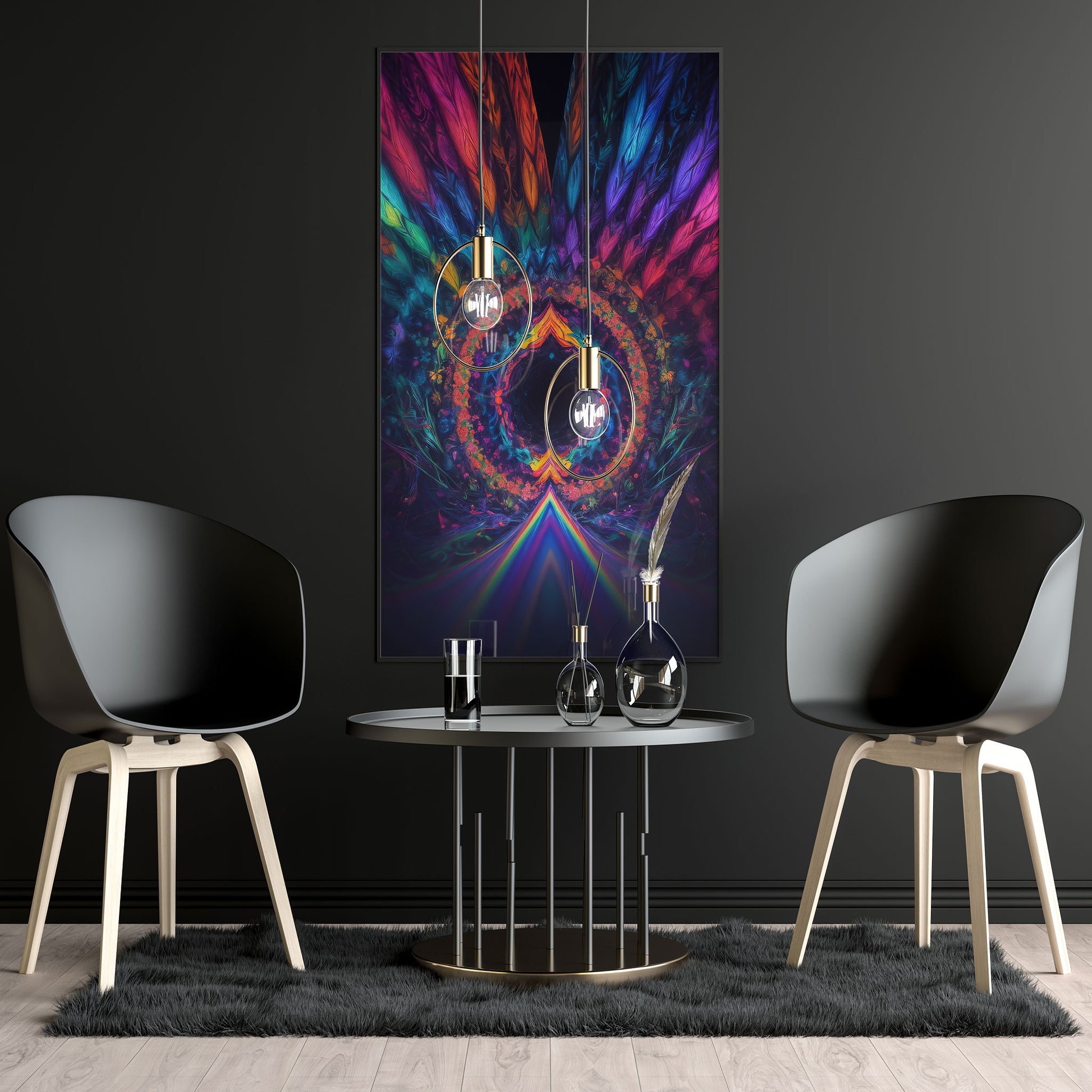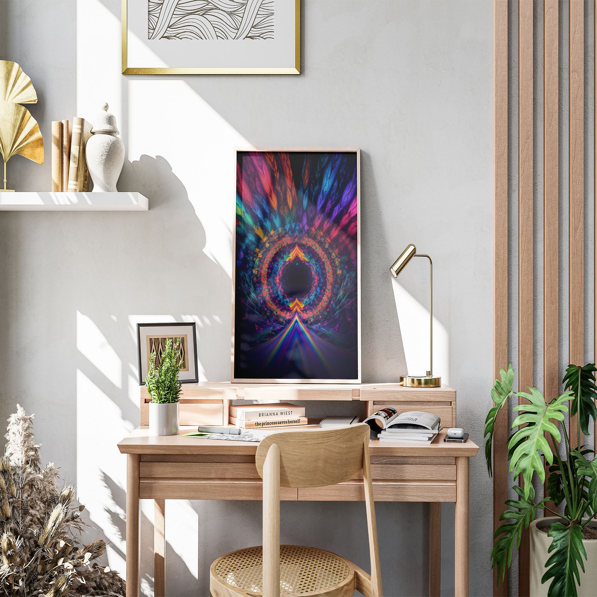 This image bursts with a kaleidoscope of rainbow colors in a mesmerizing radial pattern. Shades of violet, green, and gold converge into a central void, radiating the essence of galactic harmony.