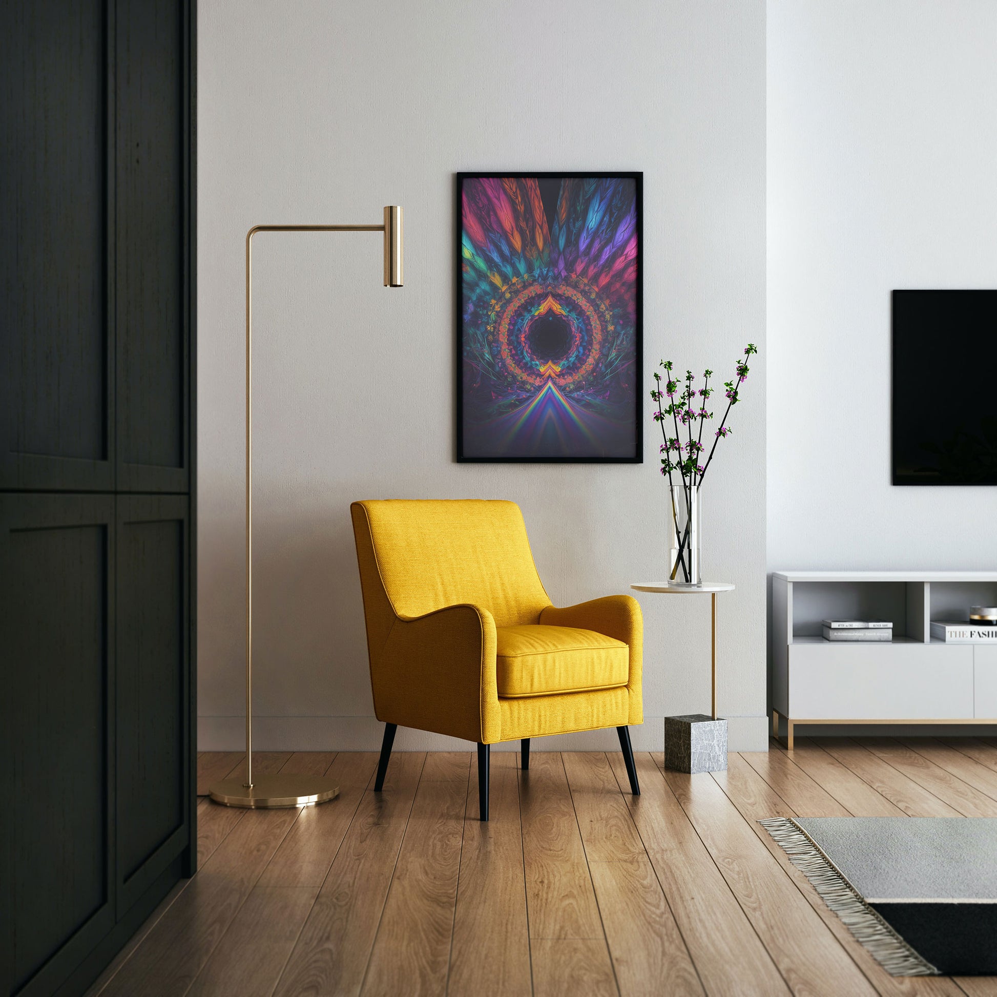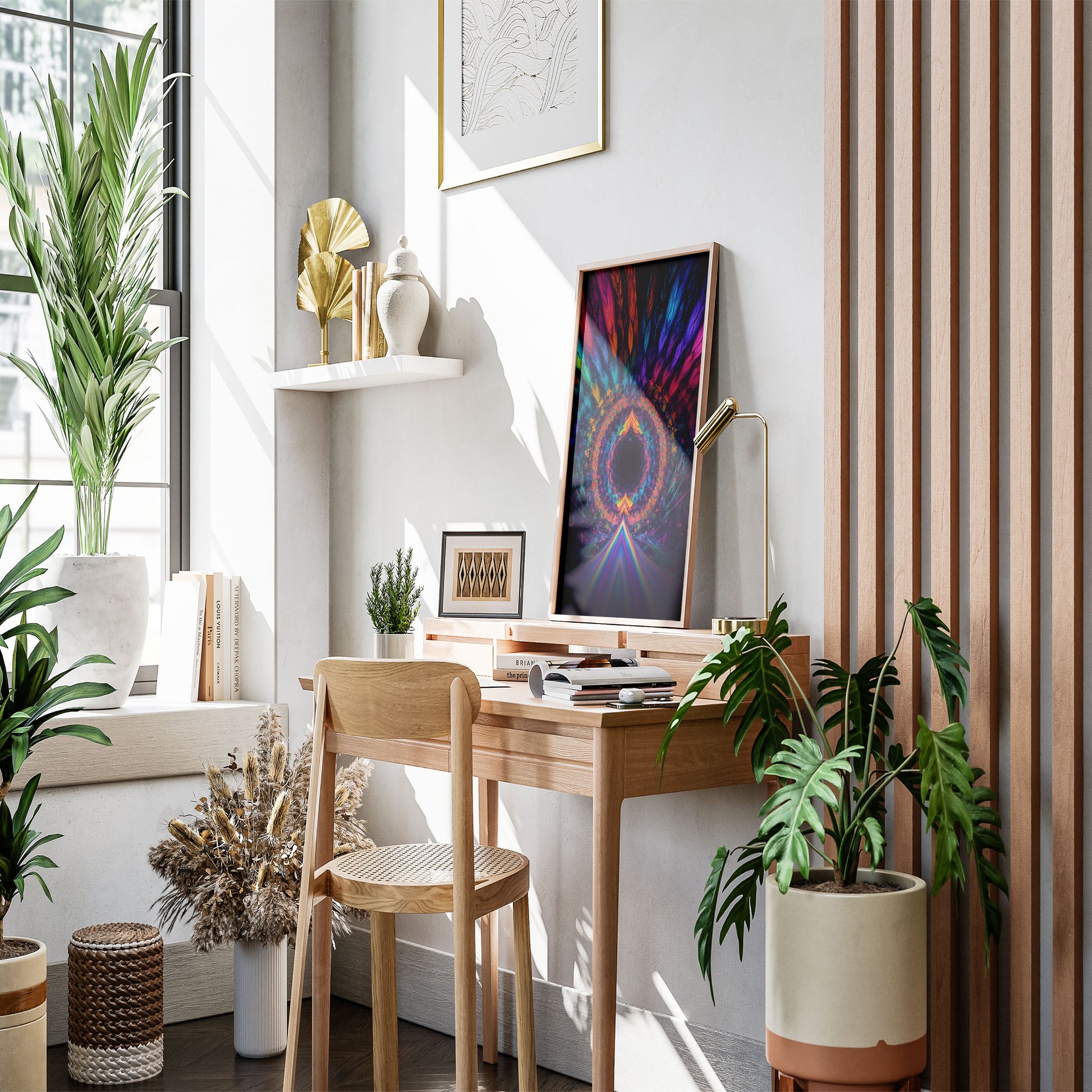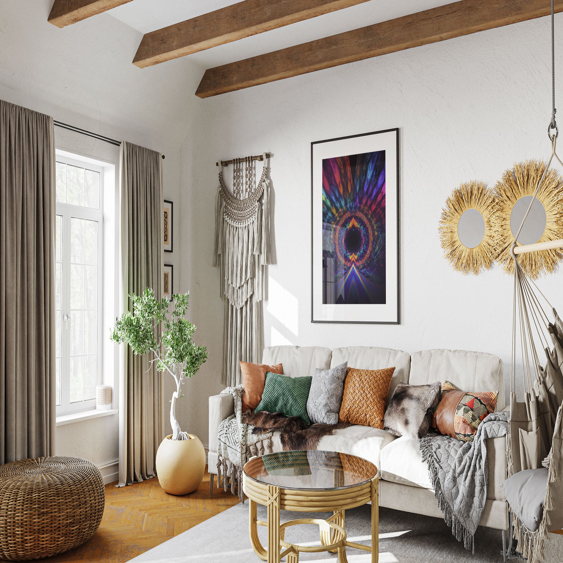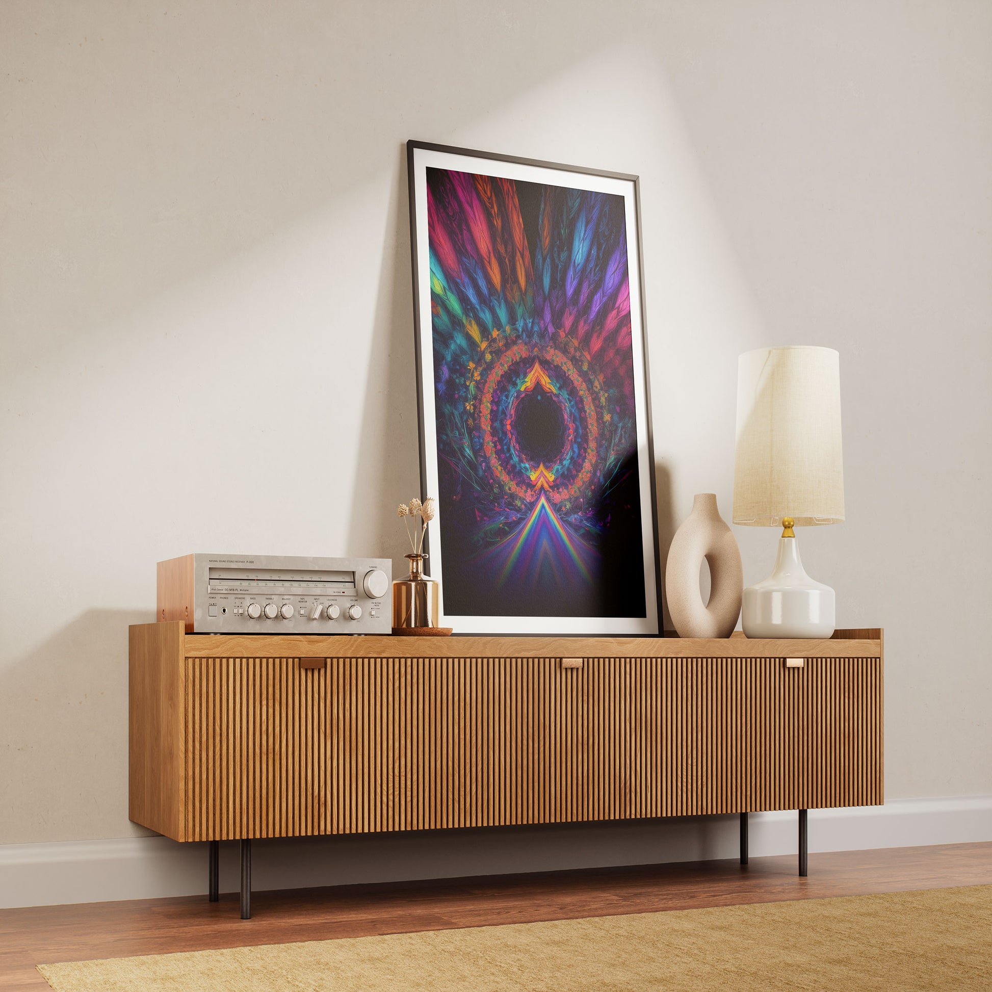 This image bursts with a kaleidoscope of rainbow colors in a mesmerizing radial pattern. Shades of violet, green, and gold converge into a central void, radiating the essence of galactic harmony.