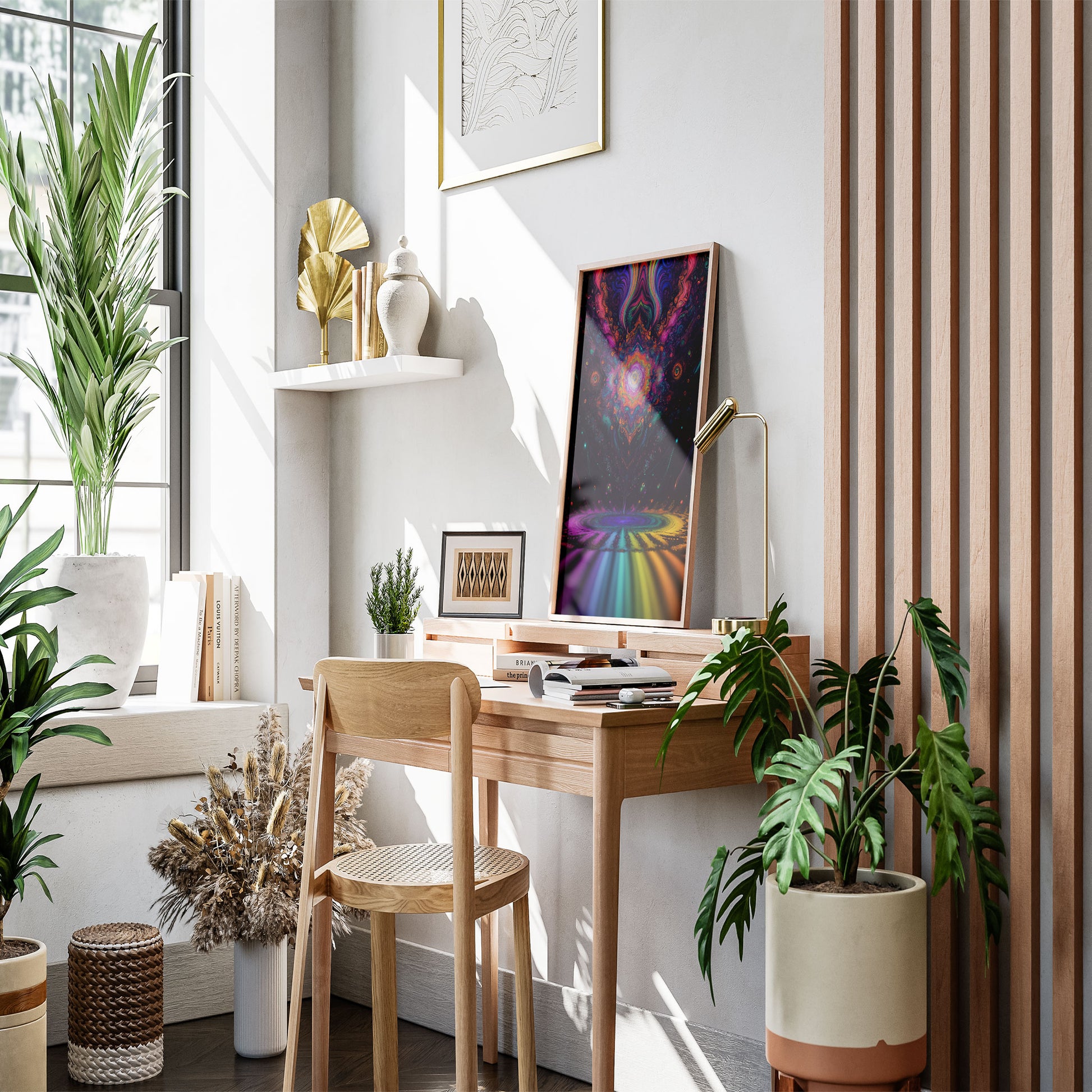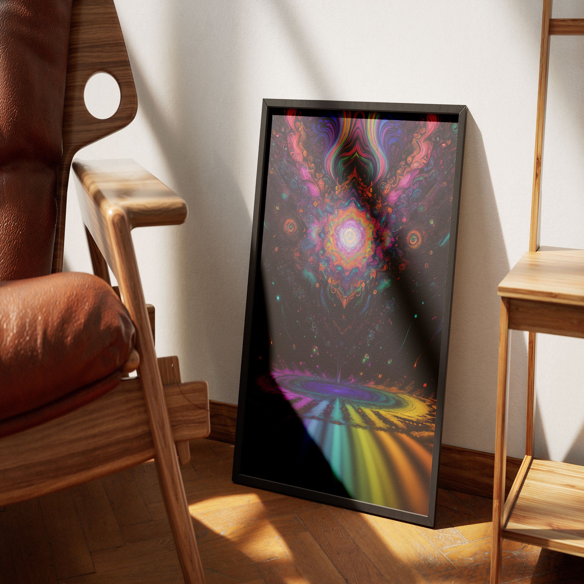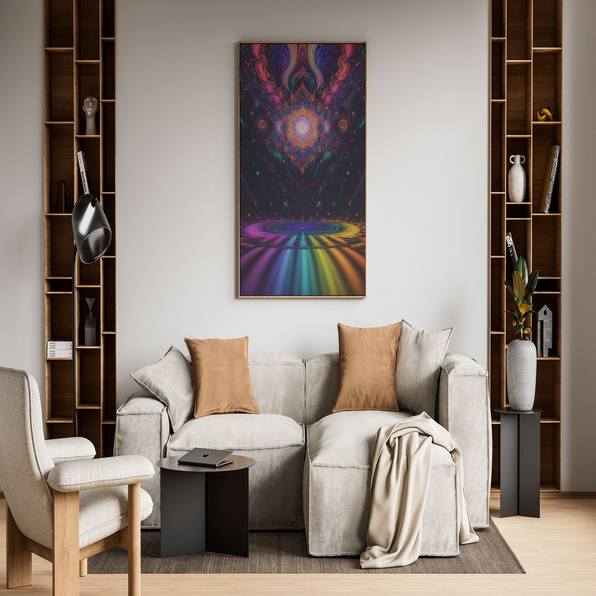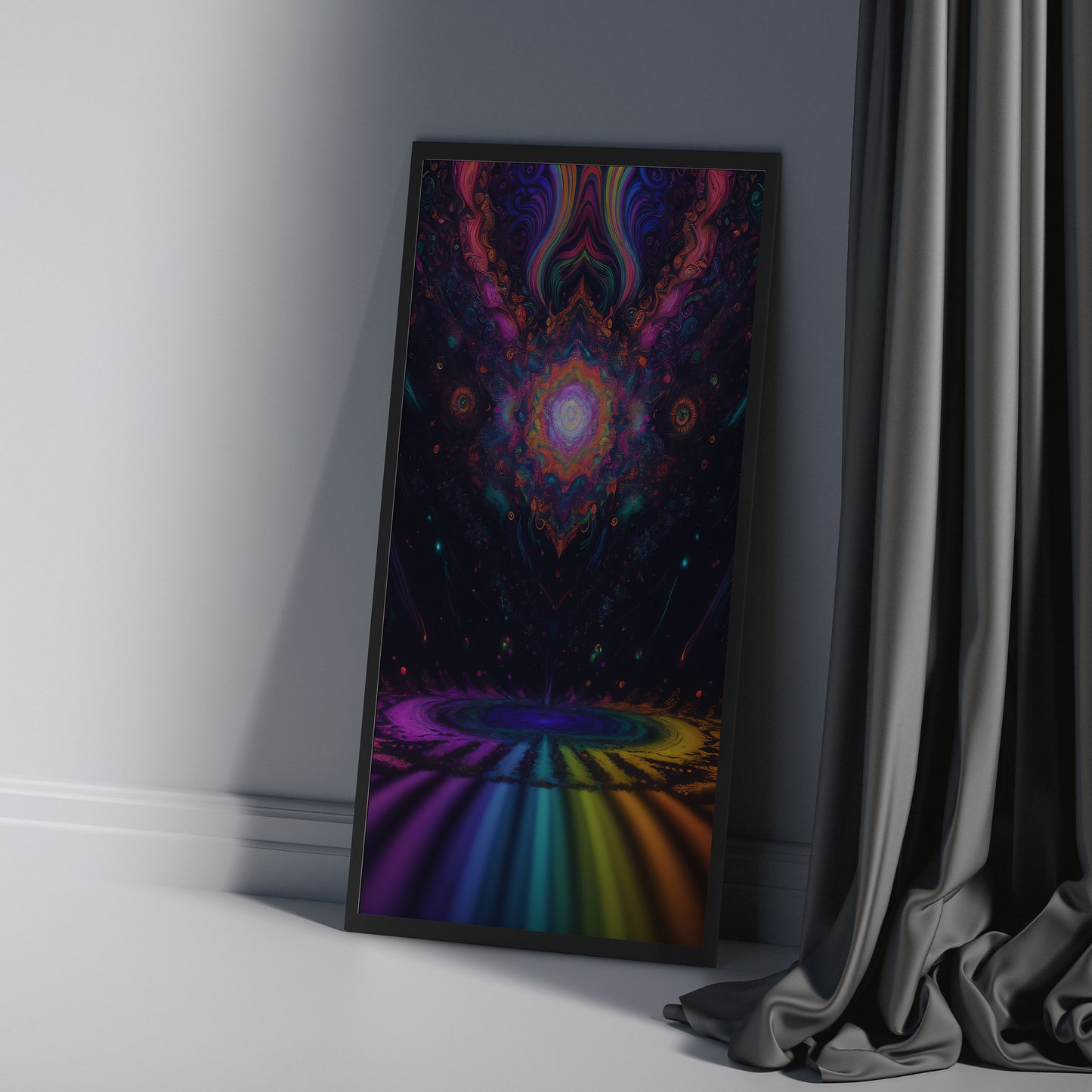 A radiant cosmic gateway of swirling color draws the eye toward a luminous heart of light. The outer layers ripple with waves of violet, gold, and green, forming a celestial tree of life.
