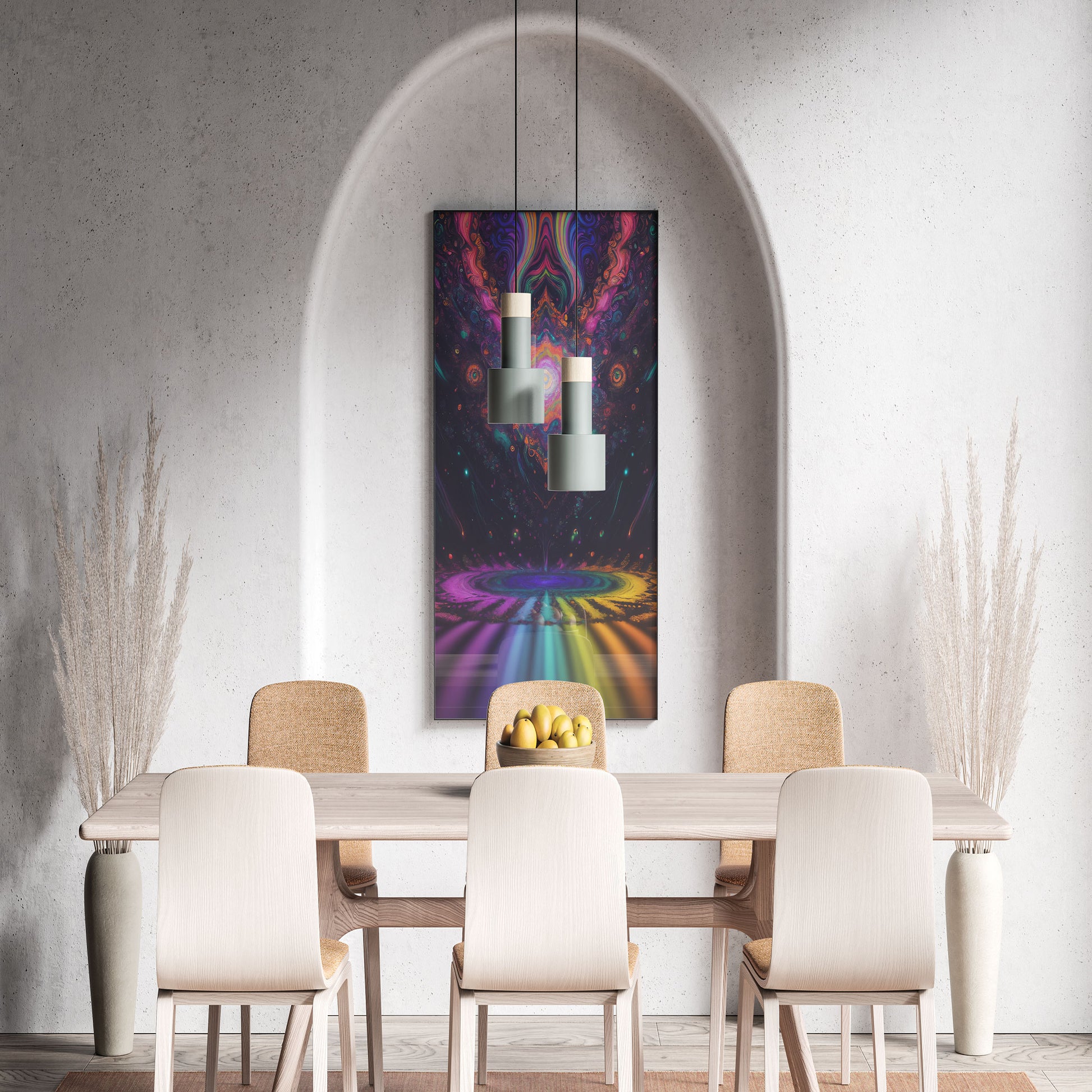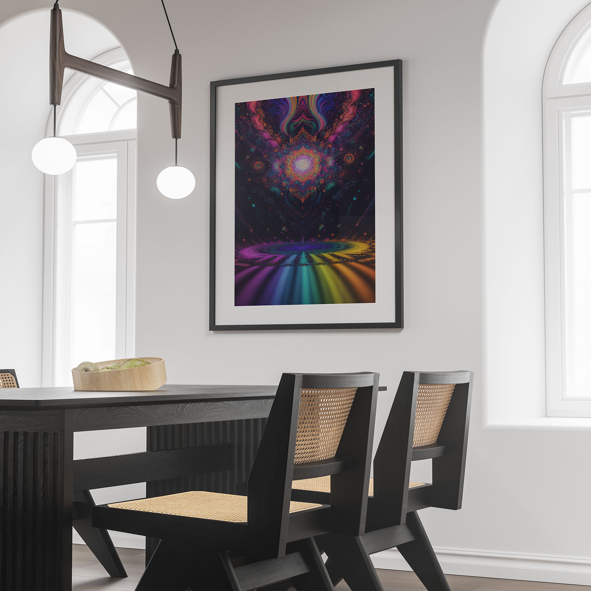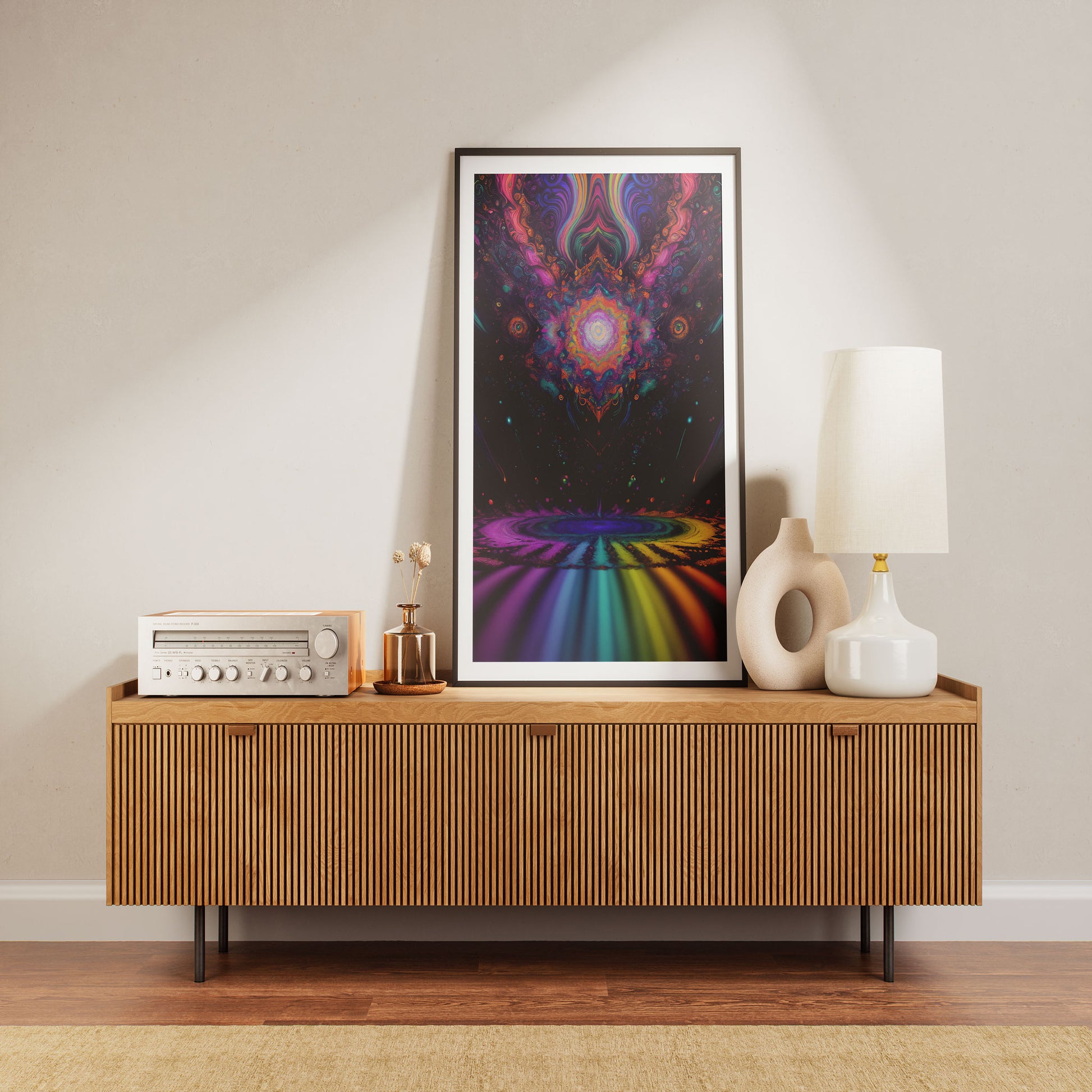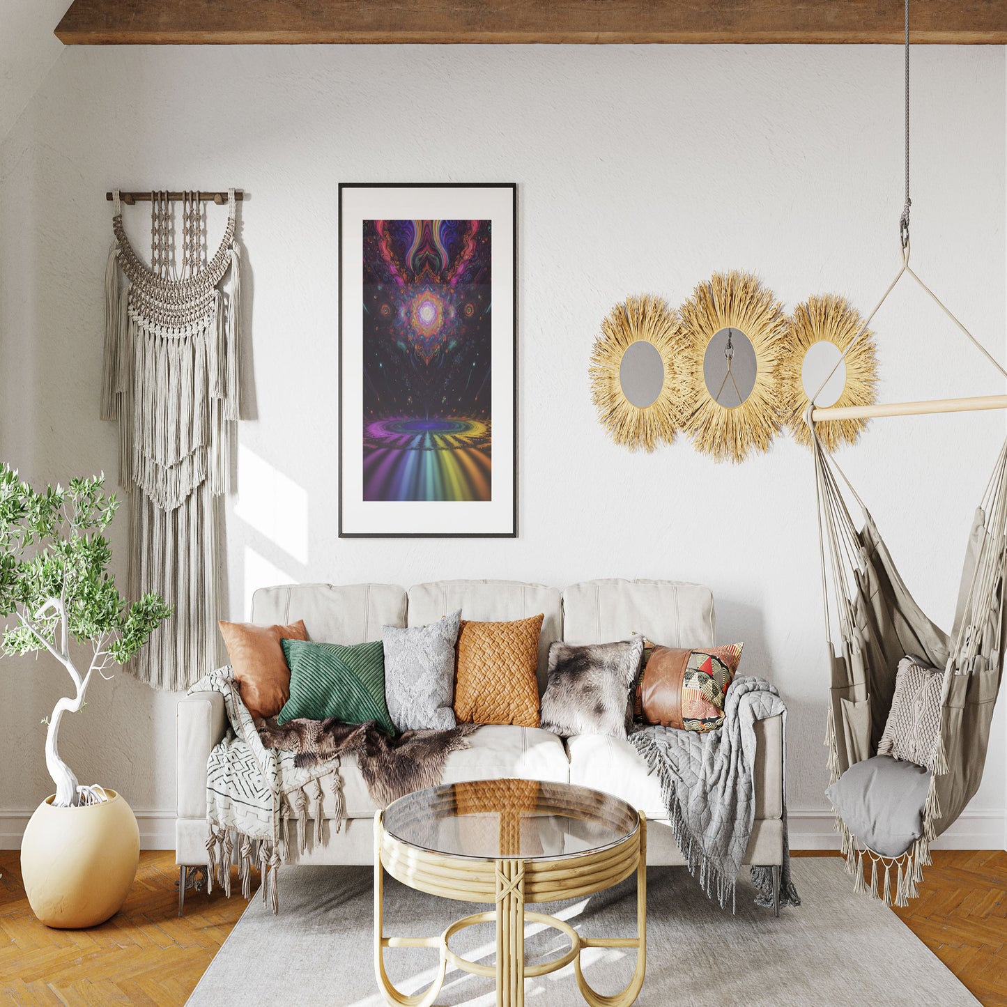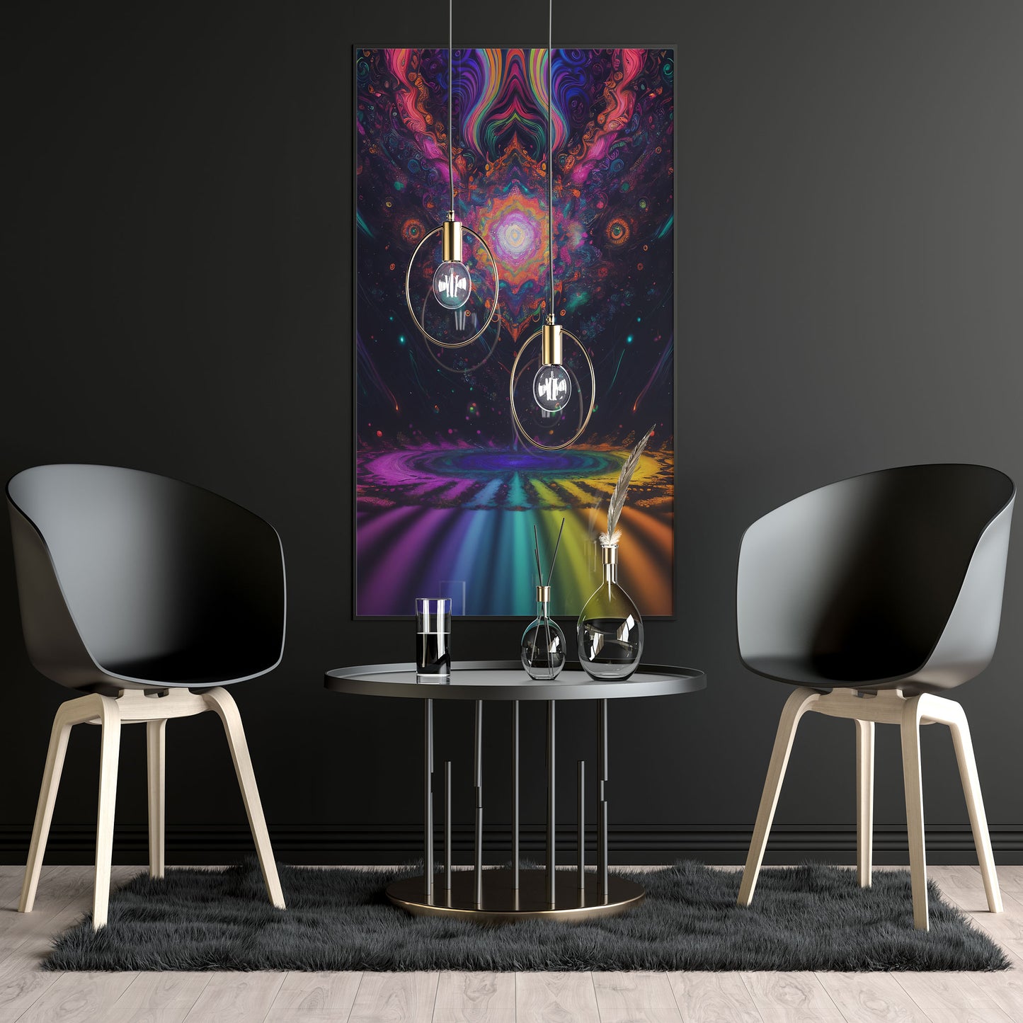A radiant cosmic gateway of swirling color draws the eye toward a luminous heart of light. The outer layers ripple with waves of violet, gold, and green, forming a celestial tree of life.
