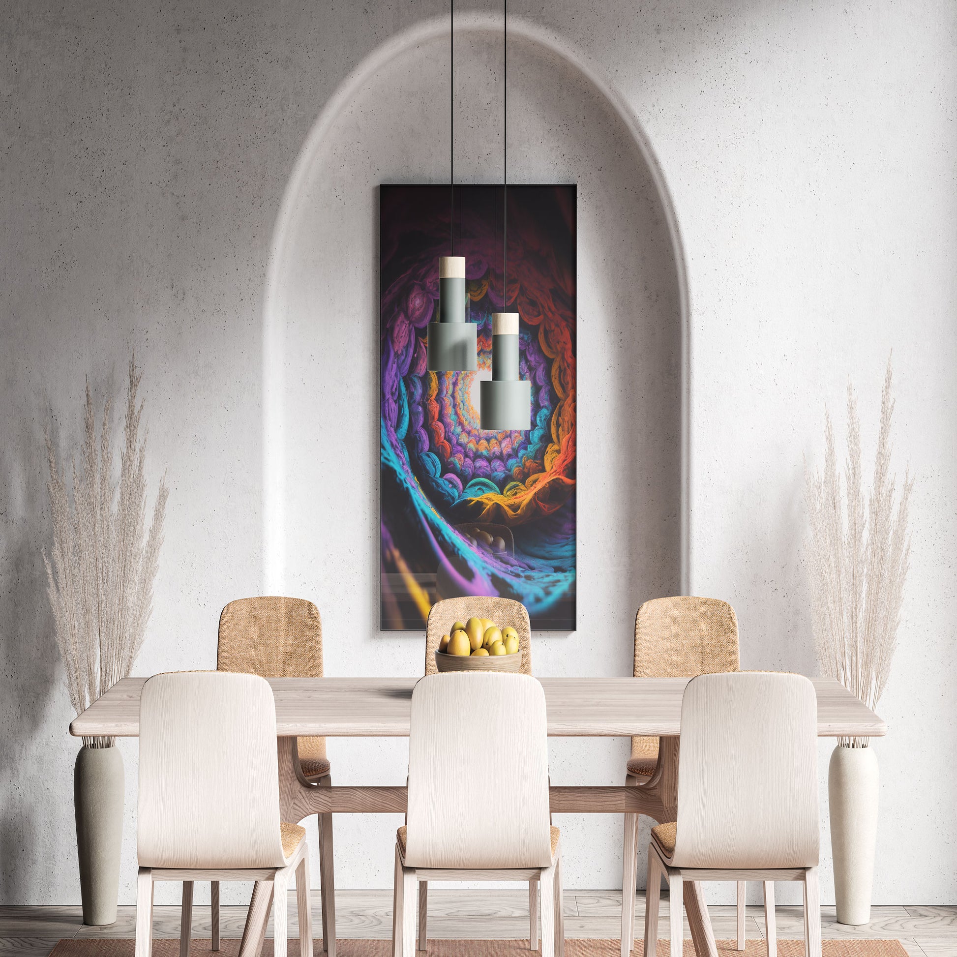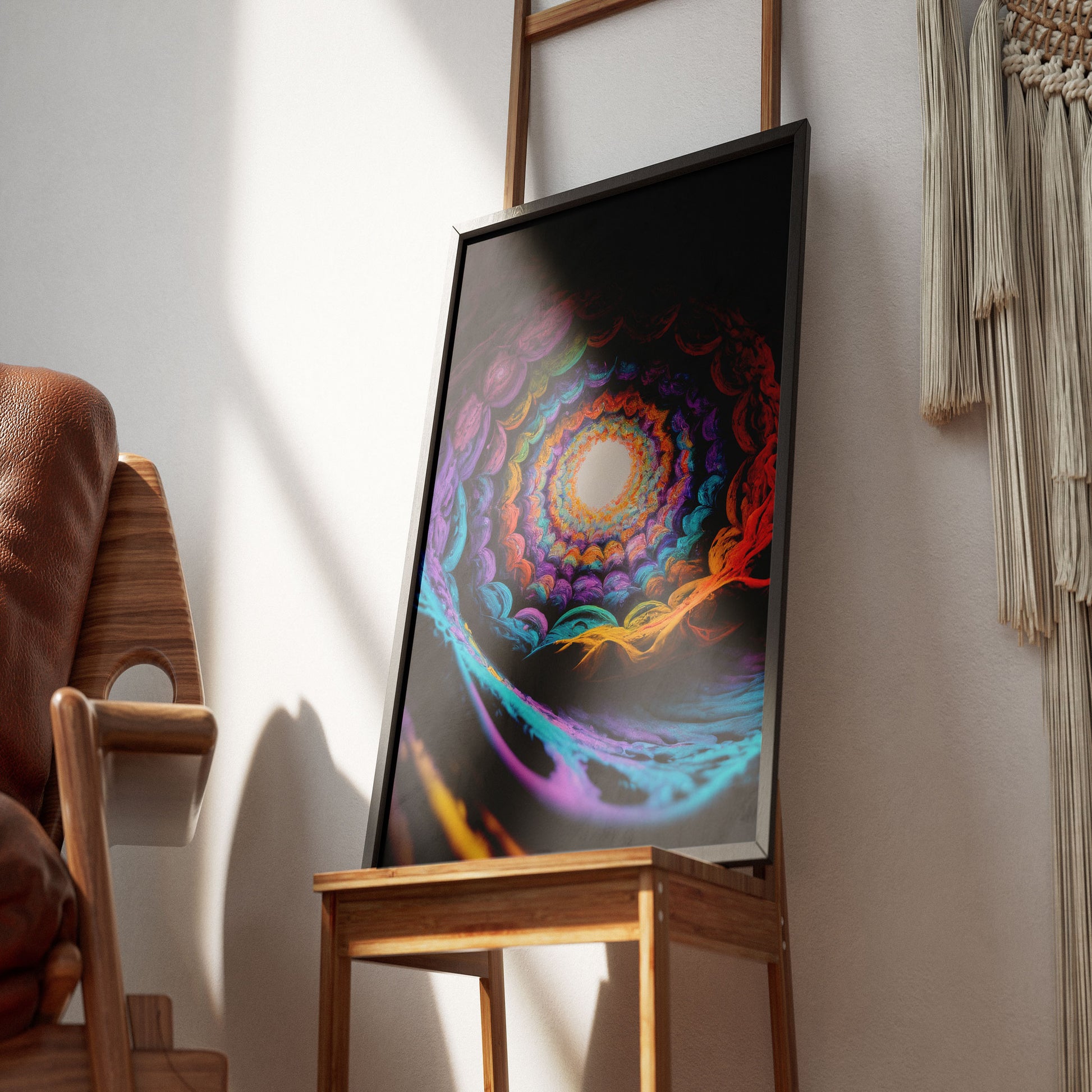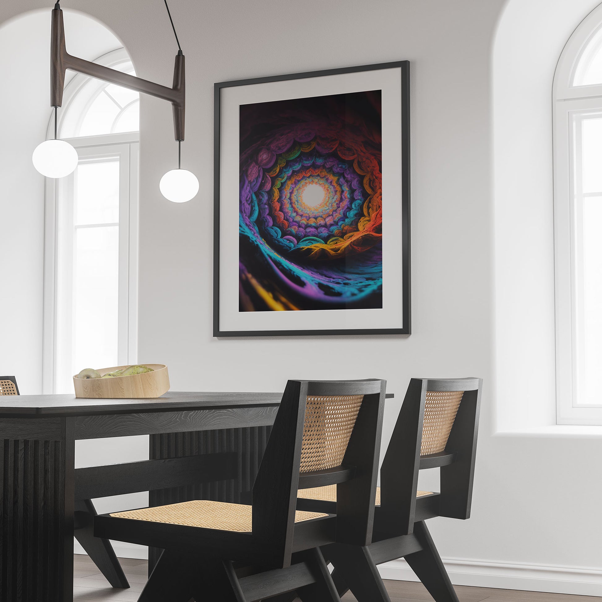 This stunning tunnel of cosmic waves spirals inward, glowing with rainbow fractals of light. The gradients of pink, blue, and gold evoke a dreamlike journey through an infinite portal of color.