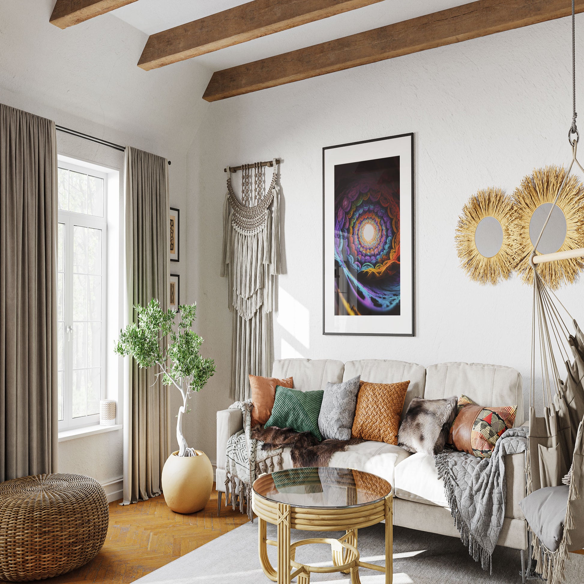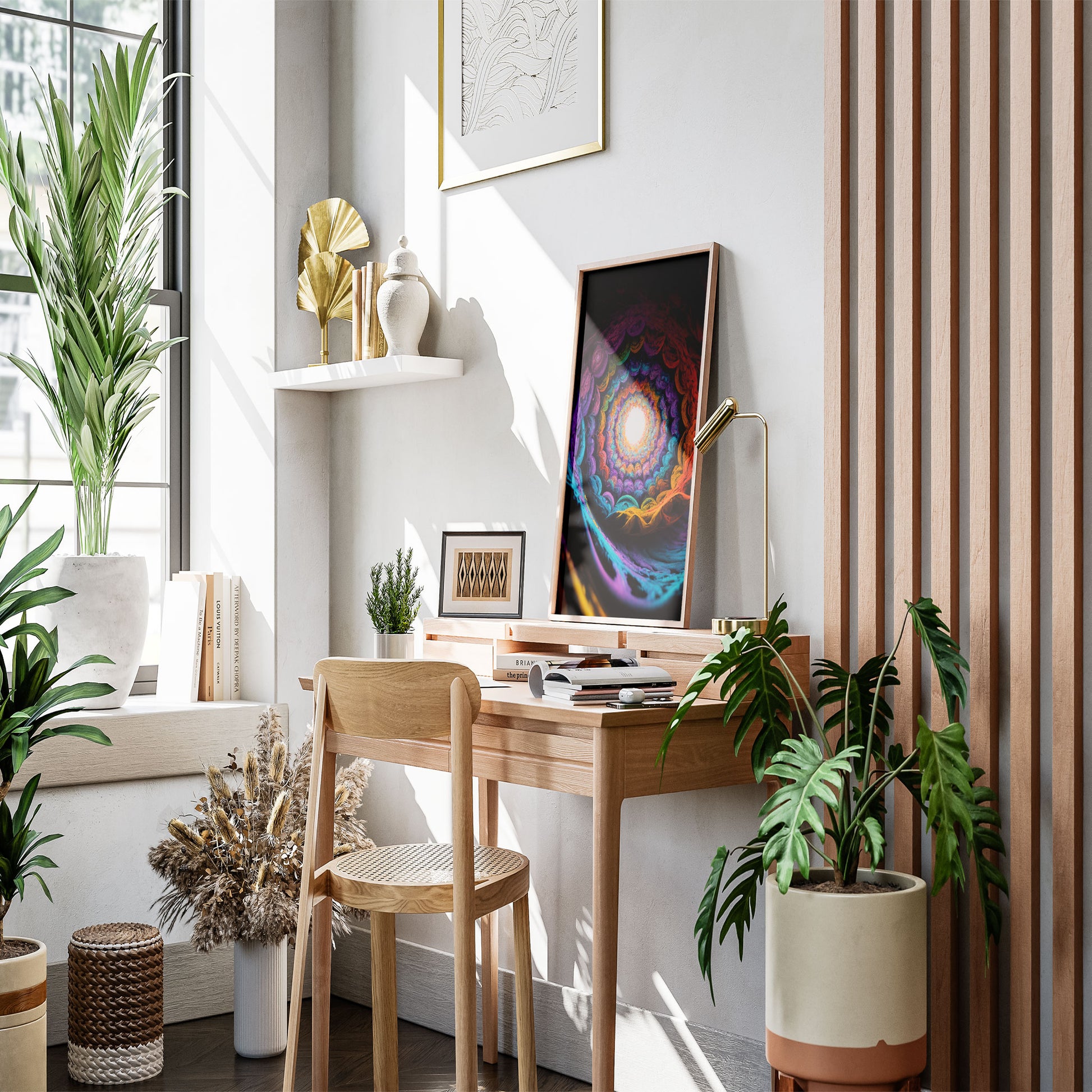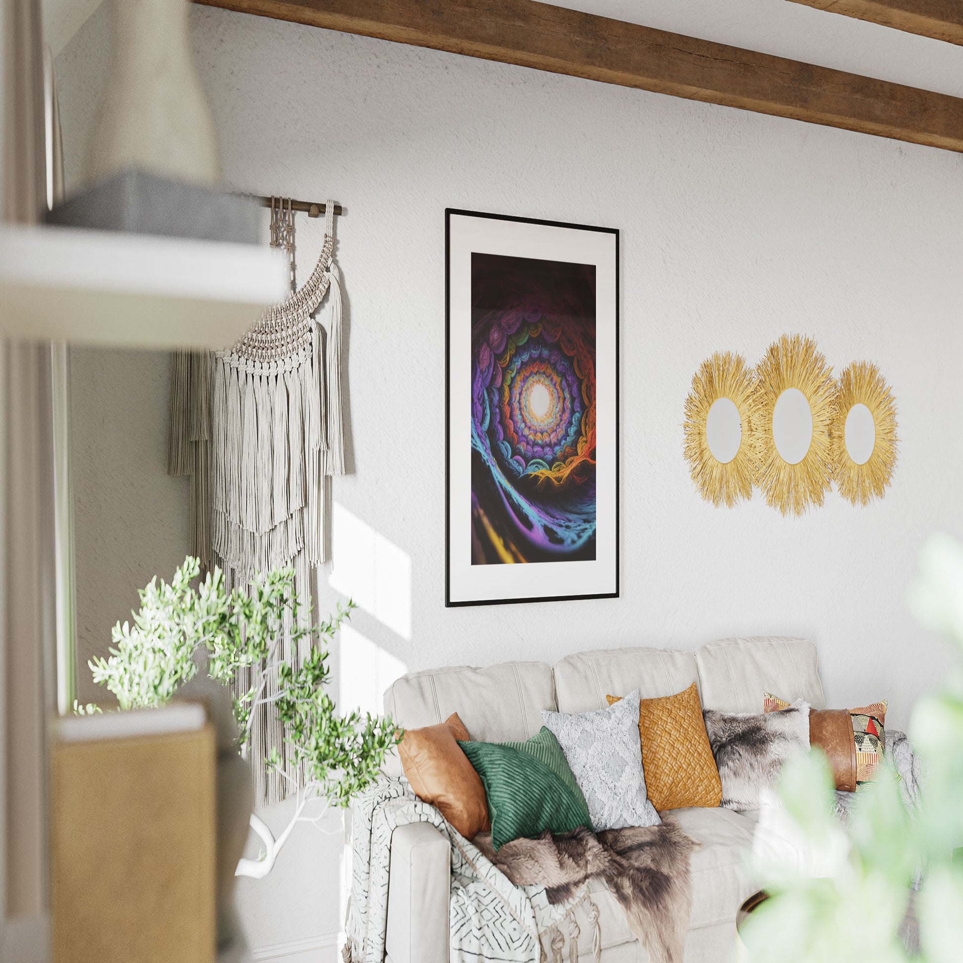 This stunning tunnel of cosmic waves spirals inward, glowing with rainbow fractals of light. The gradients of pink, blue, and gold evoke a dreamlike journey through an infinite portal of color.