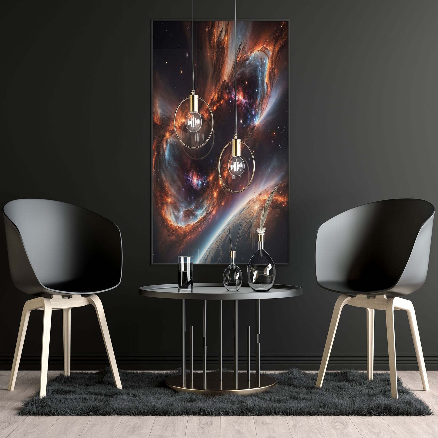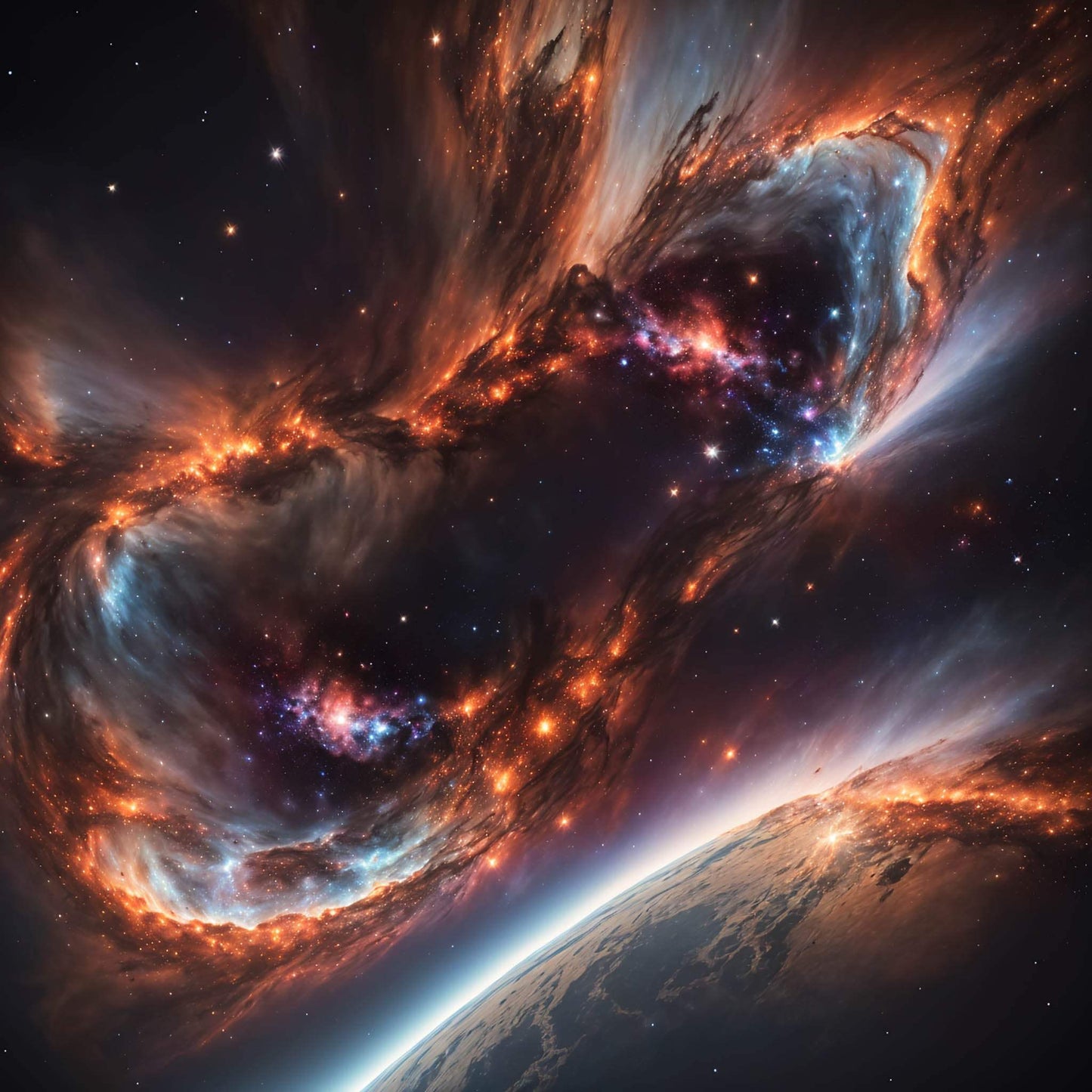 Feel the energy of the cosmos as twin interstellar waves swirl in fiery reds and galactic blues, orbiting a distant world. A breathtaking depiction of cosmic balance and intensity.