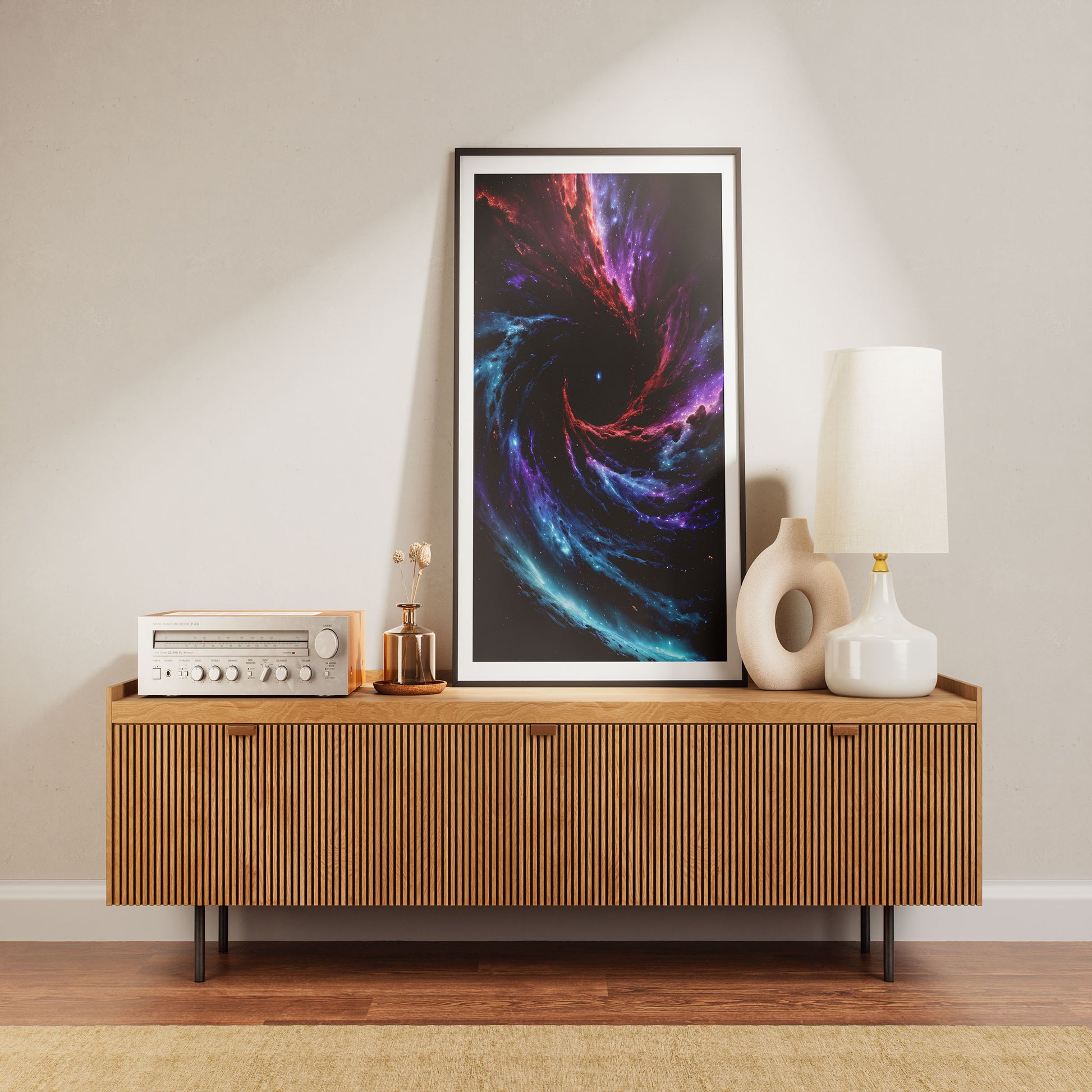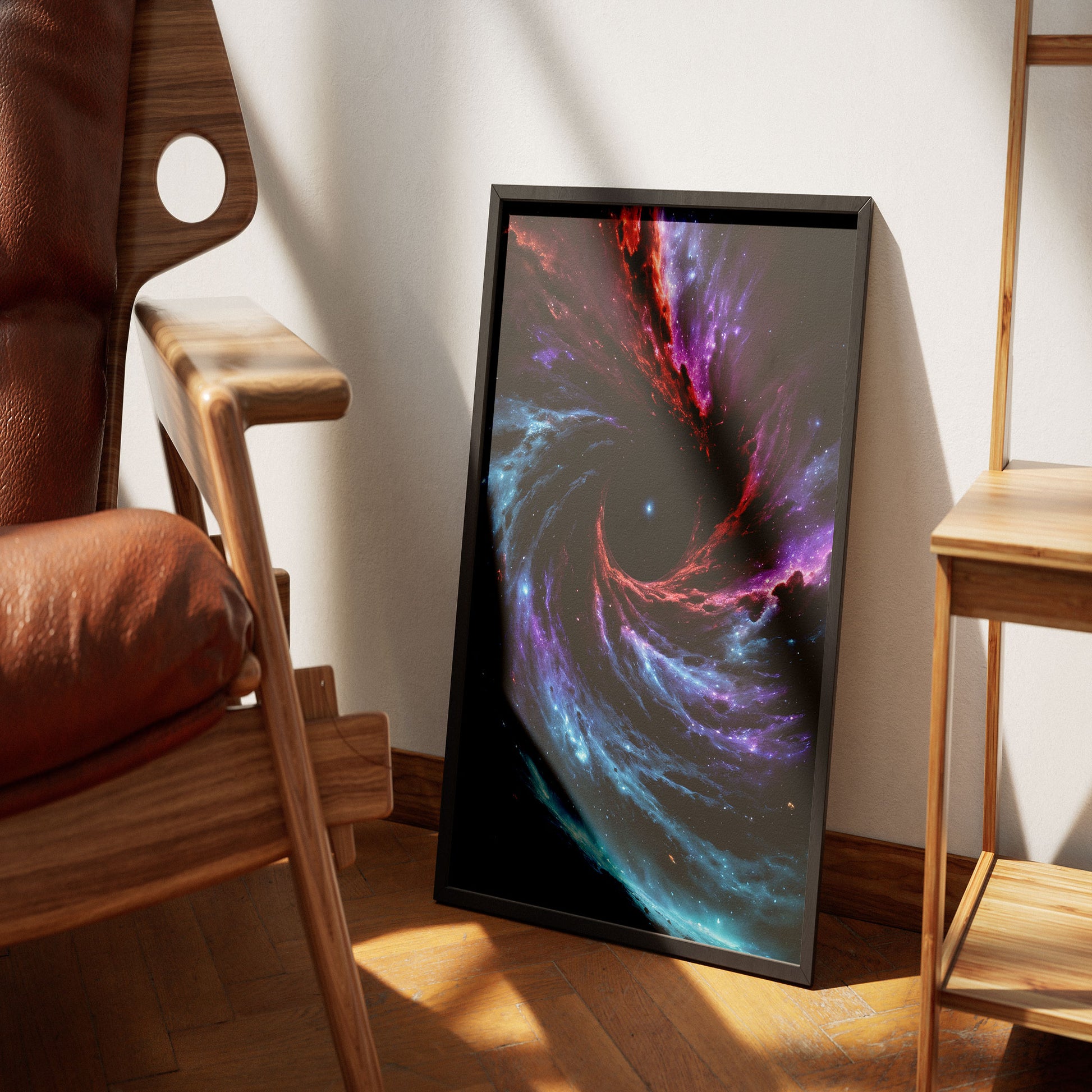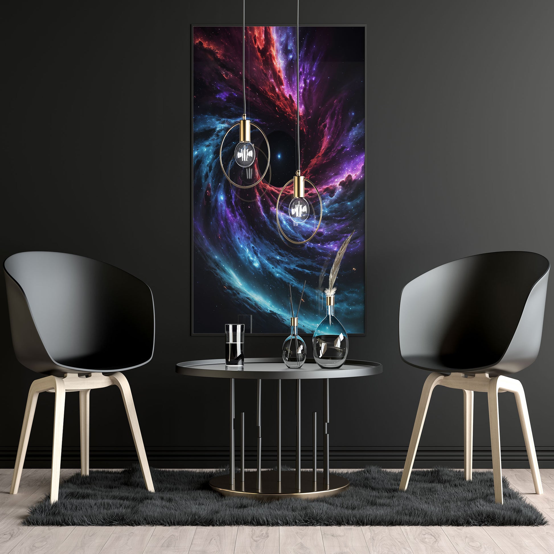 A spiraling vortex of deep crimson and cerulean hues, swirling like an eternal cosmic dance, pulling you into the heart of the universe’s mysteries.