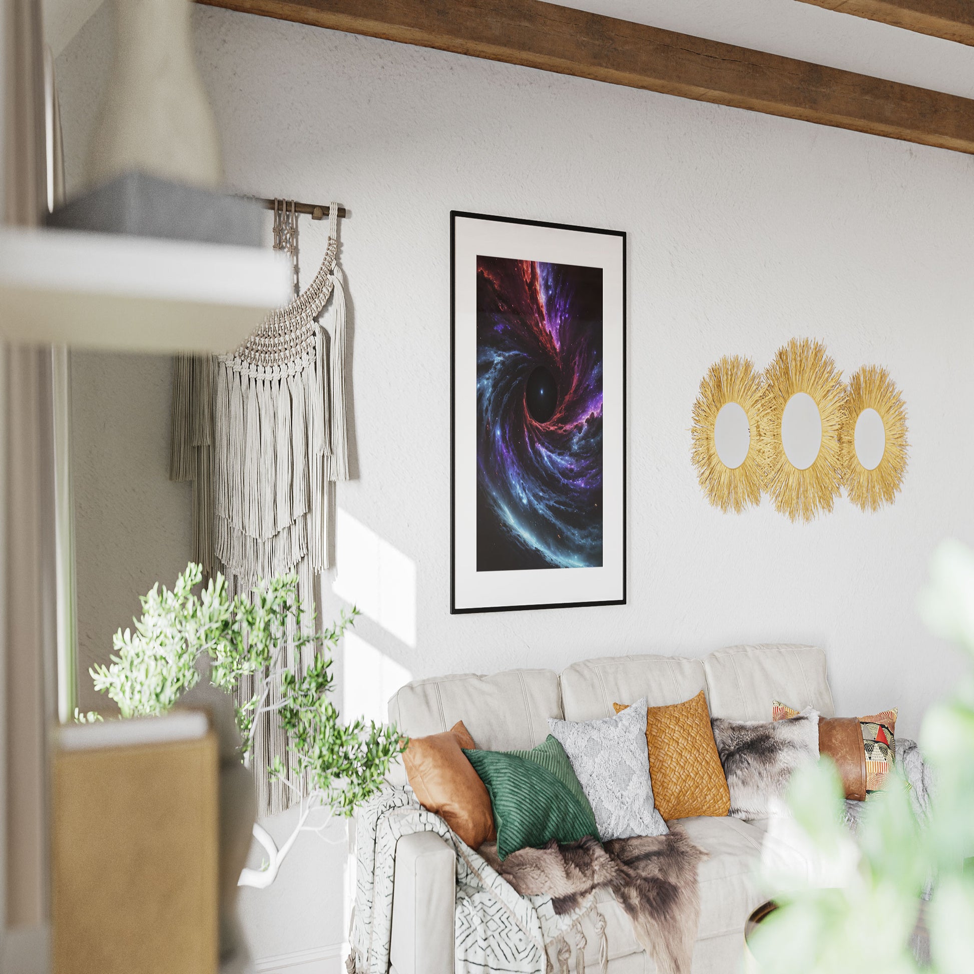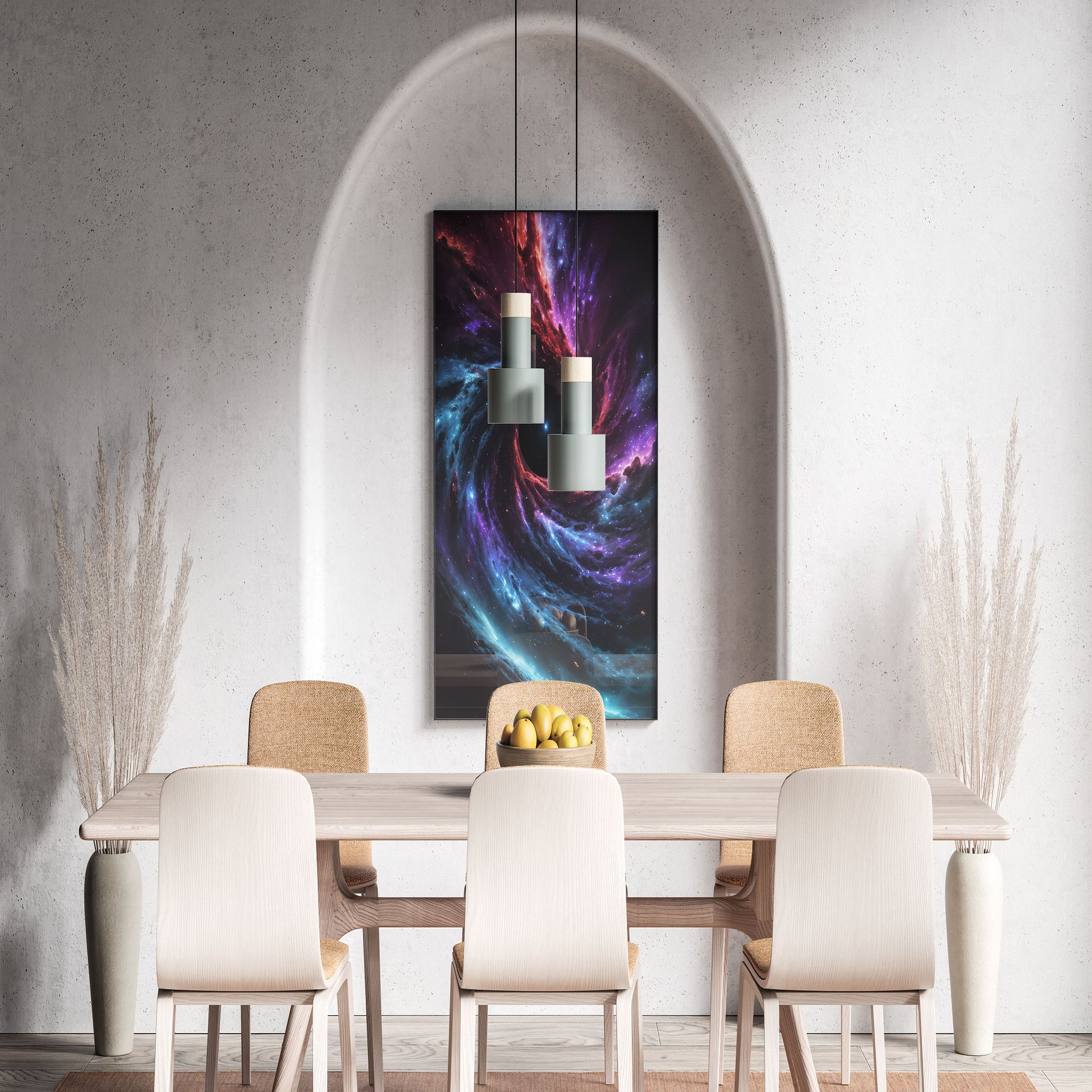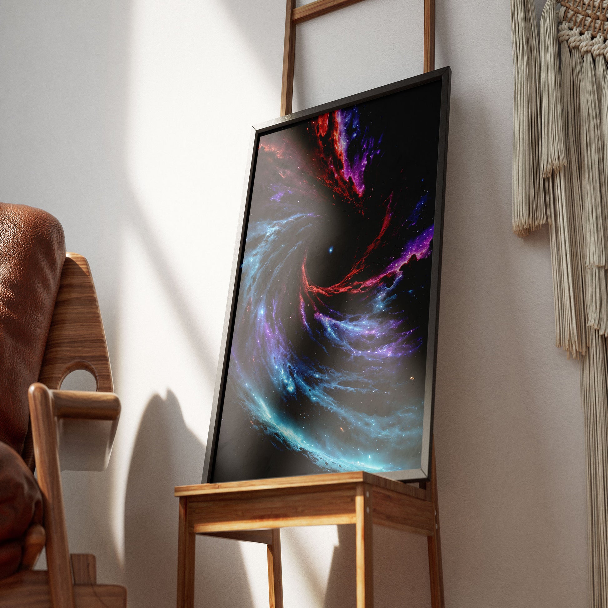 A spiraling vortex of deep crimson and cerulean hues, swirling like an eternal cosmic dance, pulling you into the heart of the universe’s mysteries.