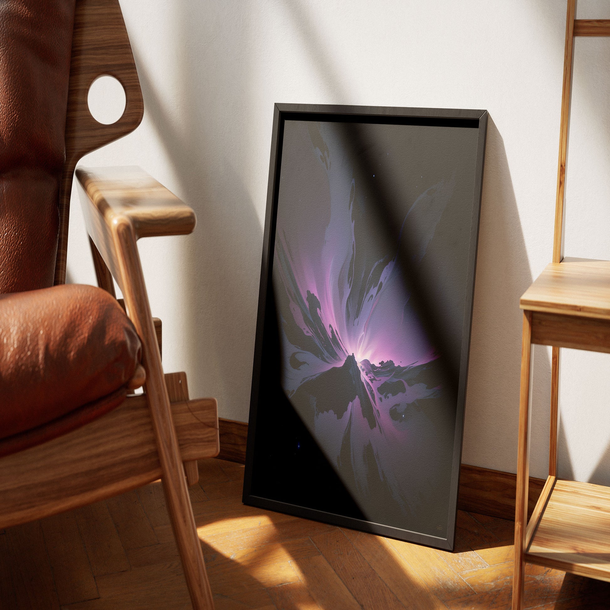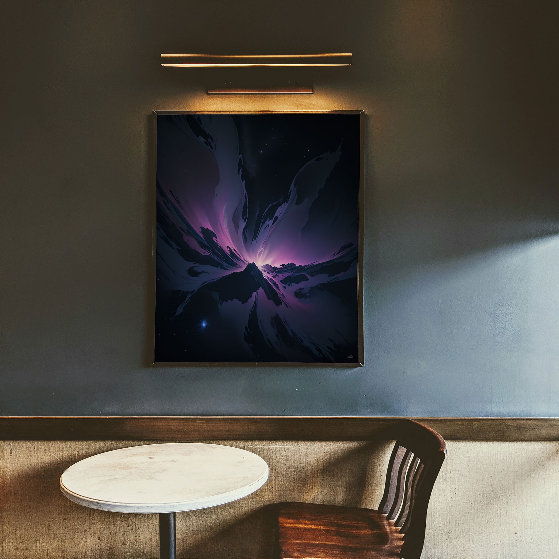 A breathtaking explosion of cosmic splendor, where delicate shades of orchid pink and midnight blue radiate outward. The contrast between shadowy voids and glowing nebulae evokes a sense of creation in motion.