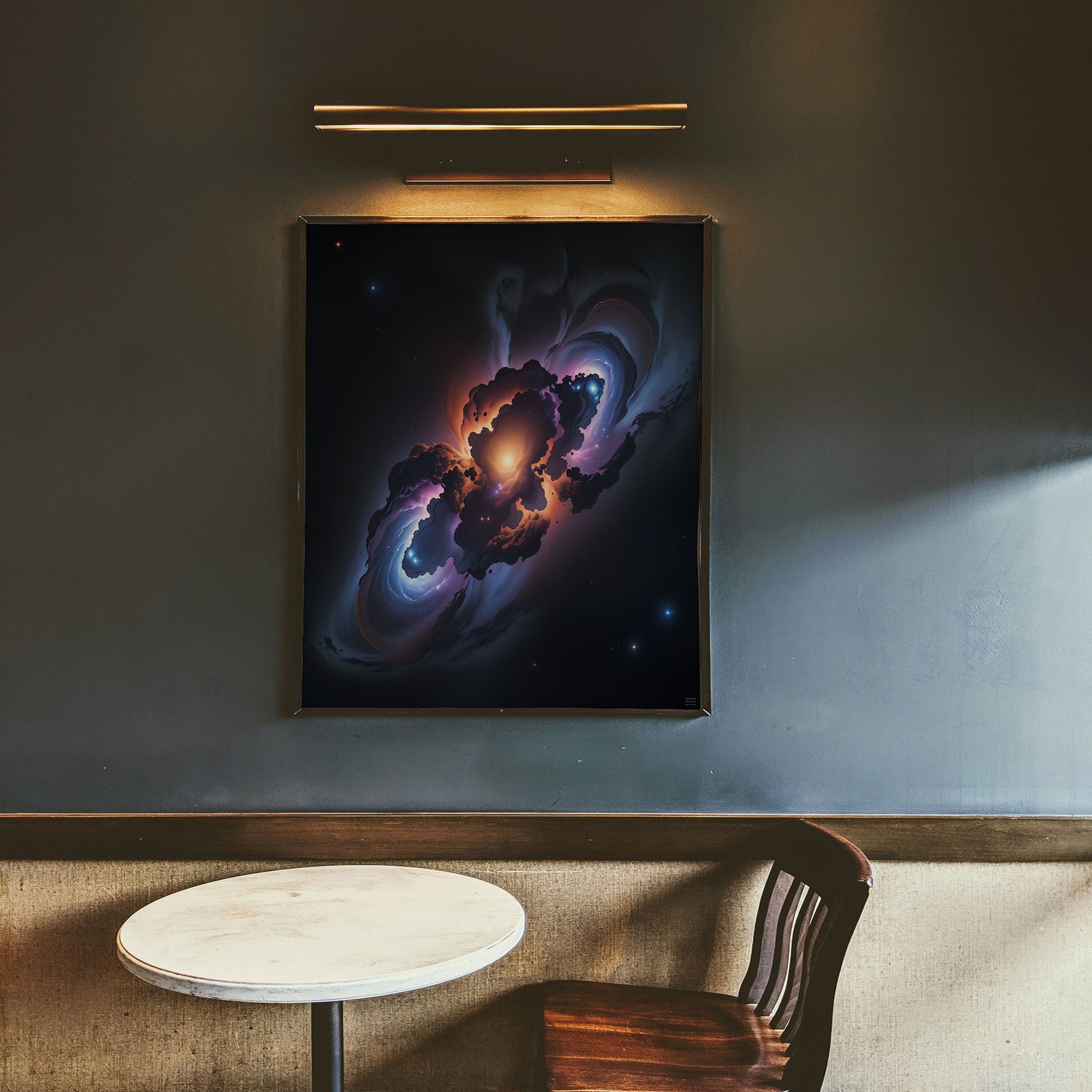 A celestial storm of cosmic dust and gas forms a radiant cloud, illuminated by a molten-gold center. The surrounding vortex of soft blues and purples creates a sense of tranquility within the chaos of the universe.