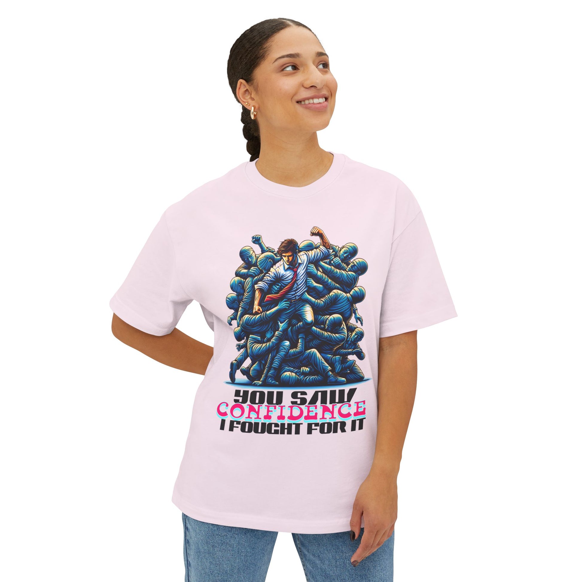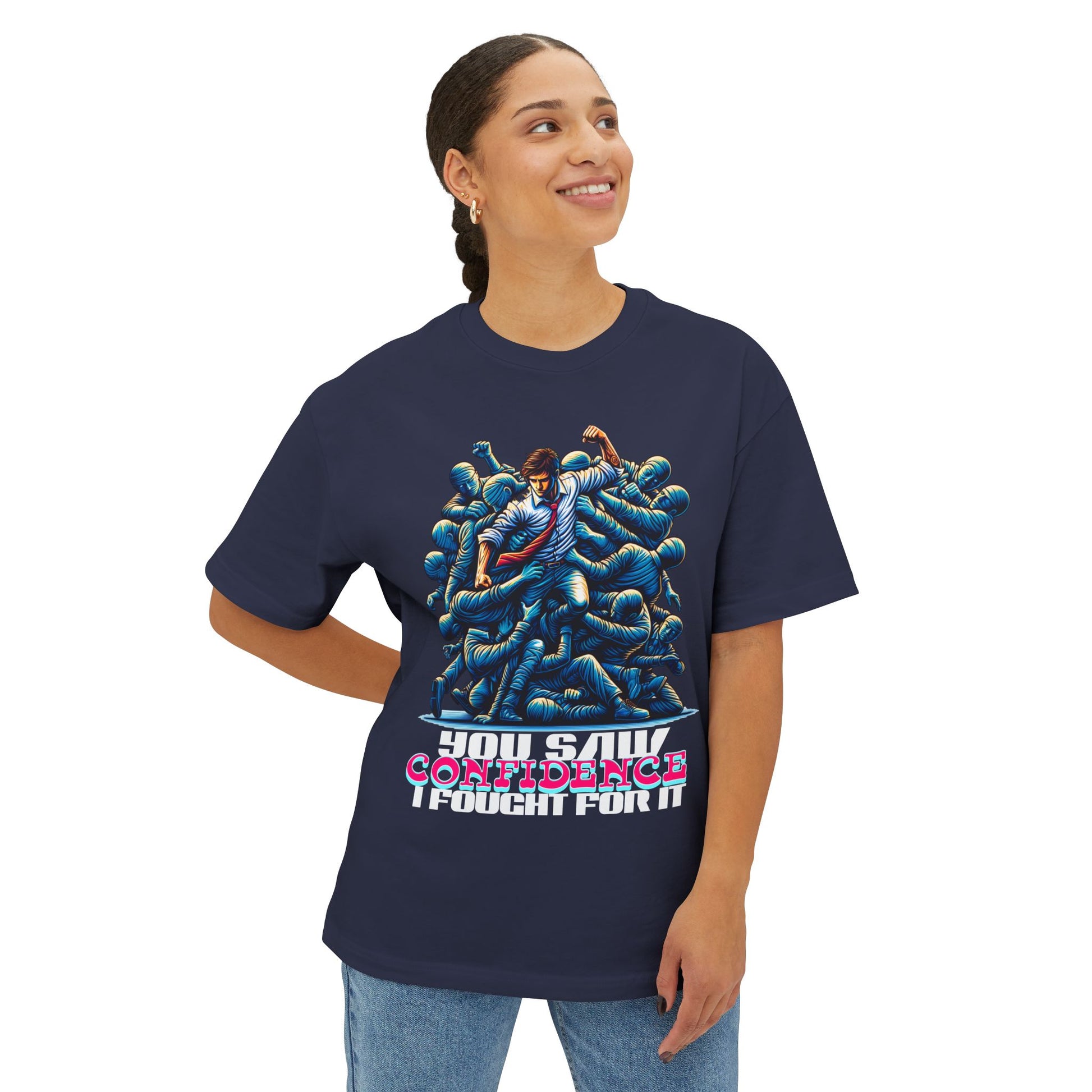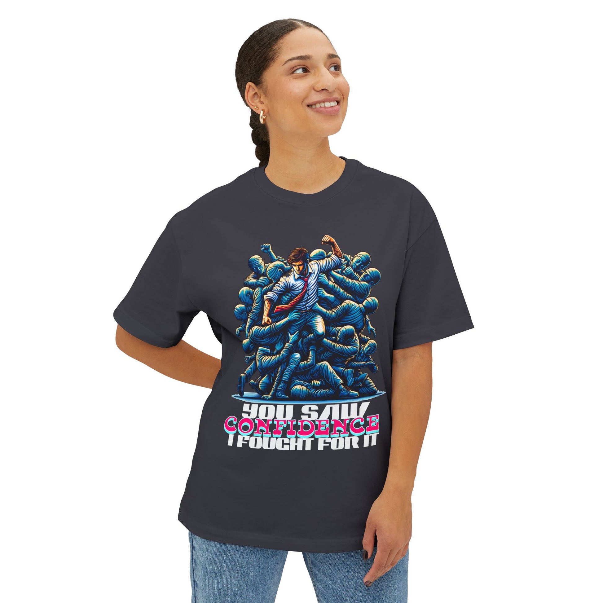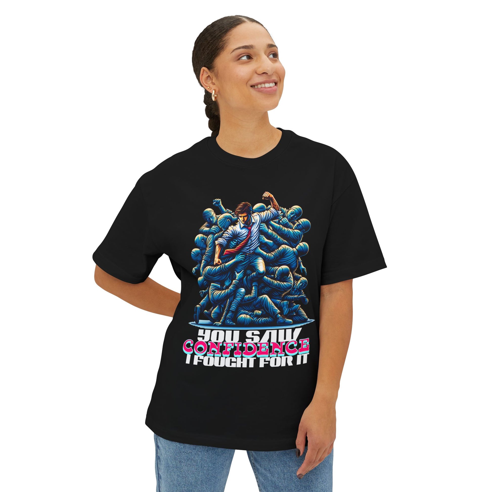 Confidence isn’t given—it’s earned. This oversized tee celebrates your hard-won self-assurance with a message that inspires others to fight for theirs.
