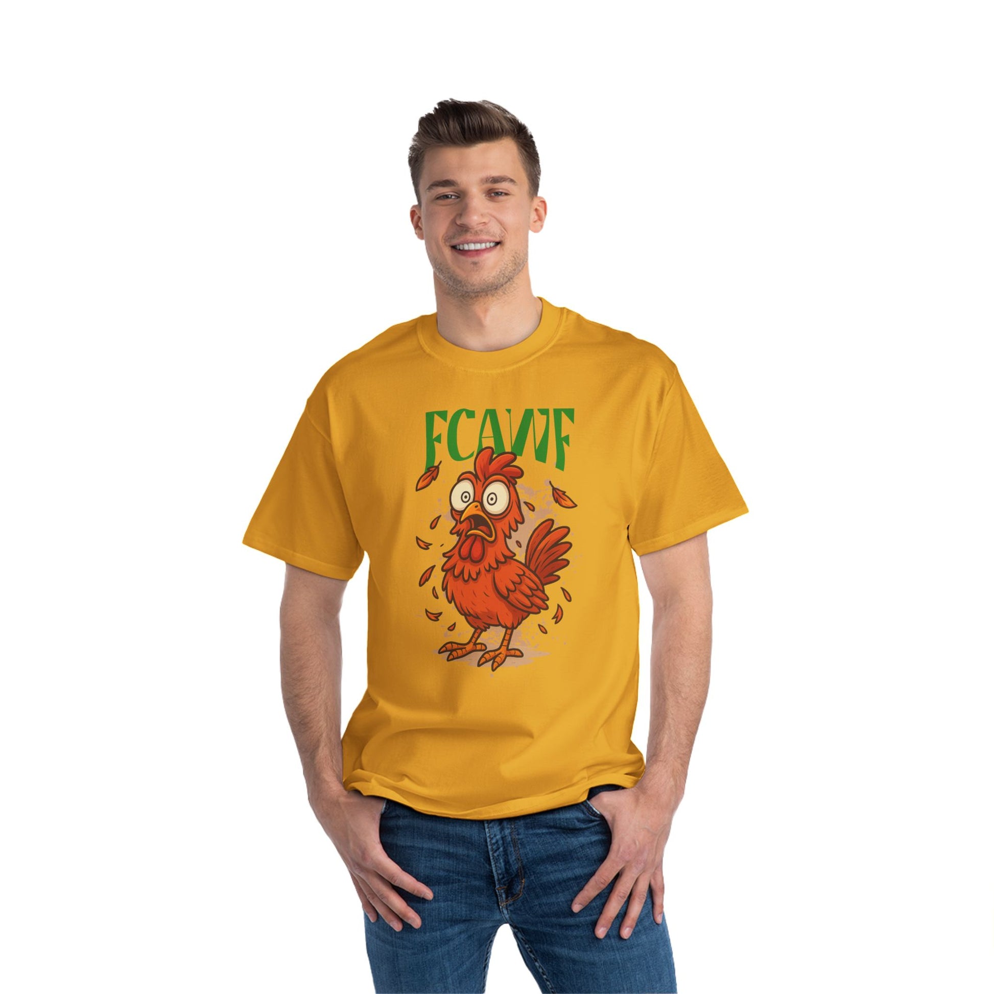 Turn heads and crack laughs with this funny oversized chicken t-shirt featuring a cartoon-style shocked chicken print and bold FCAWF graphic. Perfect for streetwear lovers, meme fans, and anyone who wants an oversized tee with premium quality.