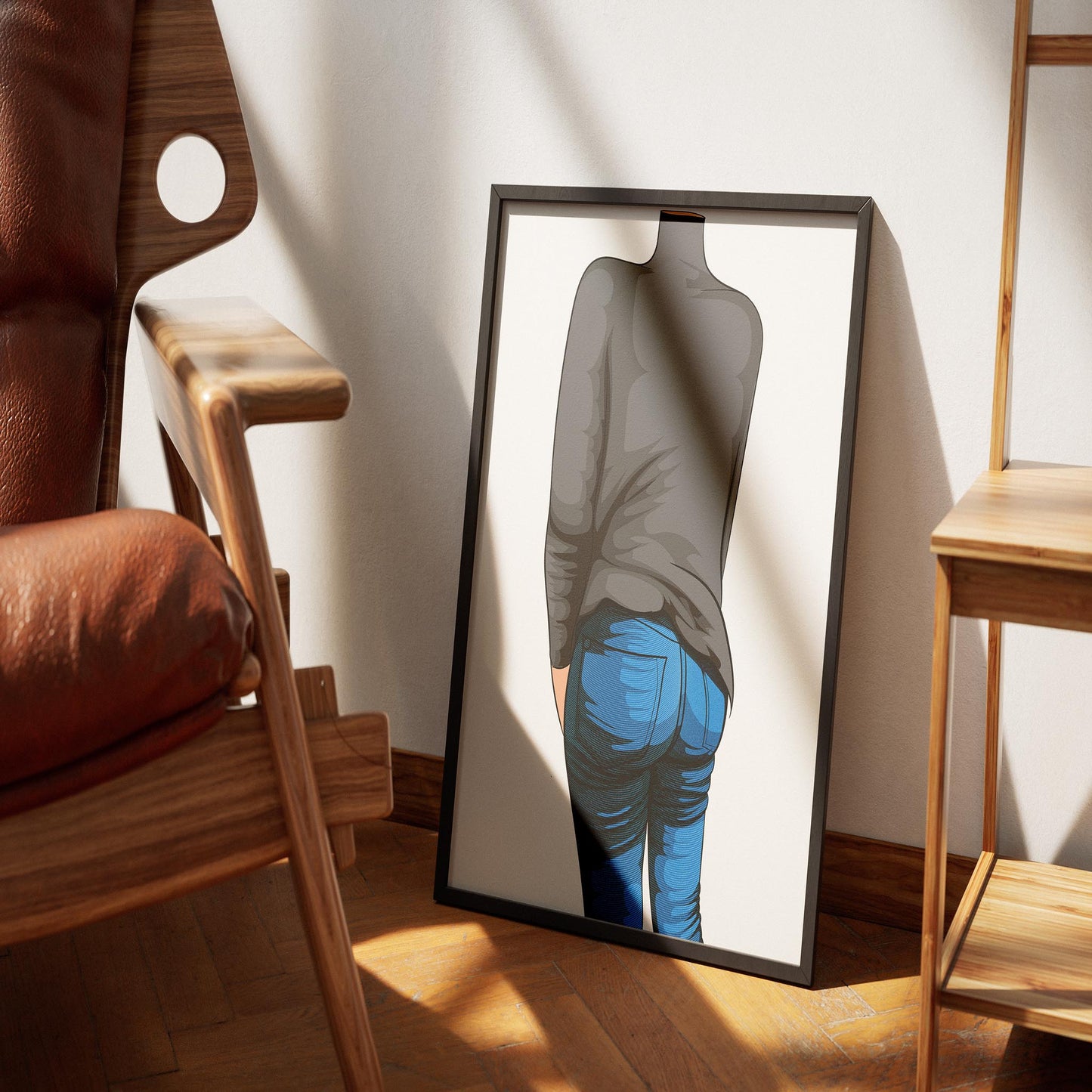 This illustration presents a chic combination of casual style and bold denim, emphasizing the fine details and texture of the jeans. Jeans Denim - Baked Model Art 20. The blue jeans stand out with their vivid shading and detailed line work, adding depth and realism to the denim fabric, while the gray turtleneck top complements the overall look with a sleek, minimalist appeal.