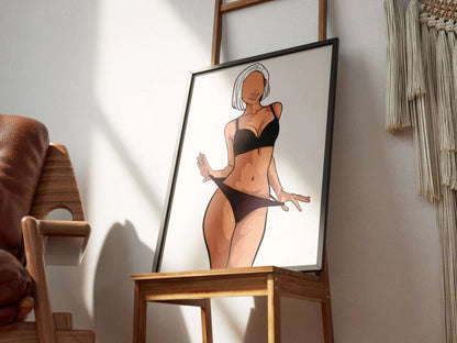 This sleek and modern digital artwork showcases a confident figure in minimalist attire, highlighted by bold lines and a striking pose. The neutral color palette enhances the form, creating a balanced yet captivating aesthetic. Buyers will receive a high-quality image and an editable Adobe Illustrator project file, perfect for personal or commercial projects. Model 38 - Baked Art. Available for instant download upon purchase.