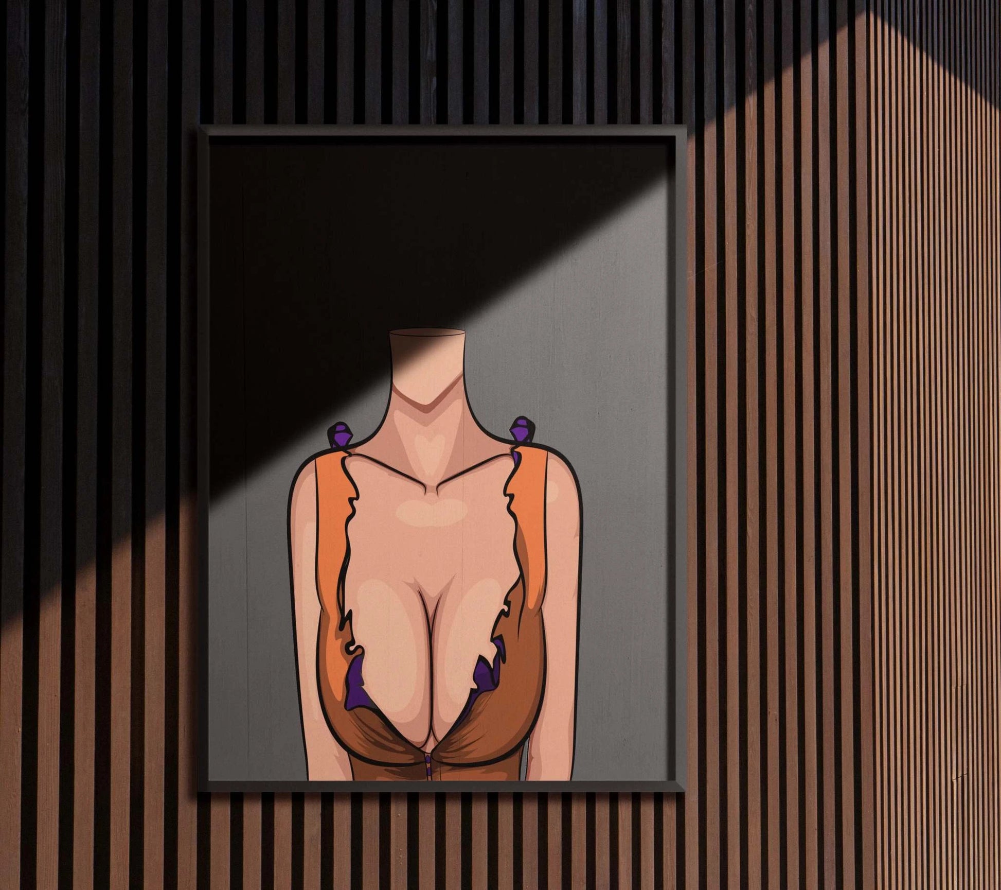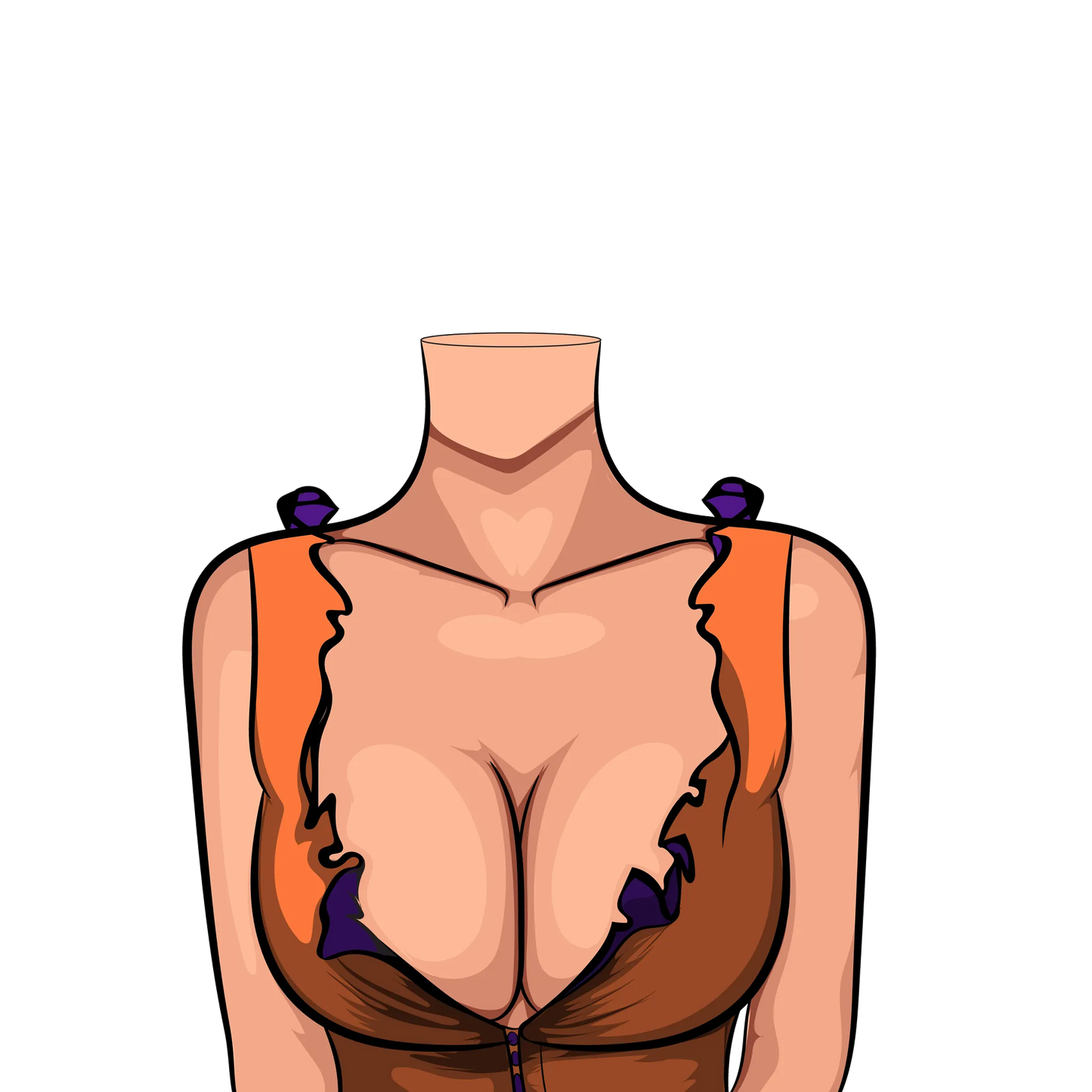 This artwork depicts a figure wearing a ruffled, low-cut top in shades of orange and brown with purple accents. The detailing on the straps and neckline, with ruffles and bold color contrasts, adds visual interest and depth. The style highlights simple, clean lines and smooth shading that emphasize the curves of the figure, making it unique. The heart-shaped highlight near the collarbone, a signature feature adds a playful touch to the overall aesthetic. This design would appeal to those looking for fashionable, stylized characters in digital art. Whether for art collectors or casual viewers, it catches the eye with its unique color choices and detailed textures. Those who appreciate vibrant yet subtle digital art will find this especially captivating.