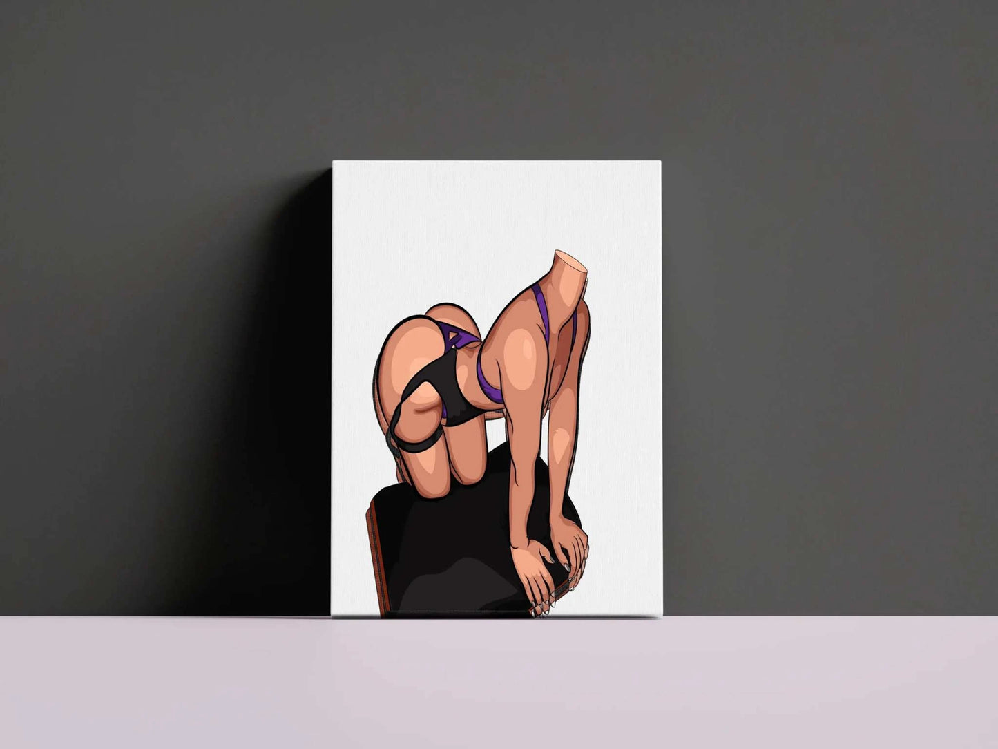 This illustration features a figure in a dynamic, poised position, emphasizing both strength and flexibility. The choice of a purple and black outfit highlights the curvature and the flow of the figure, while the perspective and pose suggest movement and balance. The black surface underneath adds an additional element of depth and grounding to the composition, making the scene feel tangible. The shading and highlights give the figure a smooth and polished look, enhancing the muscular definition and anatomical accuracy. The style is clean and crisp, using minimal lines to focus on form and shape.