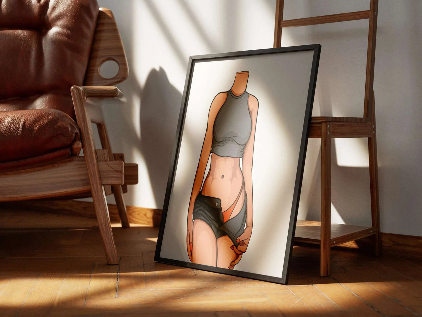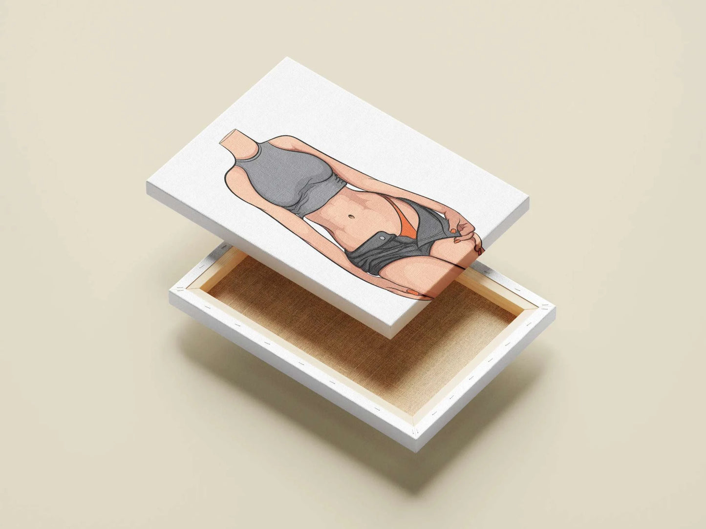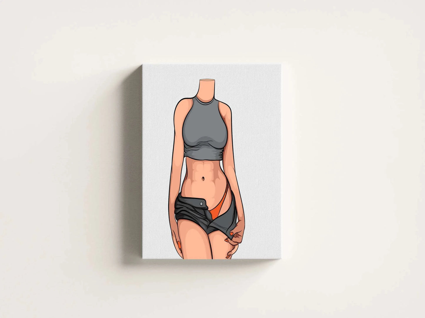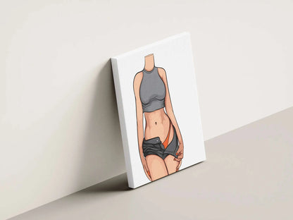 The illustration depicts a stylized figure wearing a fitted sleeveless grey crop top and shorts, with the shorts slightly pulled down, revealing an orange bikini bottom underneath. The clean lines, subtle shading, and vibrant contrast between the neutral grey tones and the bright orange details create a striking visual. The pose suggests a casual, confident stance, and the attention to detail in the figure's musculature adds a sense of realism while maintaining the overall stylized aesthetic. This piece seems to focus on balance between minimalism and dynamic body form.