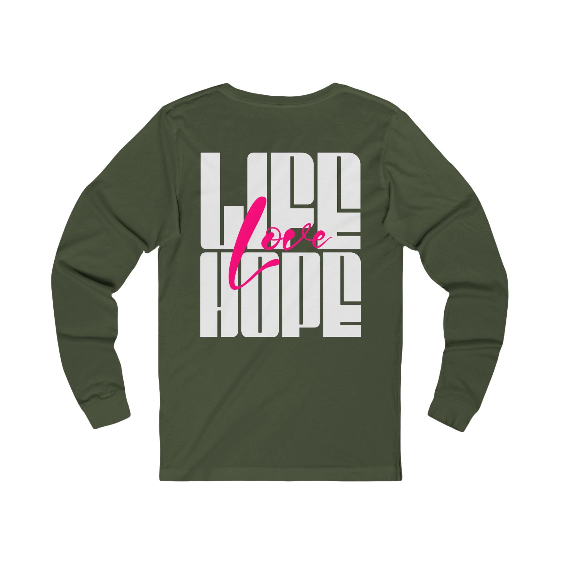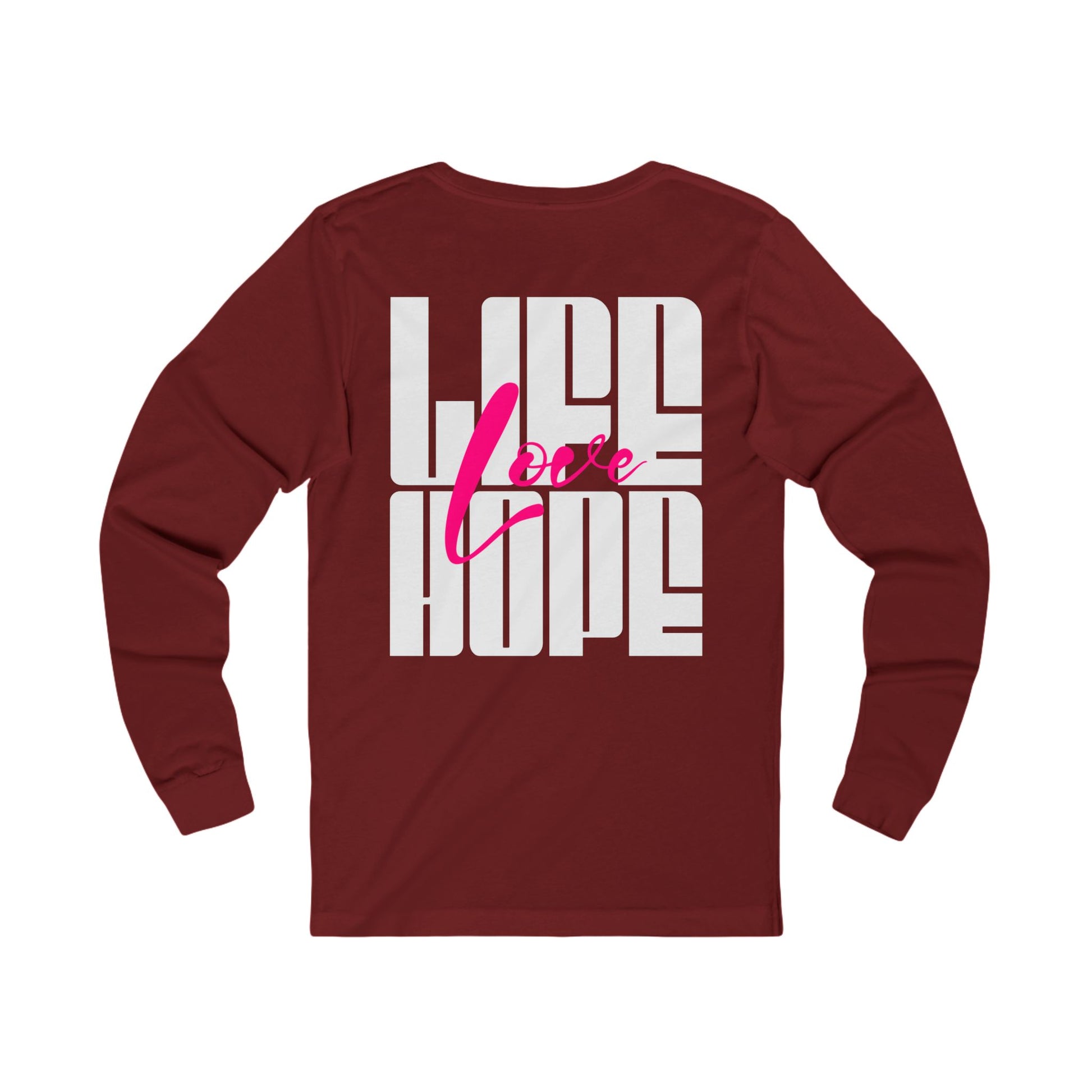 This Life Love Hope design on a Long Sleeve Tee exudes positivity and a sense of optimism. Perfect for those who value hope and love in their life. Ideal for casual wear or as a thoughtful gift for loved ones. Relevant for Valentine's Day, birthdays, and everyday wear.